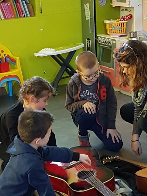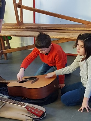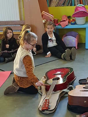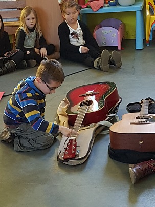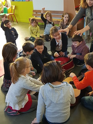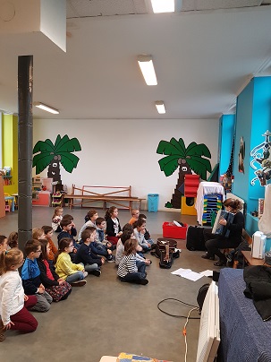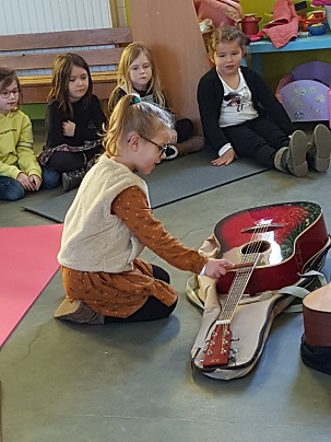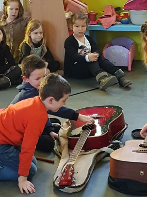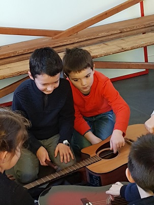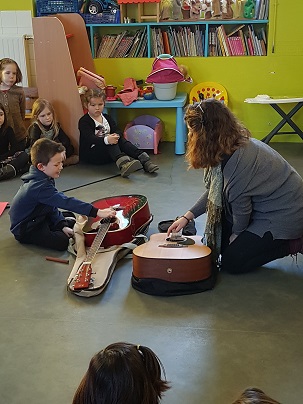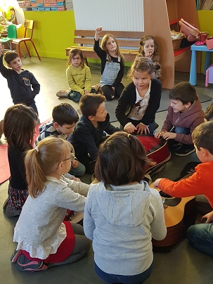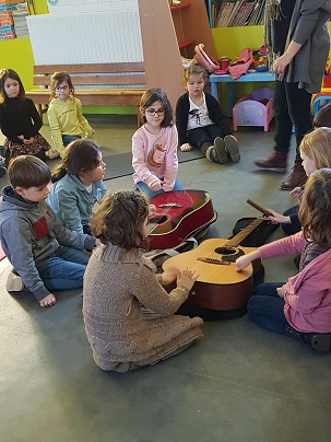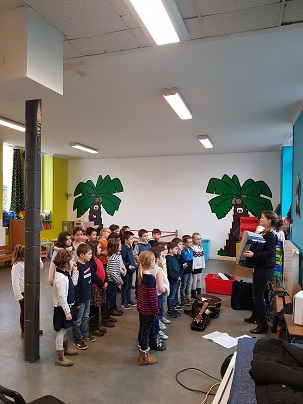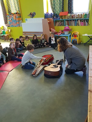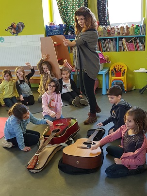 Tous les jeudis matins, depuis le mois de janvier, les enfants de CP-CE1 et CE1-CE2 découvrent des chansons et des instruments avec Laura, intervenante de Musique et Danse. Elle chante des chansons qui parlent d’émotions et joue de l’accordéon, de la guitare et de la flûte.