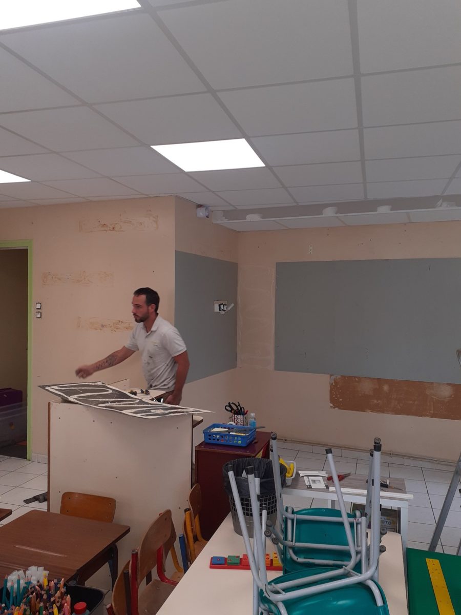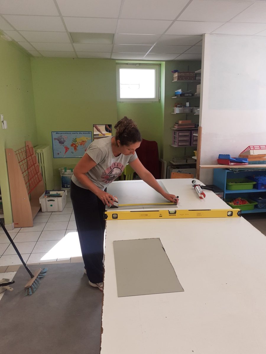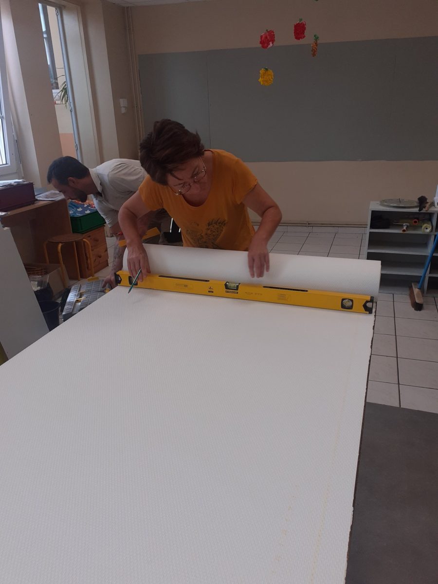 Des plaques aimantées ont été posées pour faciliter l’affichage des œuvres des enfants, puis de la fibre de verre et un coup de peinture blanche.