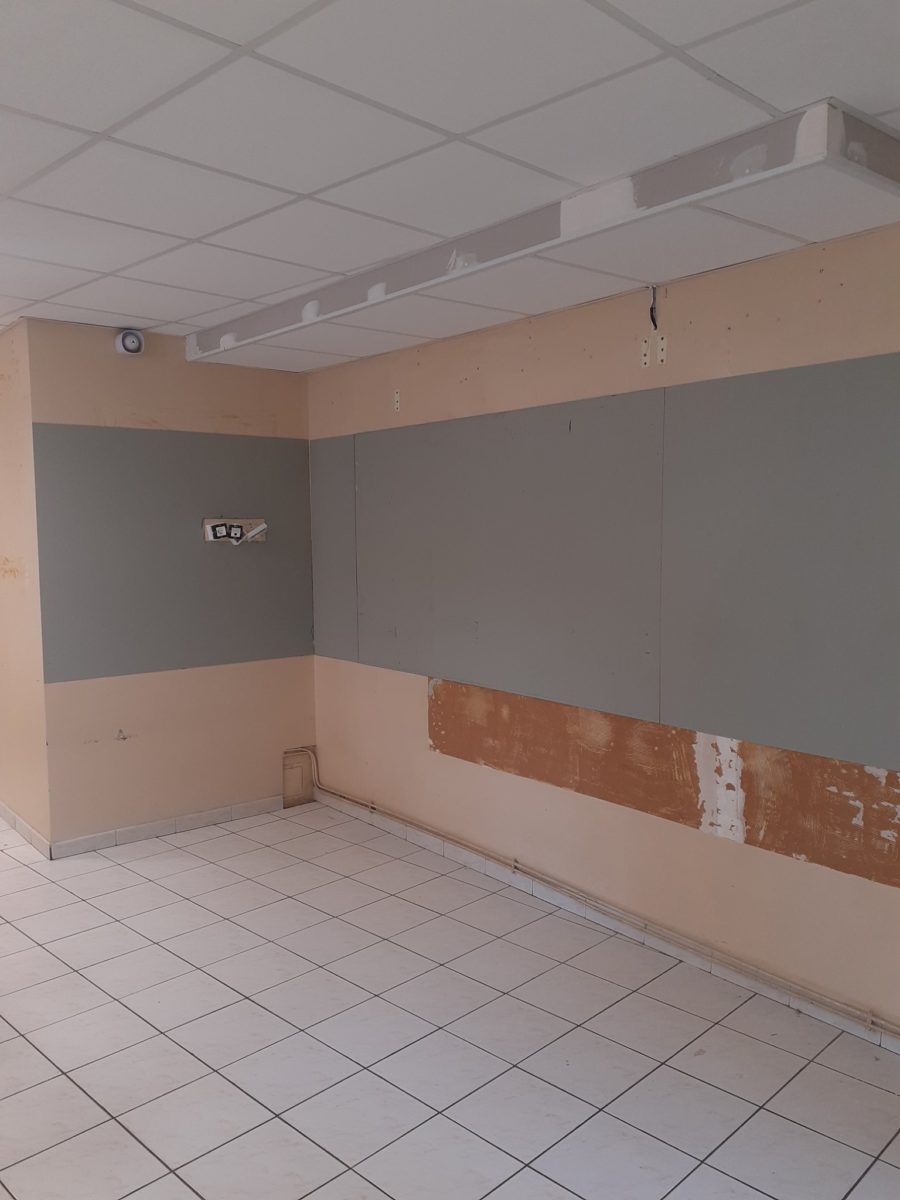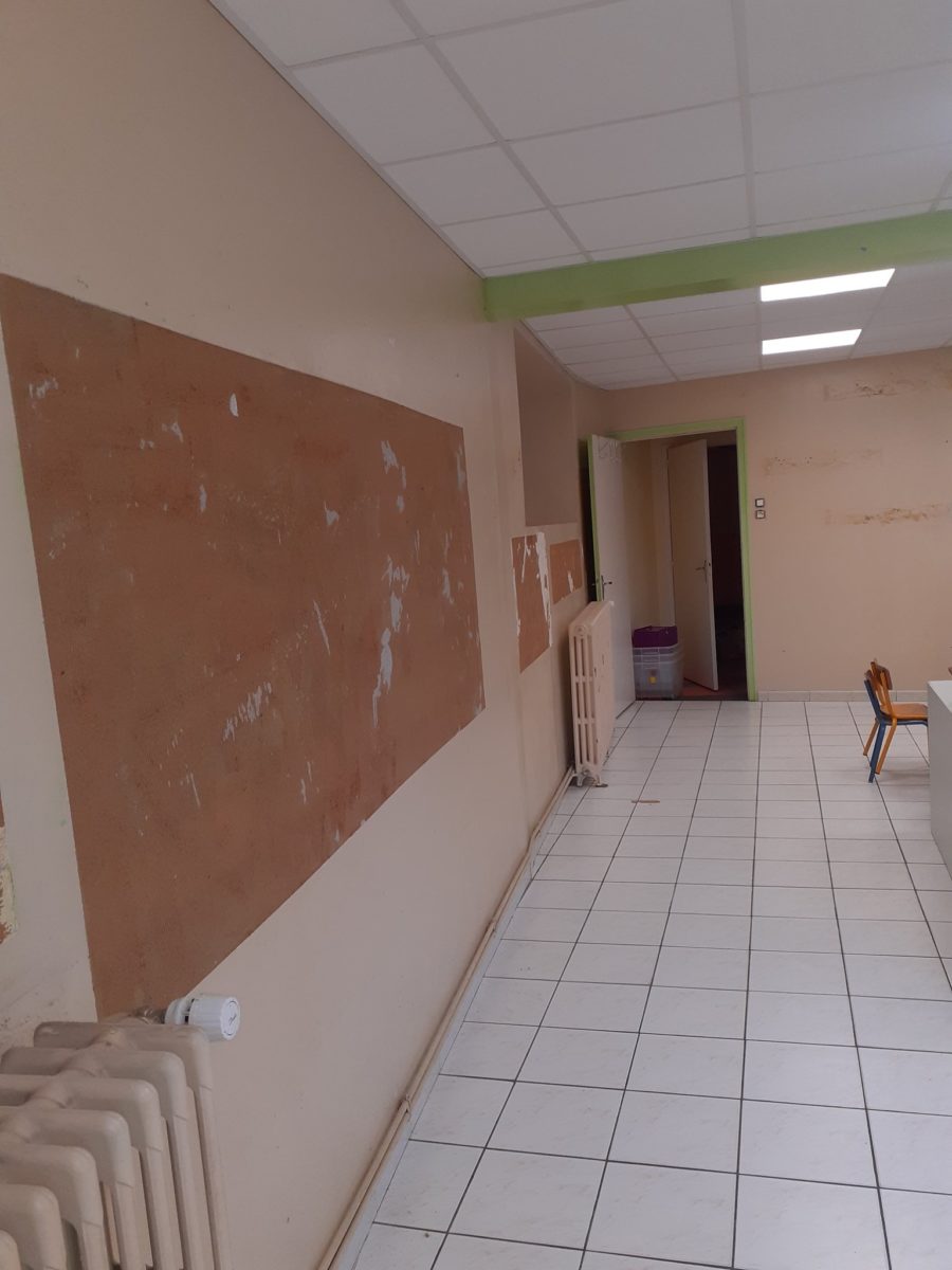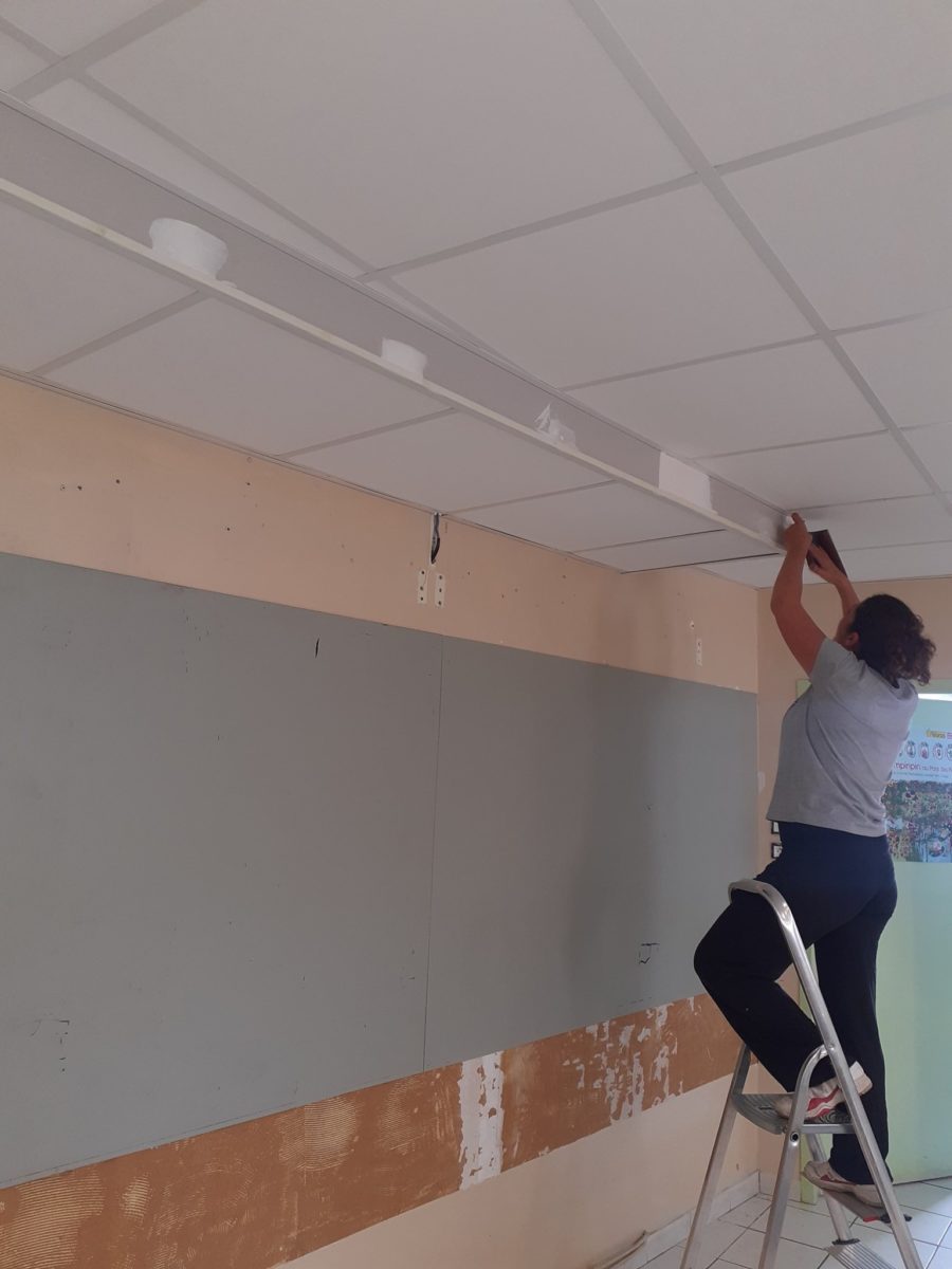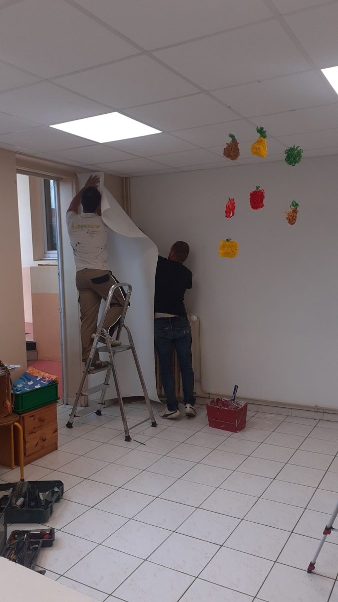 Des plaques aimantées ont été posées pour faciliter l’affichage des œuvres des enfants, puis de la fibre de verre et un coup de peinture blanche.