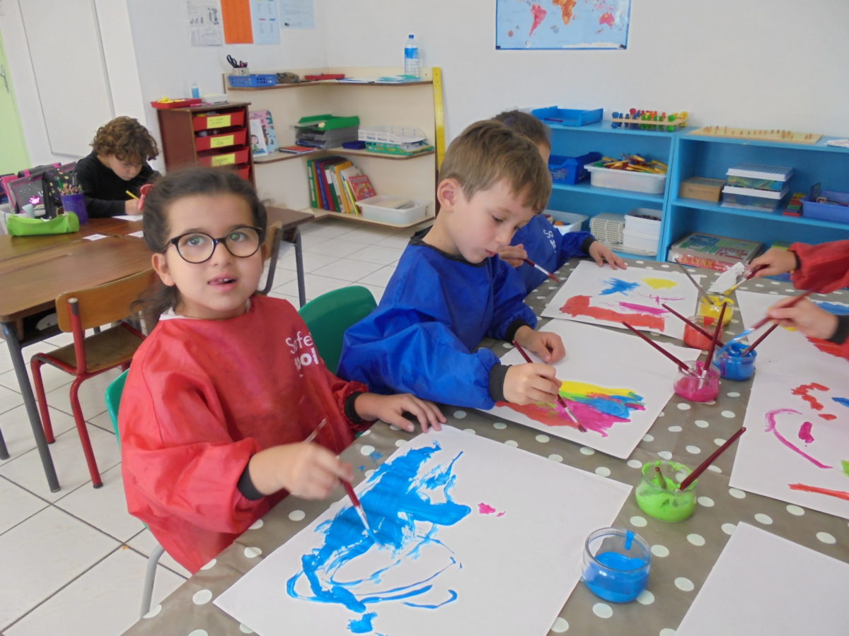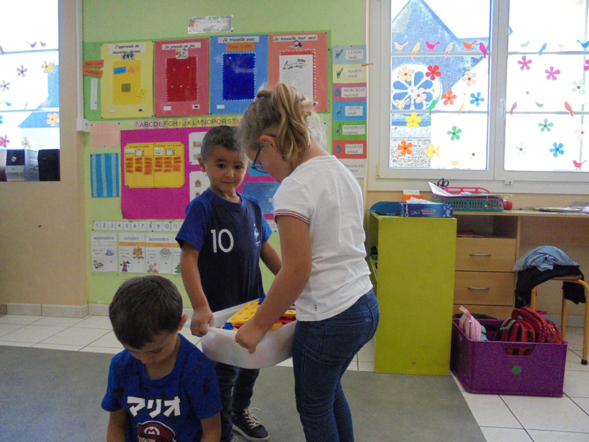 Dans notre classe, nous sommes 26 élèves : 21 GS et 5 MS ! Pour s’occuper de nous, il y a Marie-Claire bien sûr, Gwenola le lundi et Laurence les autres jours. Sans oublier Agathe et Sandrine certains moments de la journée, nous avons vraiment de la chance !