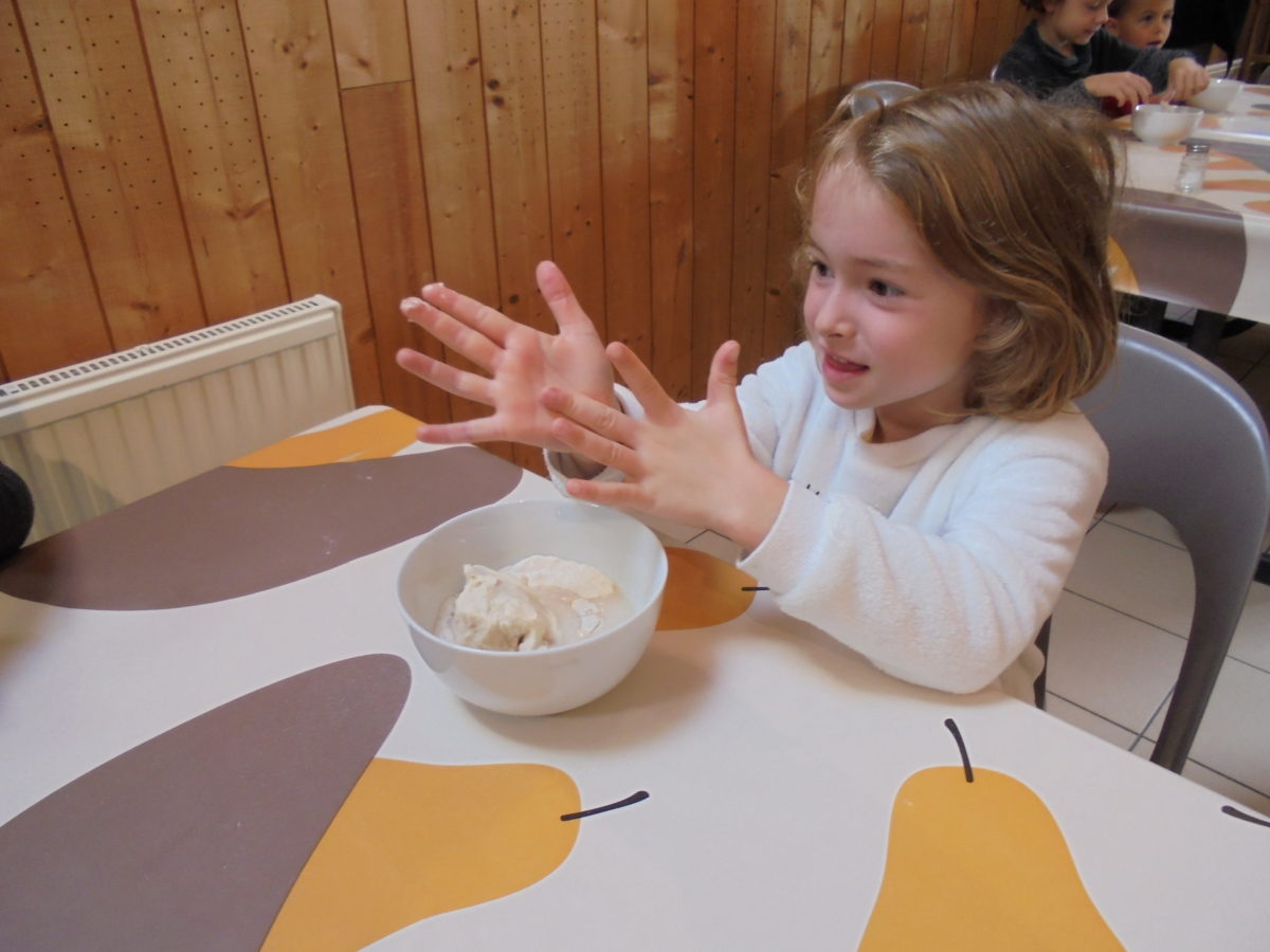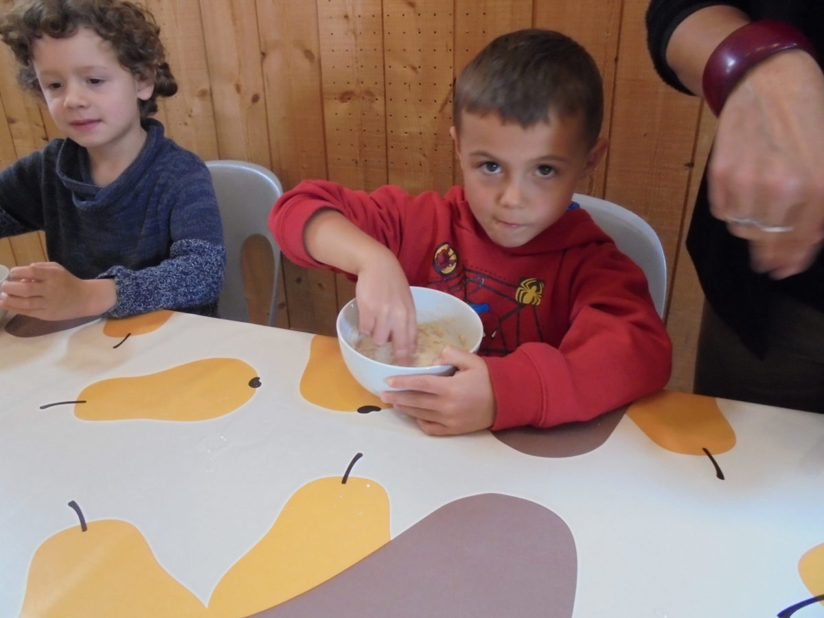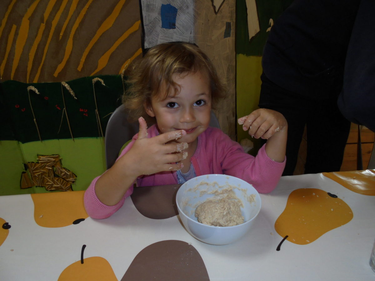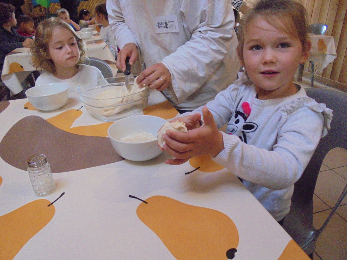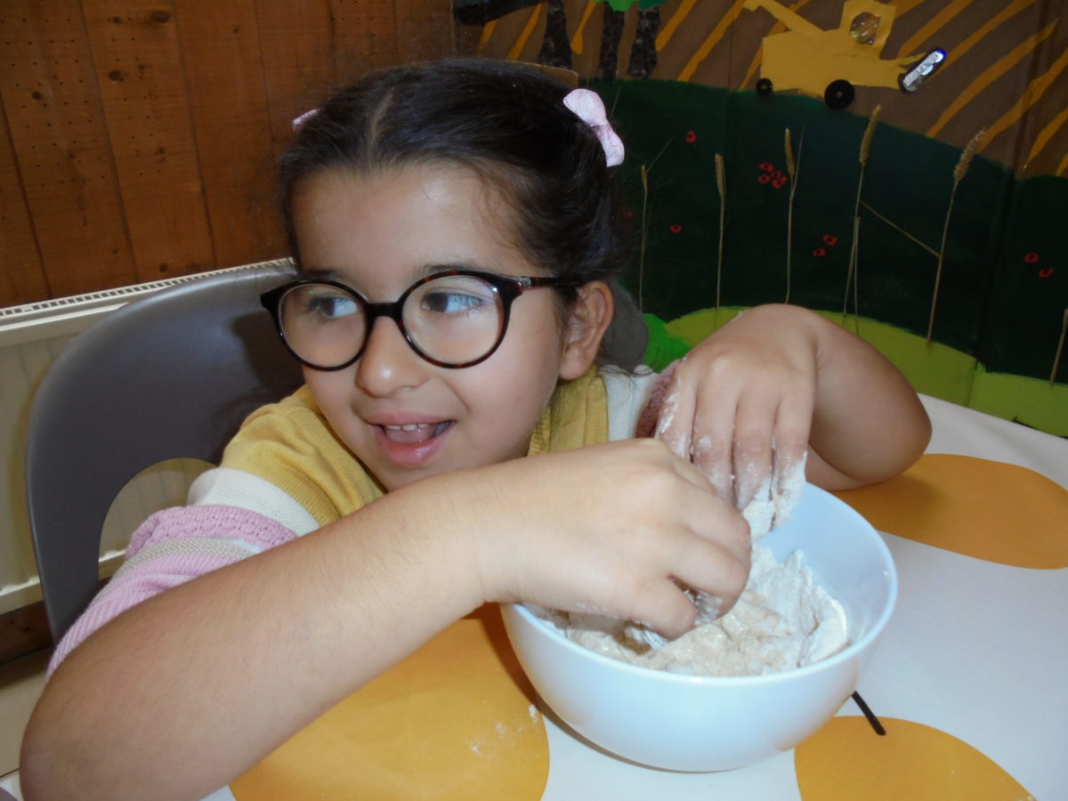 Le matin, notre classe a donc d’abord réalisé l’atelier pain. Avec de l’eau, de la farine, de la levure et une pincée de sel, chaque enfant a pu malaxer puis taper la pâte plusieurs fois ! Ensuite, il a fallu lui donner une forme légèrement allongée puis nos petits pains ont été enfournés.