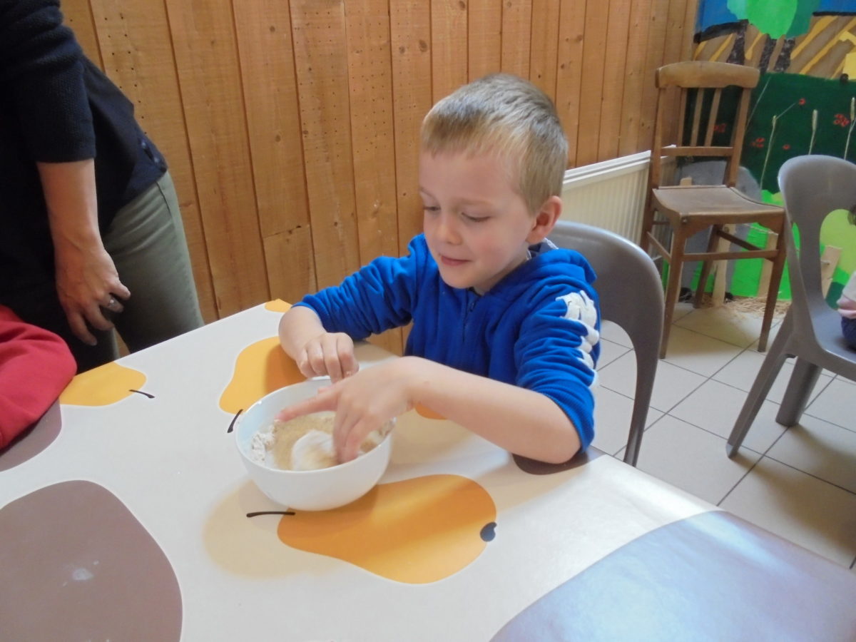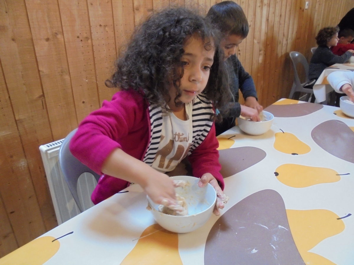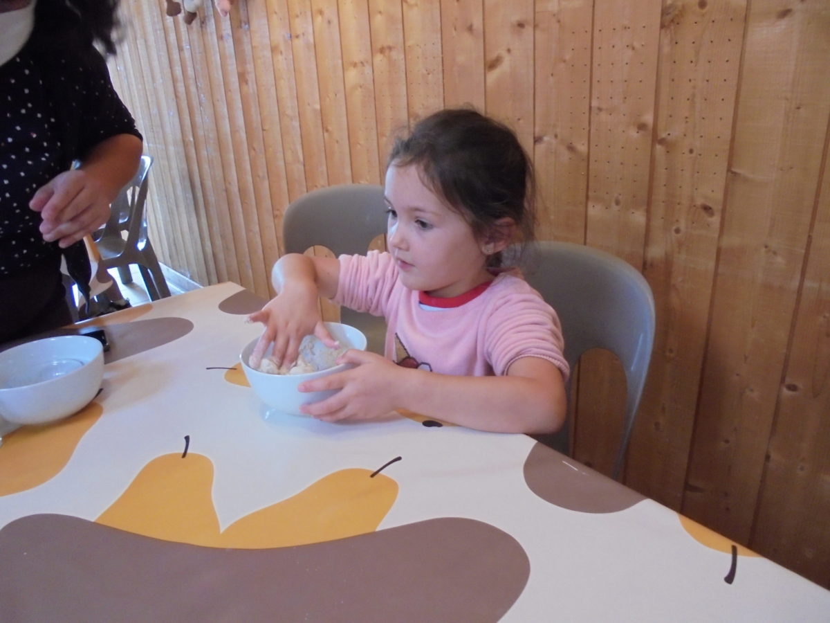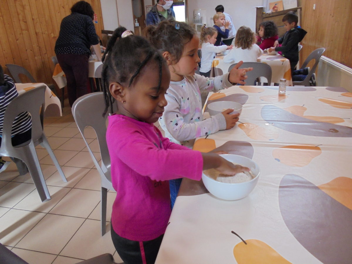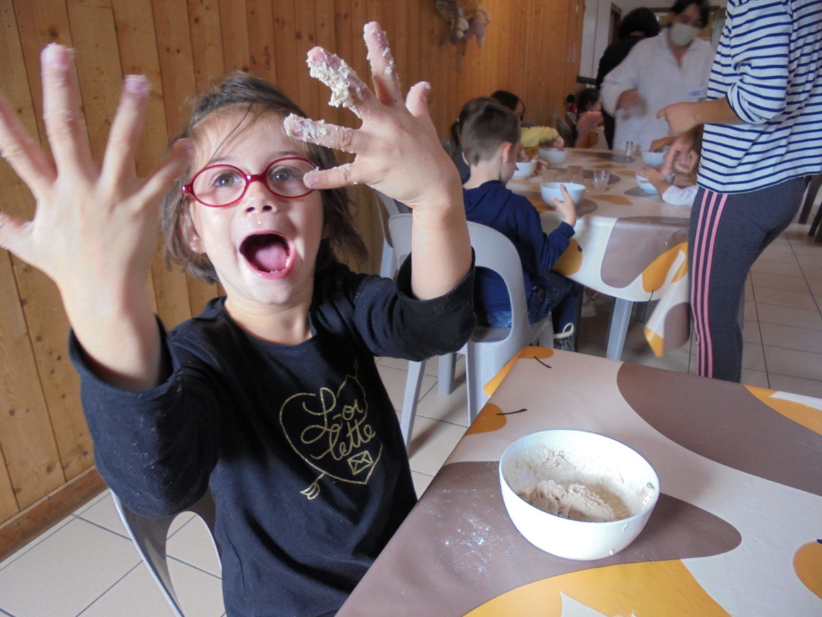 Le matin, notre classe a donc d’abord réalisé l’atelier pain. Avec de l’eau, de la farine, de la levure et une pincée de sel, chaque enfant a pu malaxer puis taper la pâte plusieurs fois ! Ensuite, il a fallu lui donner une forme légèrement allongée puis nos petits pains ont été enfournés.