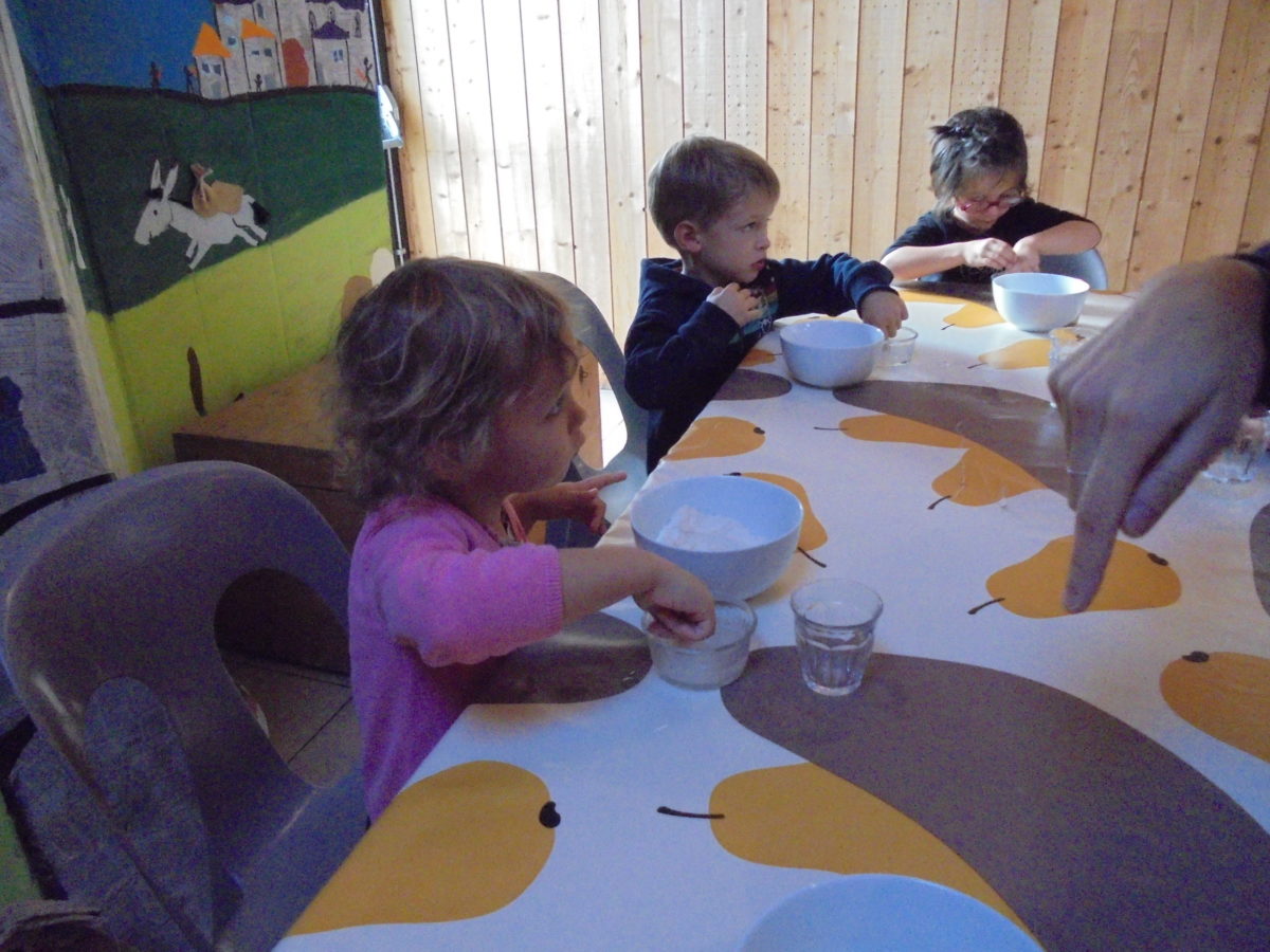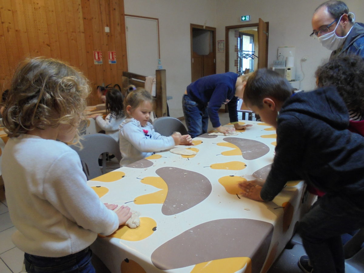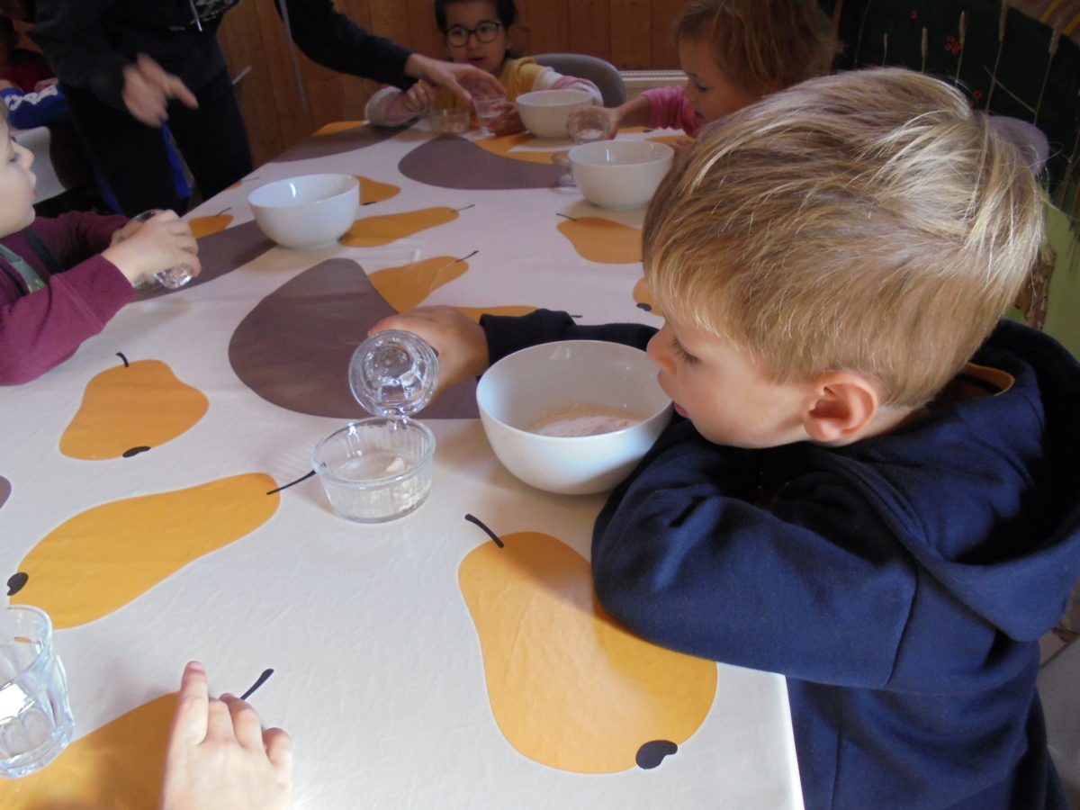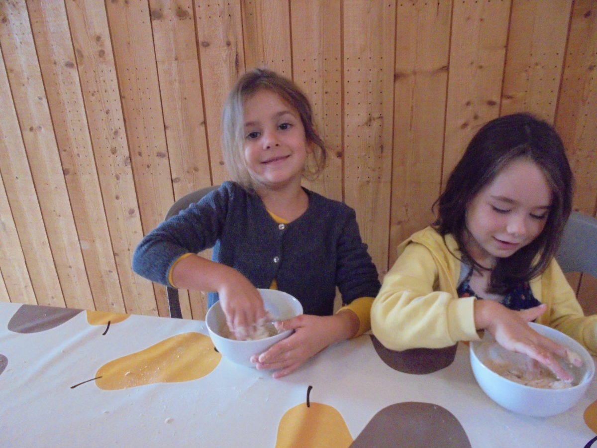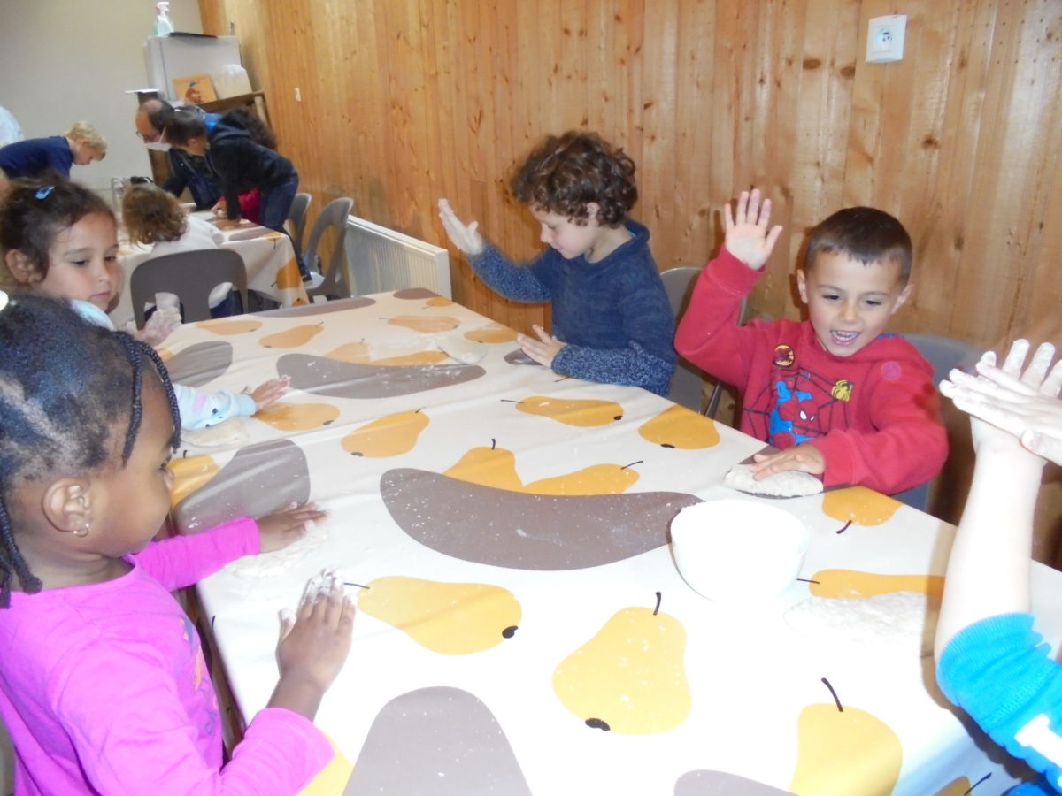 Le matin, notre classe a donc d’abord réalisé l’atelier pain. Avec de l’eau, de la farine, de la levure et une pincée de sel, chaque enfant a pu malaxer puis taper la pâte plusieurs fois ! Ensuite, il a fallu lui donner une forme légèrement allongée puis nos petits pains ont été enfournés.