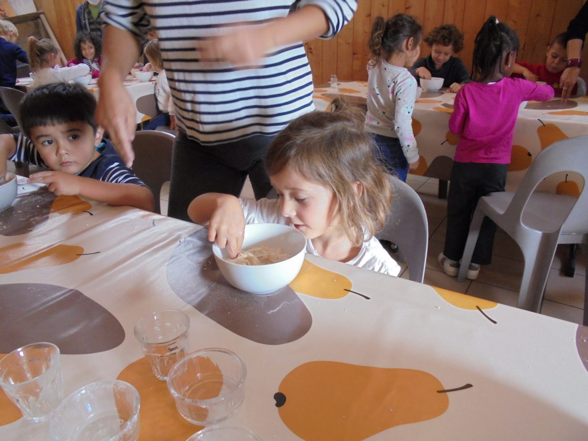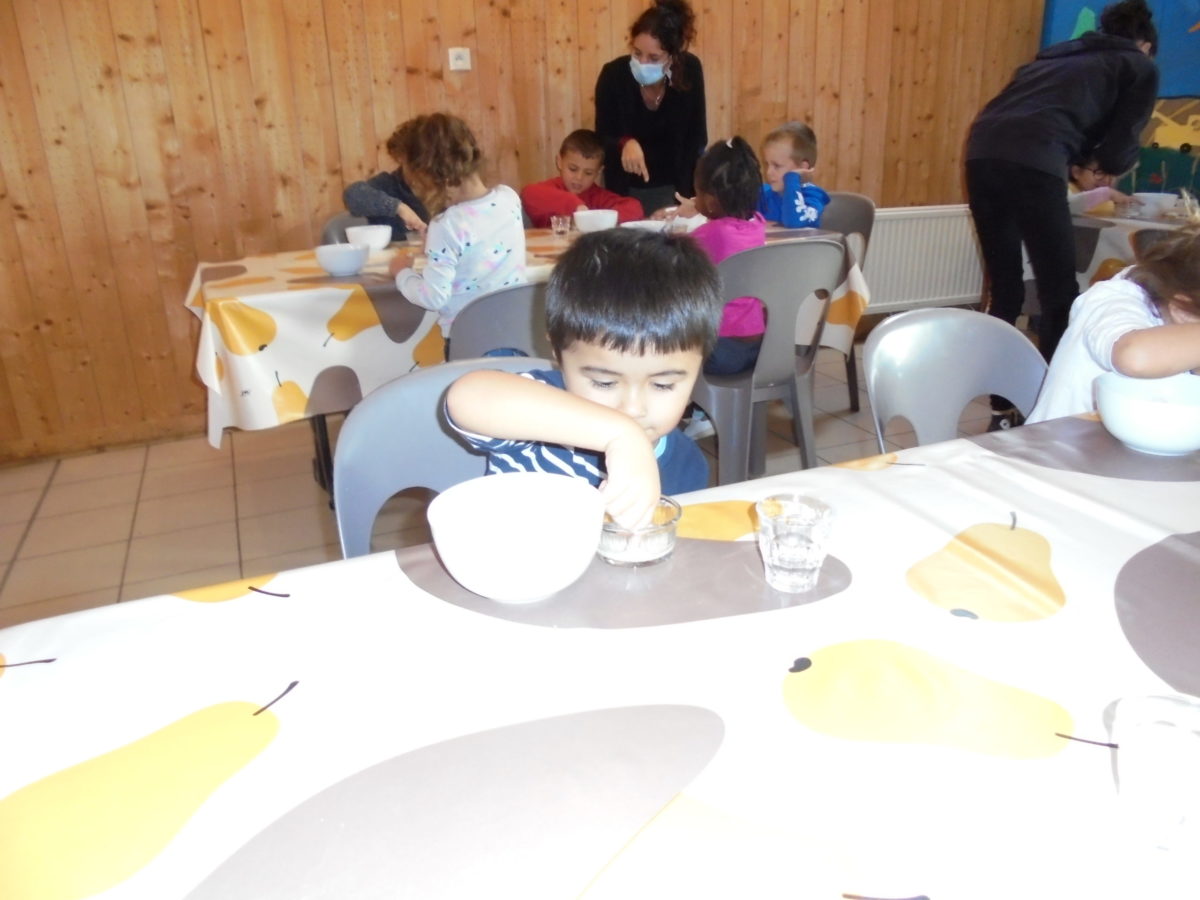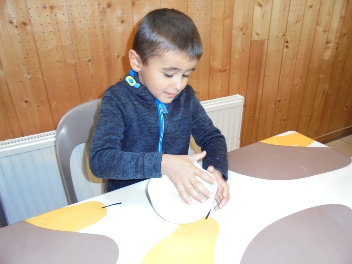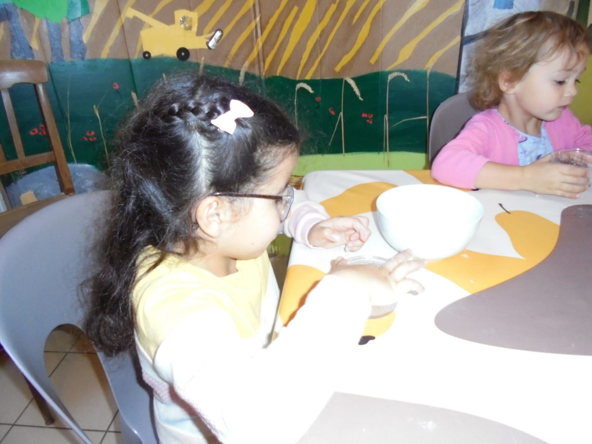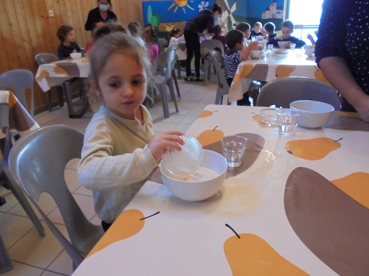 Le matin, notre classe a donc d’abord réalisé l’atelier pain. Avec de l’eau, de la farine, de la levure et une pincée de sel, chaque enfant a pu malaxer puis taper la pâte plusieurs fois ! Ensuite, il a fallu lui donner une forme légèrement allongée puis nos petits pains ont été enfournés.