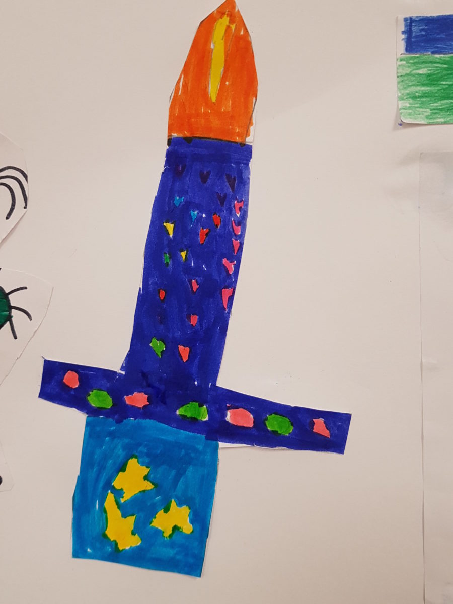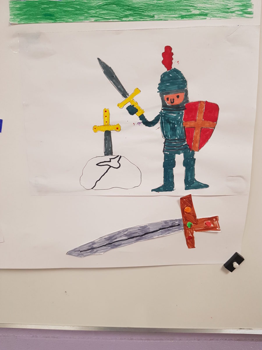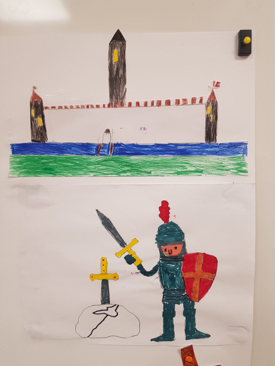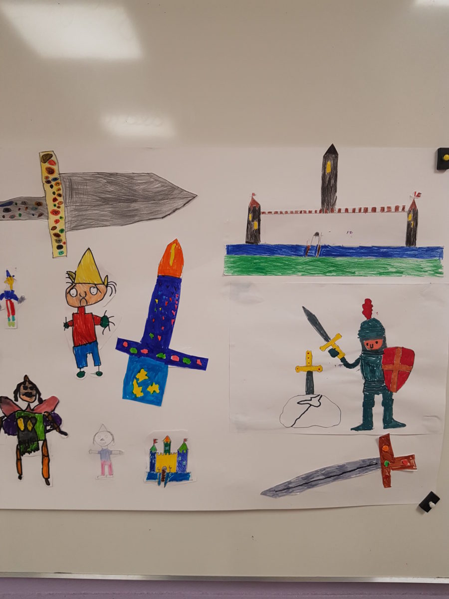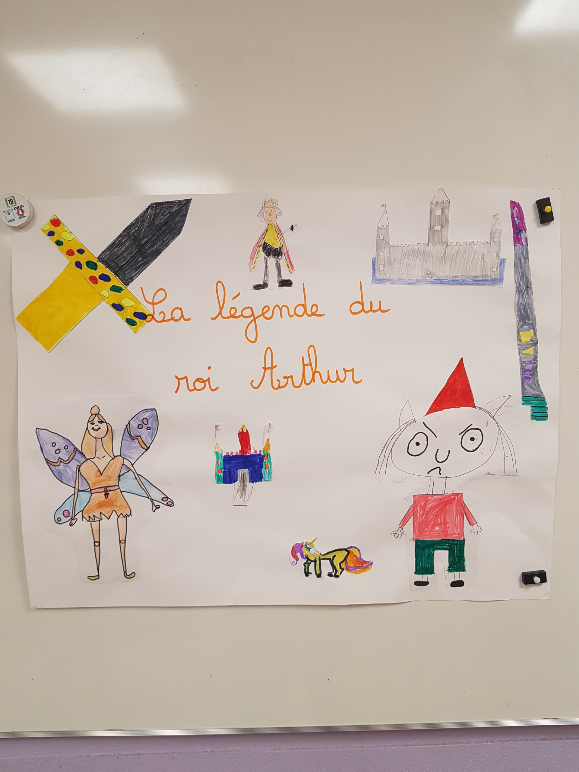 Lors de notre sortie aux Jardins de Brocéliande, les enfants ont découvert la légende du roi Arthur. En classe, ils ont poursuivi cette découverte et ont dessiné les différents lieux, personnages et objets de cette légende : châteaux, épées, chevaliers, licornes, fées, korrigans, …