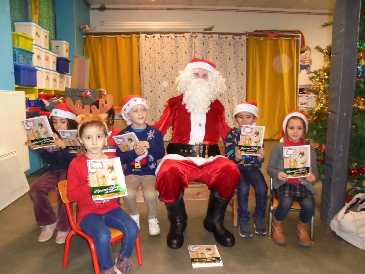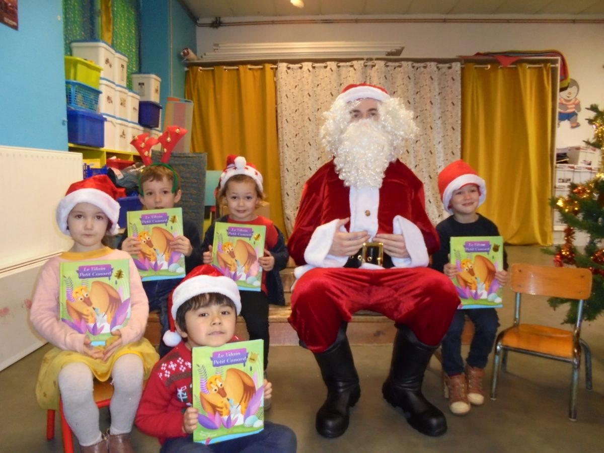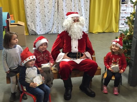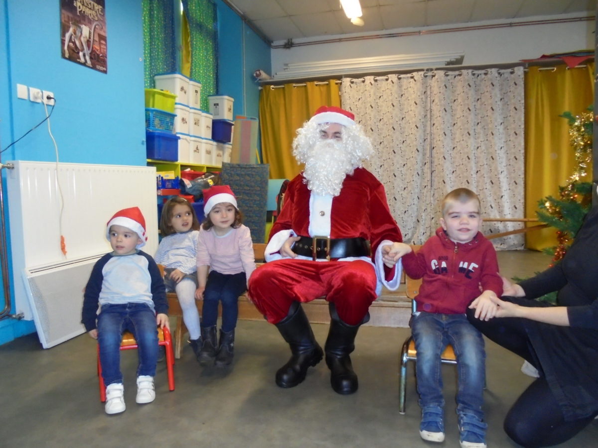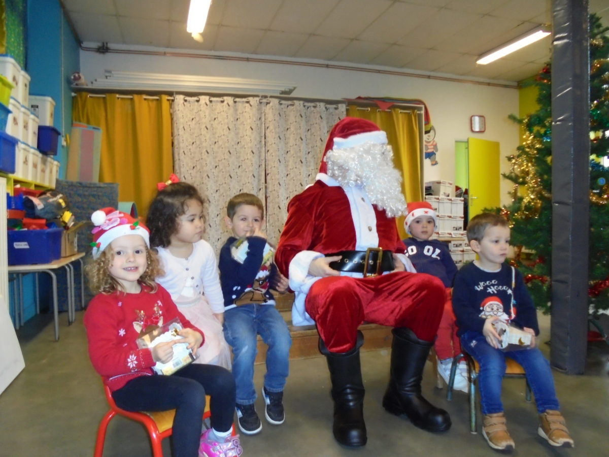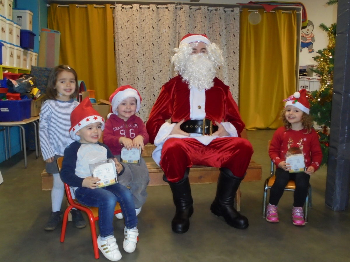Beaucoup de rires à son arrivée dans la salle de motricité, un peu moins au moment des photos pour certains enfants … mais pour la première fois, pas de pleurs ! Chaque enfant a reçu de la main du Père Noël un joli livre, certains ayant pourtant pris le temps de préciser que ce n’était pas ce qu’ils avaient commandé !