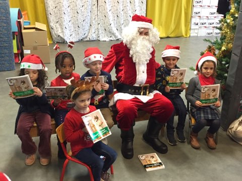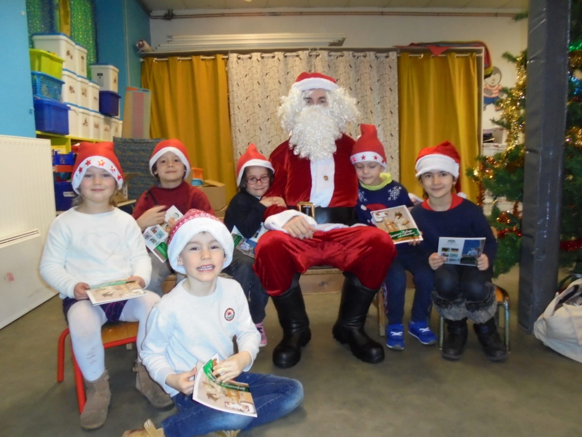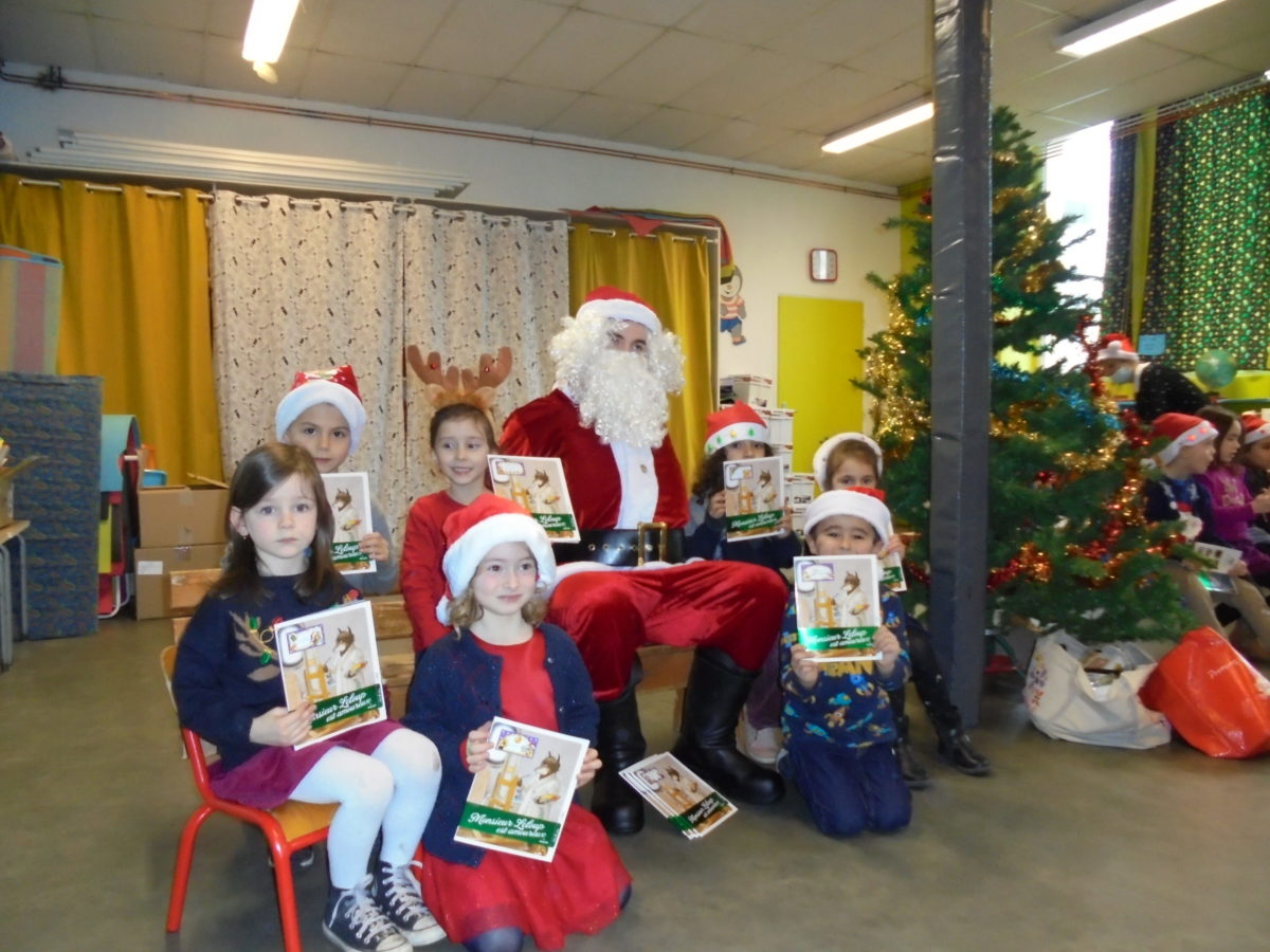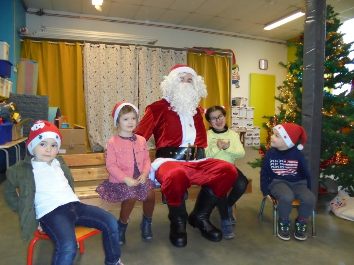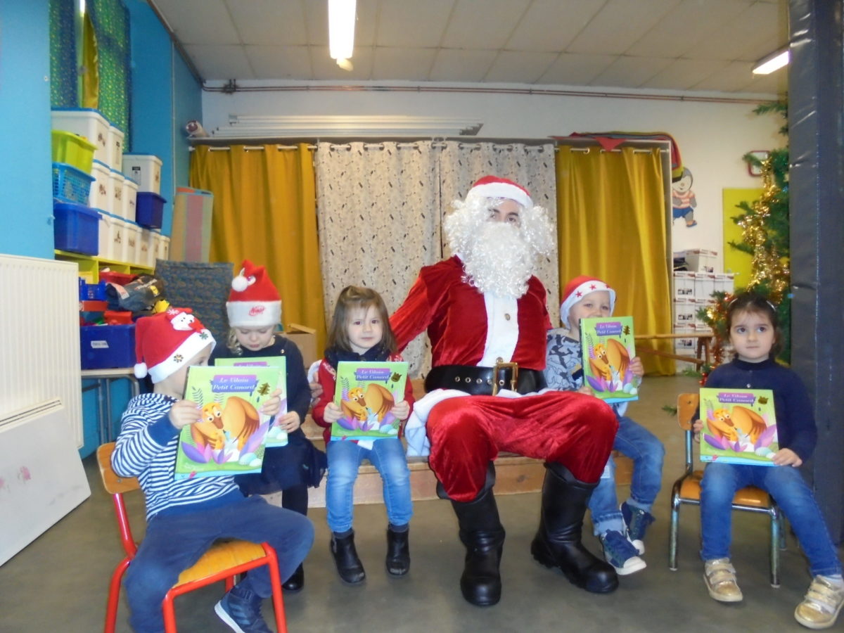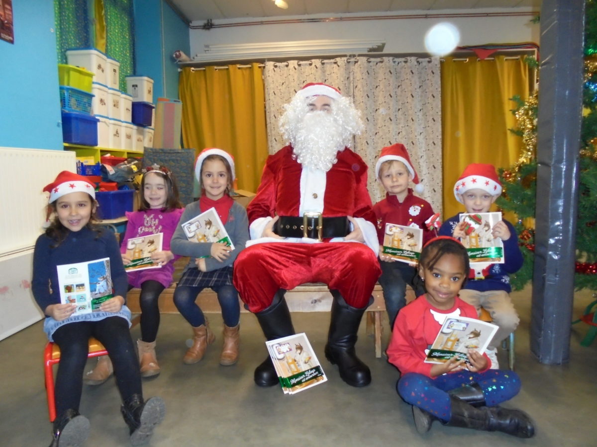 Beaucoup de rires à son arrivée dans la salle de motricité, un peu moins au moment des photos pour certains enfants … mais pour la première fois, pas de pleurs ! Chaque enfant a reçu de la main du Père Noël un joli livre, certains ayant pourtant pris le temps de préciser que ce n’était pas ce qu’ils avaient commandé !