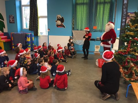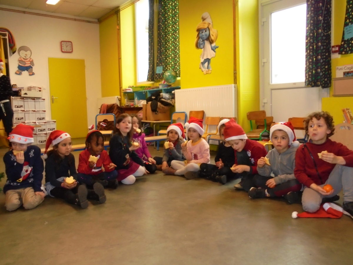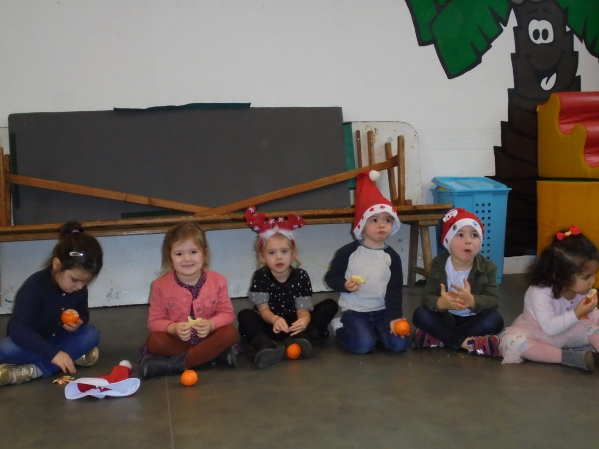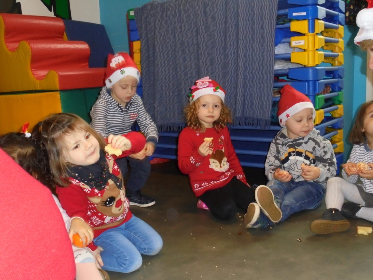 Pour nous mettre dans l’ambiance, chacun est venu vêtu d’un accessoire de Noël, bonnet, serre-tête, pull etc … Et bien sûr, de la bonne humeur pour tous ! Vers 10h, les deux classes de maternelle se sont regroupées dans la salle de motricité pour un mini arbre de Noël, juste entre nous ! Au menu : danses, chants, goûter et surtout …. visite du Père Noël !!