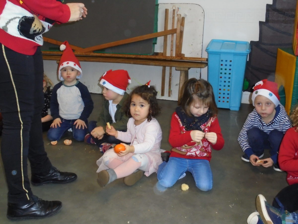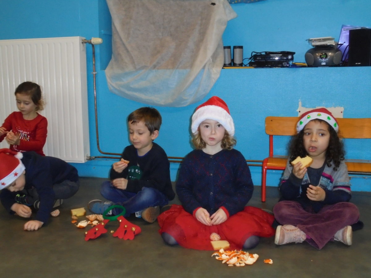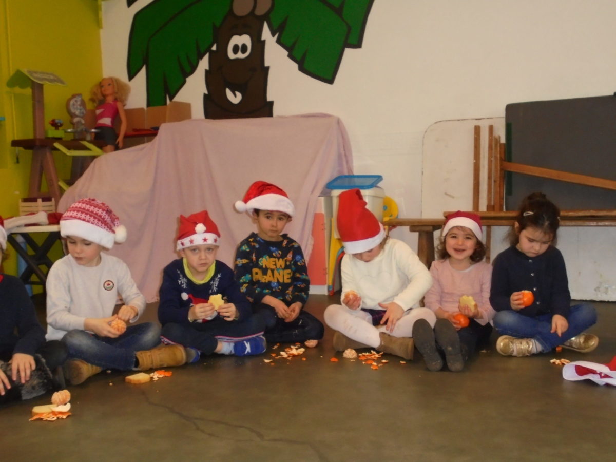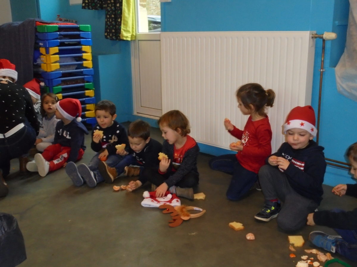 Pour nous mettre dans l’ambiance, chacun est venu vêtu d’un accessoire de Noël, bonnet, serre-tête, pull etc … Et bien sûr, de la bonne humeur pour tous ! Vers 10h, les deux classes de maternelle se sont regroupées dans la salle de motricité pour un mini arbre de Noël, juste entre nous ! Au menu : danses, chants, goûter et surtout …. visite du Père Noël !!
