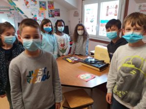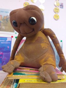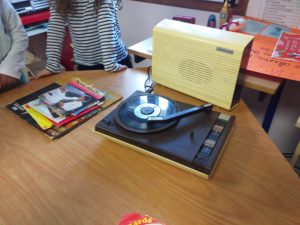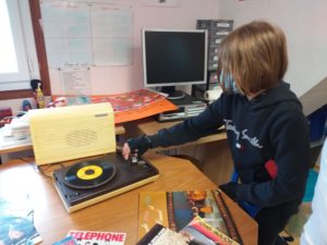 Il y a Casimir, Goldorak, Tintin, la grenouille du muppet show, Louis de Funès, des disques…… Les enfants avaient déjà observé des personnages importants pour Thomas Scotto lorsque celui-ci leur avait envoyé une vidéo pour se présenter. Ainsi, ils ont visionné en classe des passages de Goldorak, Casimir, le Muppet Show et E.T. Ils ont pu également utiliser un tourne disque.