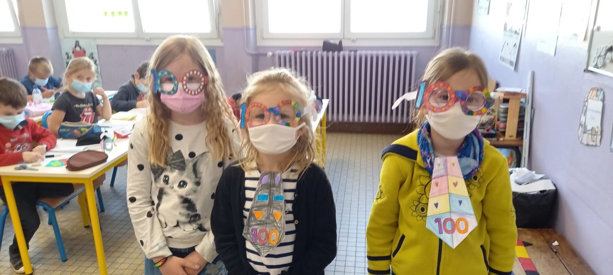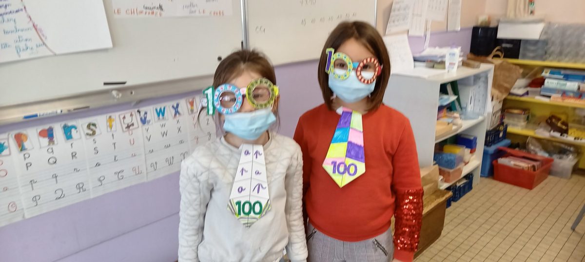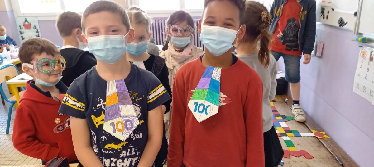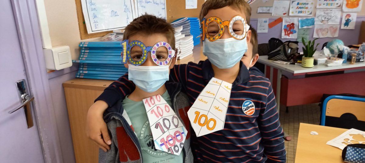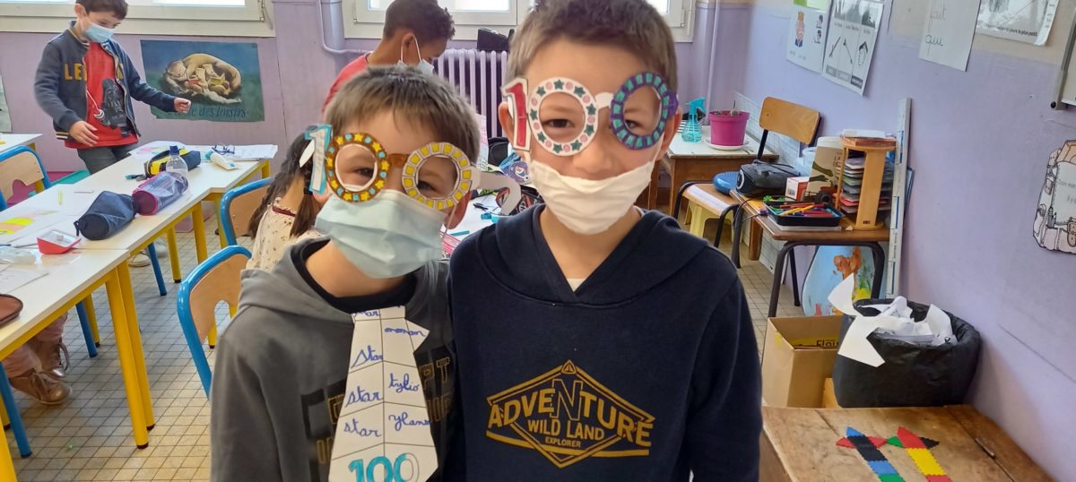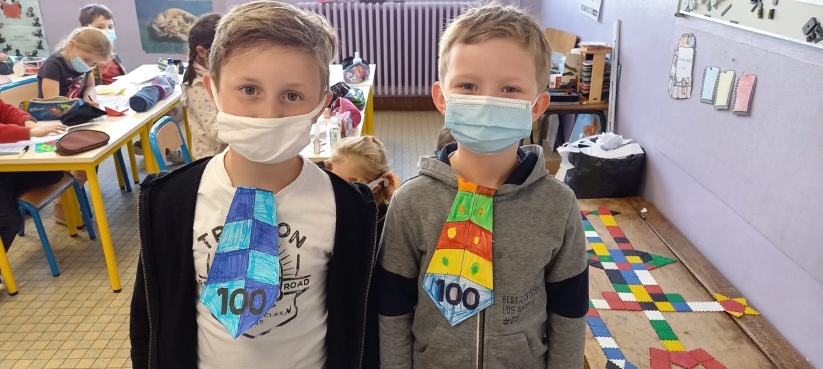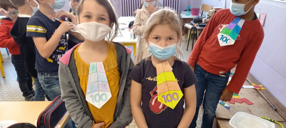 Lundi 26 avril, c’était notre 100ème jour d’école. Pour l’occasion, Valérie nous avait préparé des défis : faire 100 calculs, écrire 100 mots, trouver 100 noms d’animaux, faire des puzzles et des constructions de 100 pièces, réaliser des colliers de 100 perles. Nous avons aussi formé le nombre 100 avec nos corps et fabriqué des lunettes et une cravate. Nous avons réussi tous les défis. A la fin de la journée, nous avons partagé un gâteau. Vive le 100ème jour d’école !