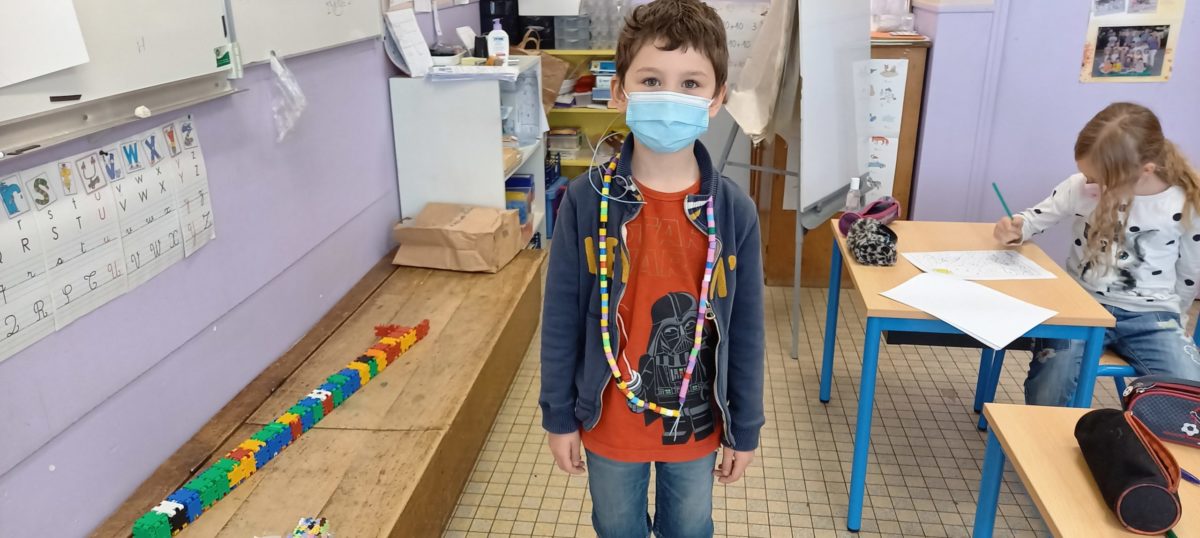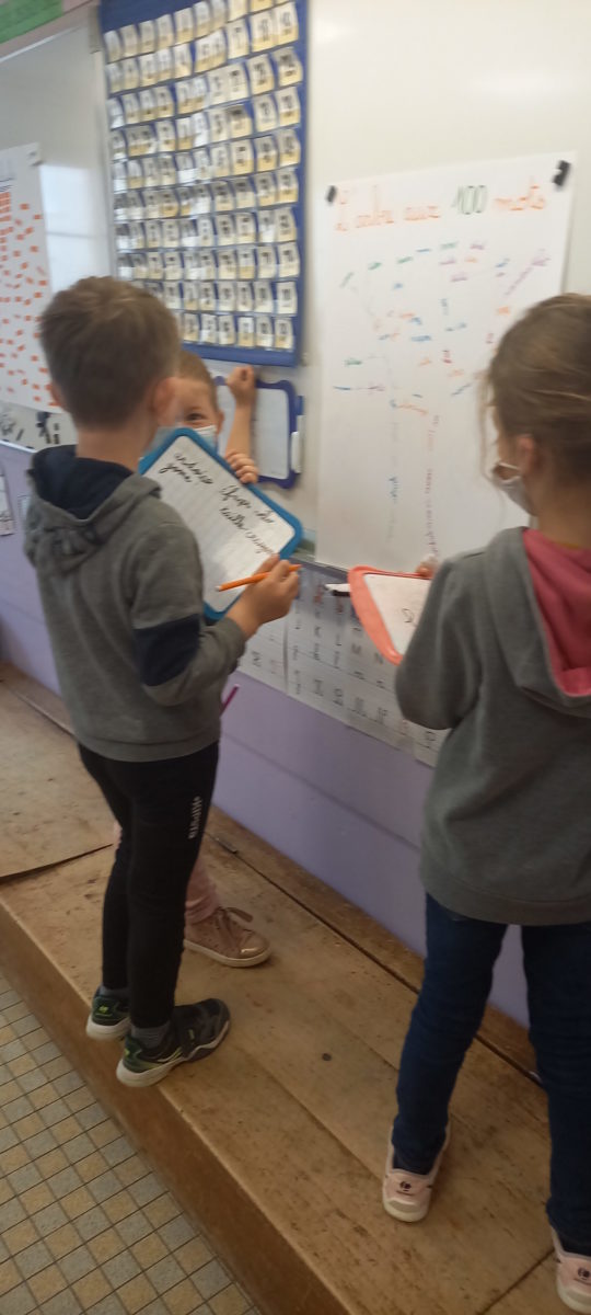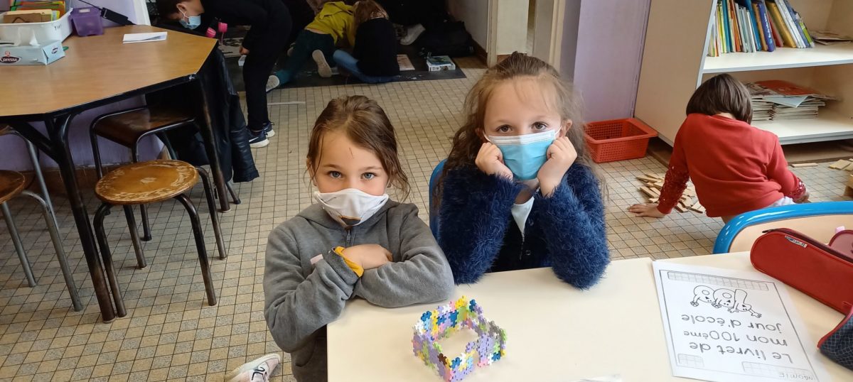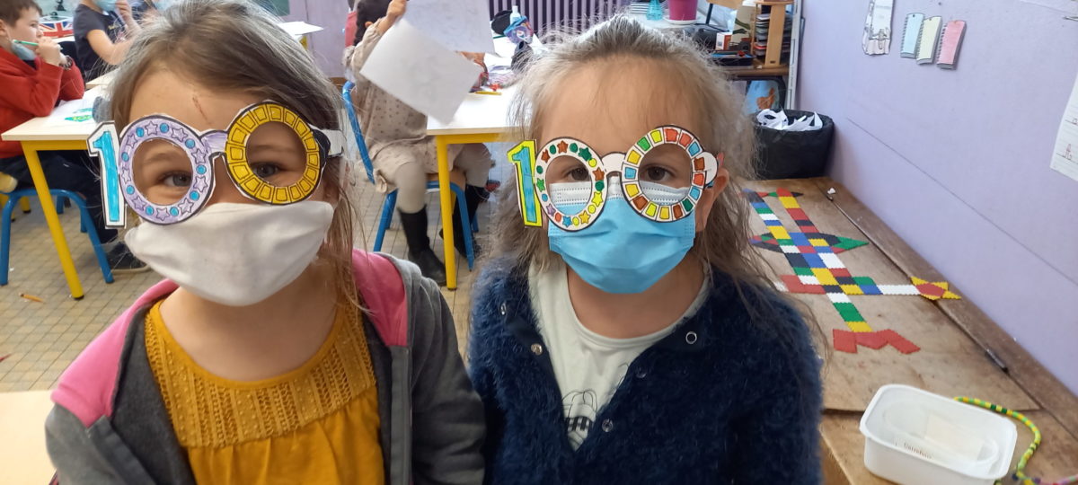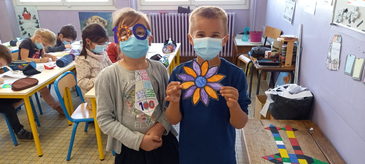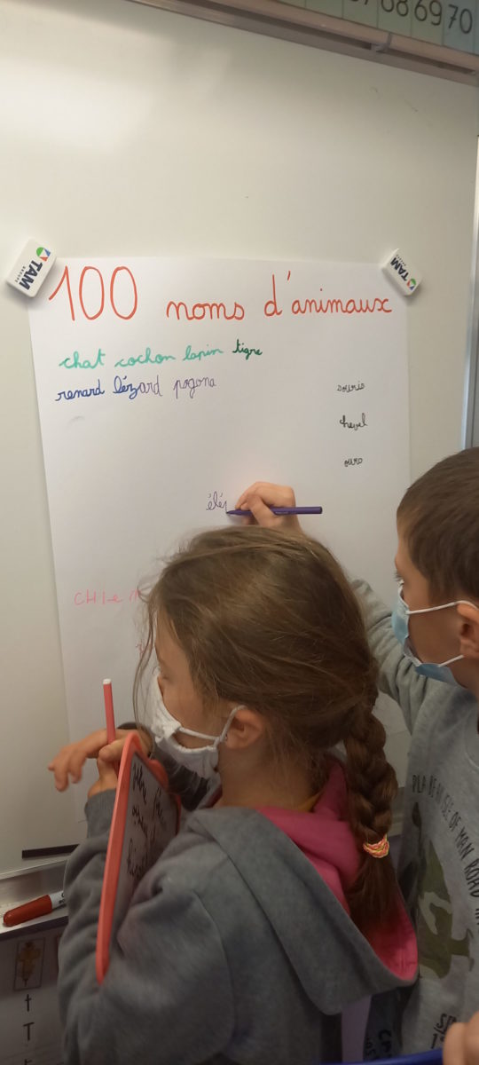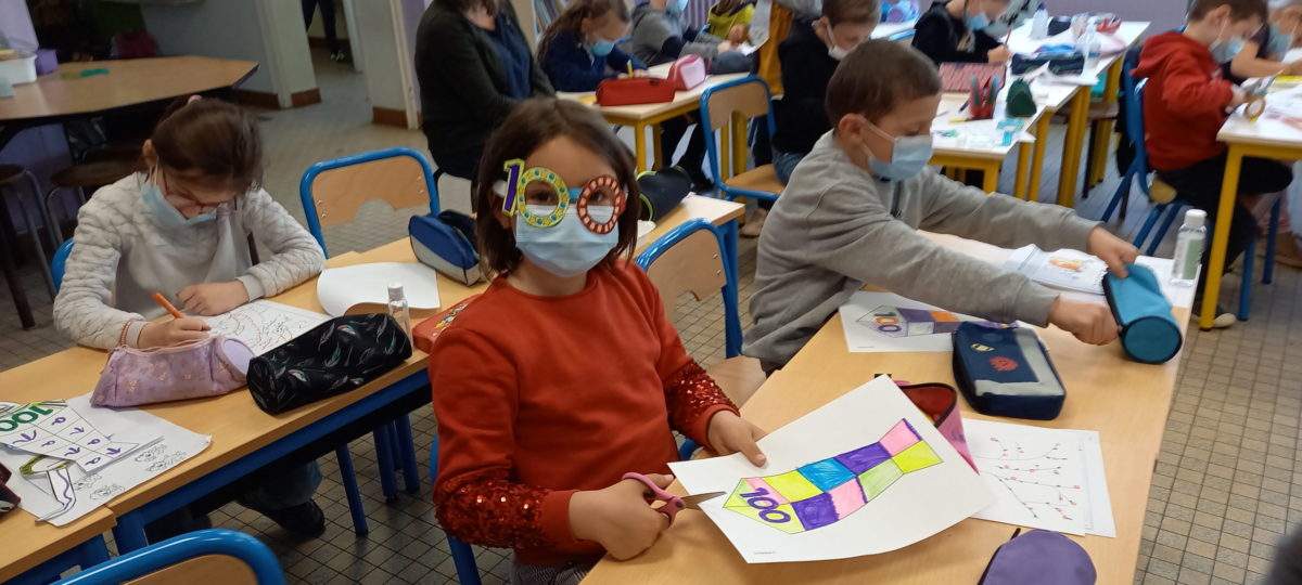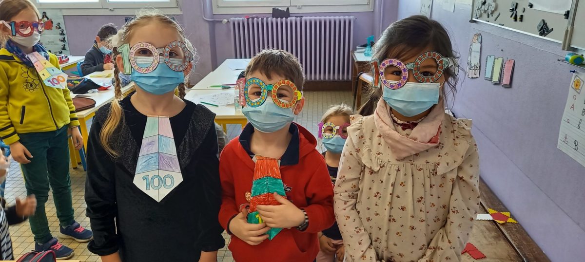 Lundi 26 avril, c’était notre 100ème jour d’école. Pour l’occasion, Valérie nous avait préparé des défis : faire 100 calculs, écrire 100 mots, trouver 100 noms d’animaux, faire des puzzles et des constructions de 100 pièces, réaliser des colliers de 100 perles. Nous avons aussi formé le nombre 100 avec nos corps et fabriqué des lunettes et une cravate. Nous avons réussi tous les défis. A la fin de la journée, nous avons partagé un gâteau. Vive le 100ème jour d’école !