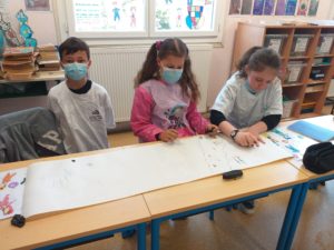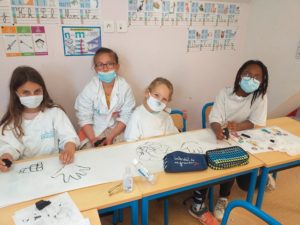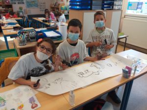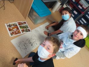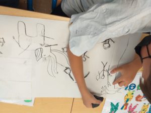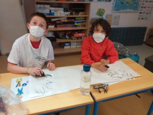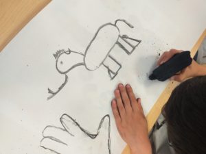 Comme les hommes préhistoriques, nous avons dessiné avec du charbon et nous avons fait des fresques en nous inspirant des dessins représentés dans les grottes de cette époque.