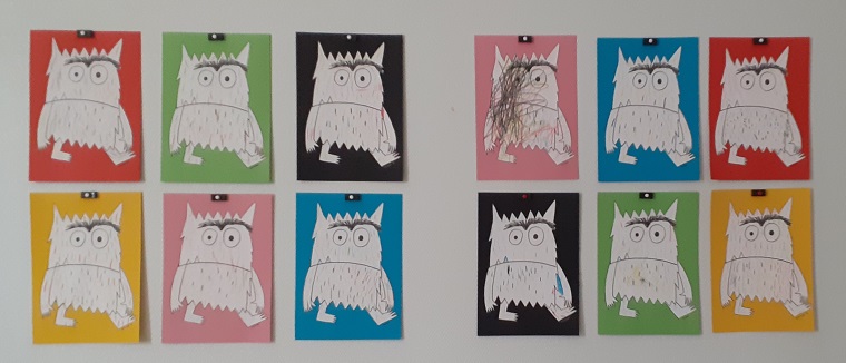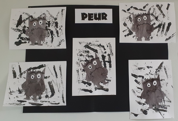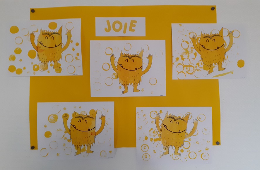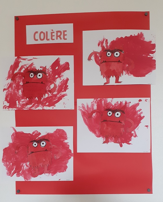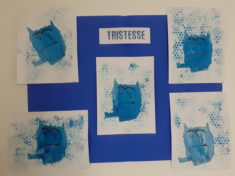 Puis par groupe de 4 ou 5 enfants, nous avons réalisé un affichage correspondant à certaines émotions et leur couleur comme dans l’album. Nous avons utilisé différentes techniques et matières pour les réaliser: encres de couleur, gouaches, papier bulle, Kapla, emporte-pièces de formes différentes…