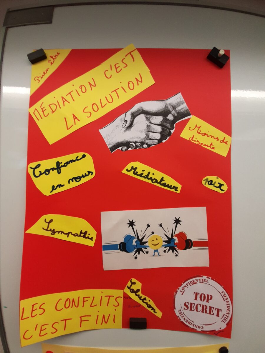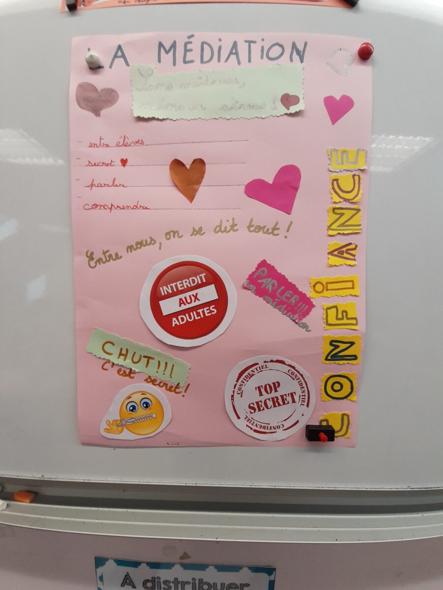Ces médiateurs et médiatrices sont déjà entrés en action. Une salle de médiation, supervisée par un adulte toujours à proximité, est mise à leur disposition. Les médiateurs/médiatrices, par binôme, suivent la procédure à laquelle ils ont été formé.e.s.