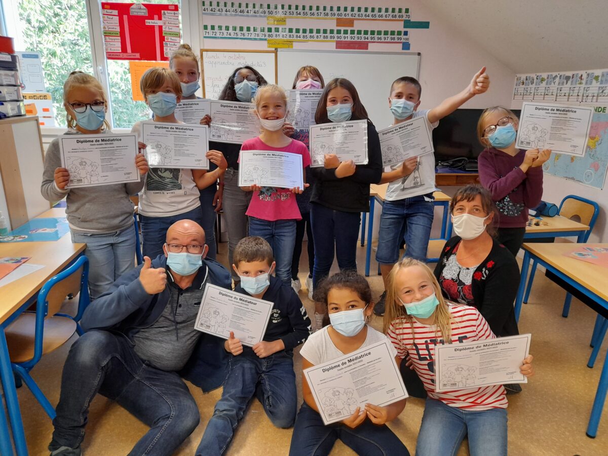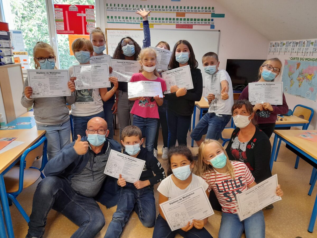 Ces élèves ont à leur tour été formés à devenir médiateurs et médiatrices, par l’AROEVEN de Nantes, une association agréée par le Ministère de l’Education Nationale. Les enfants ont suivi deux journées de formation avec Marie, formatrice de l’Aroeven, Anthony, animateur au périscolaire et Sandrine, enseignante. A la fin de ces deux jours, un diplôme leur a été délivré.