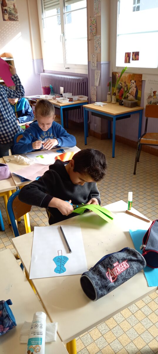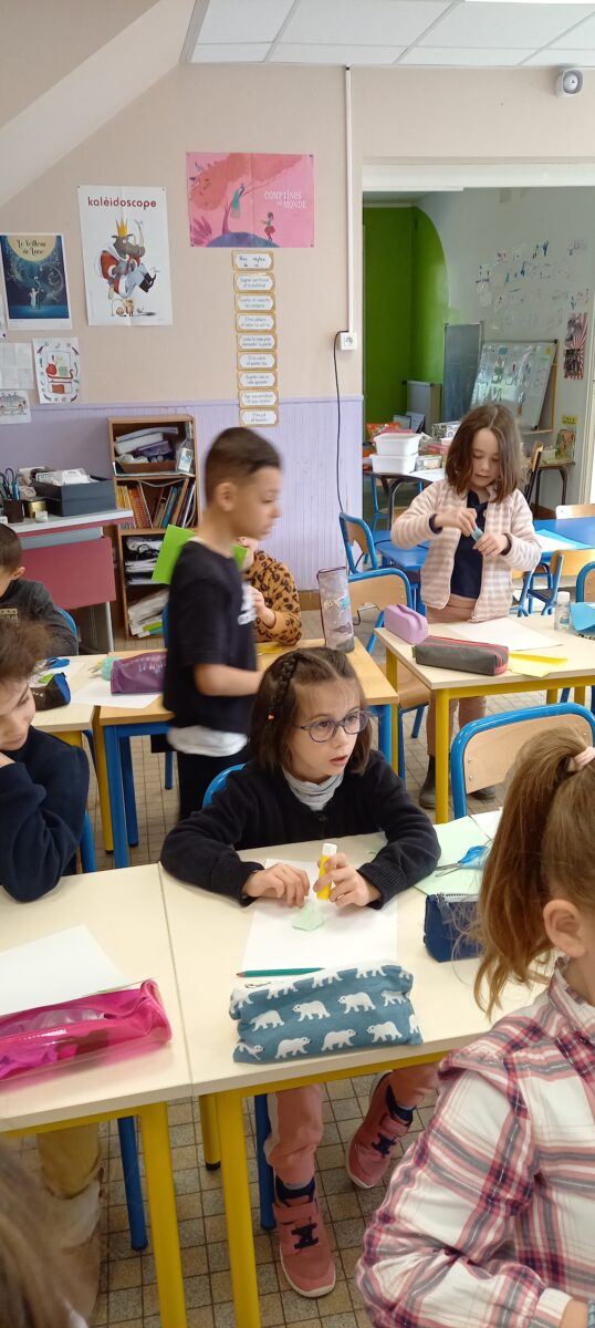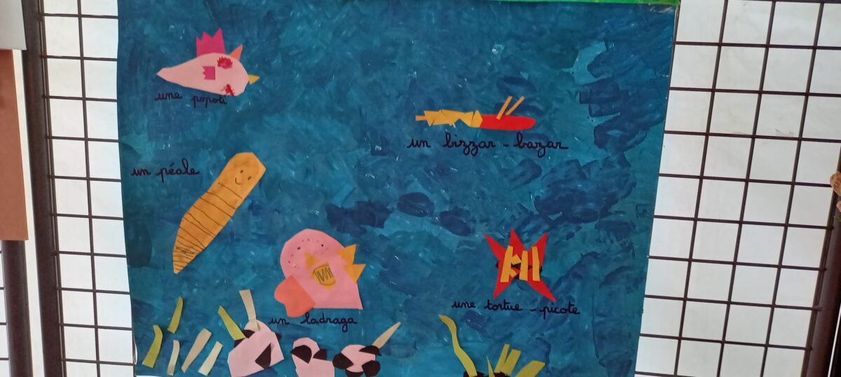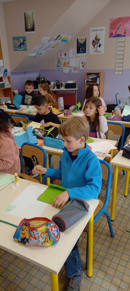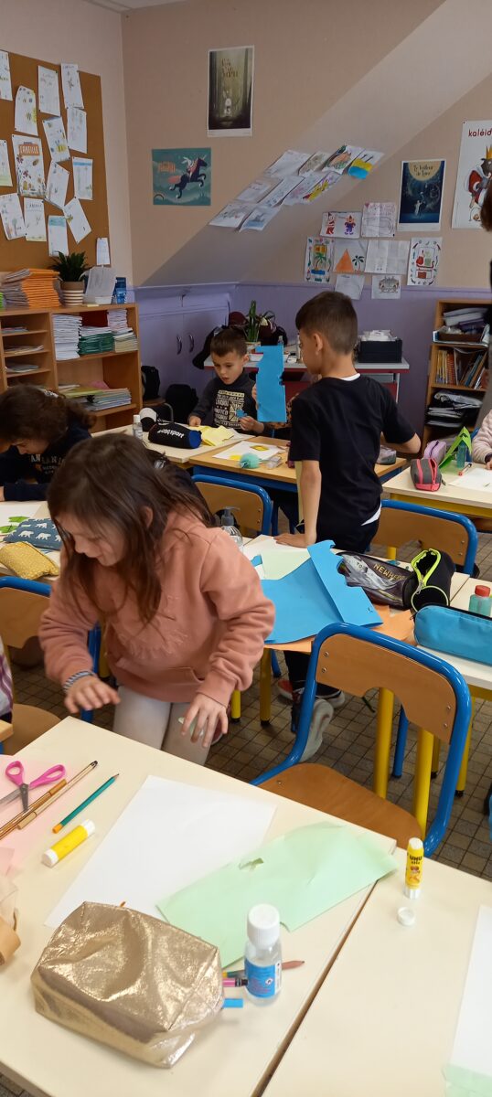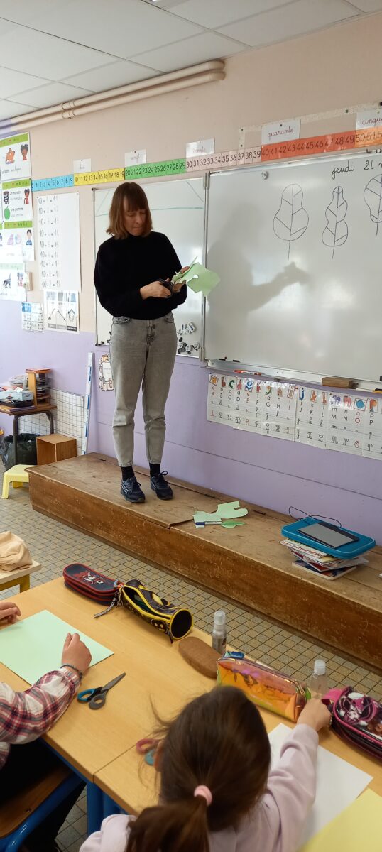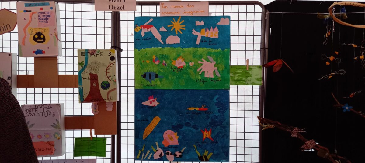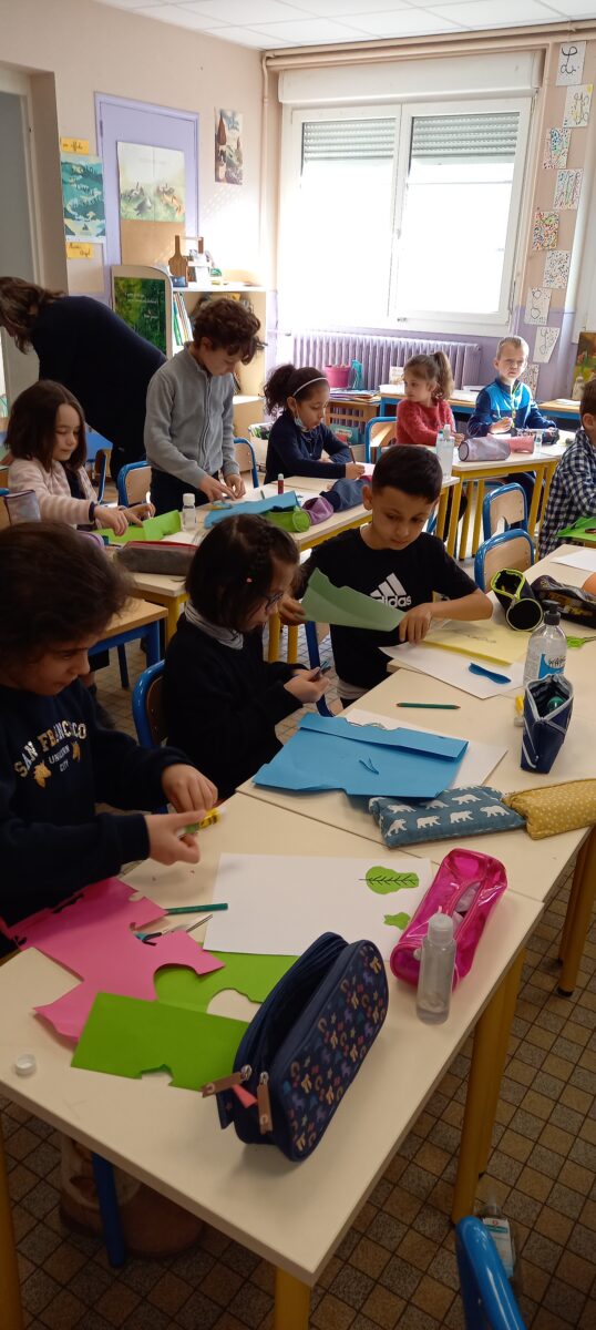 Jeudi 24 mars, nous avons eu la chance d’accueillir une illustratrice nantaise Marta Orzel. Elle nous a parlé de son métier et de ses réalisations et techniques. Elle nous a ensuite montré des modèles d’arbres. Nous en avons réalisé en découpant dans du papier de couleur. Nous lui avons également présenté notre œuvre collective » Le monde des animaux imaginaires ». Celle-ci est exposée au Salon du livre de Sucé sur Erdre ce week-end.