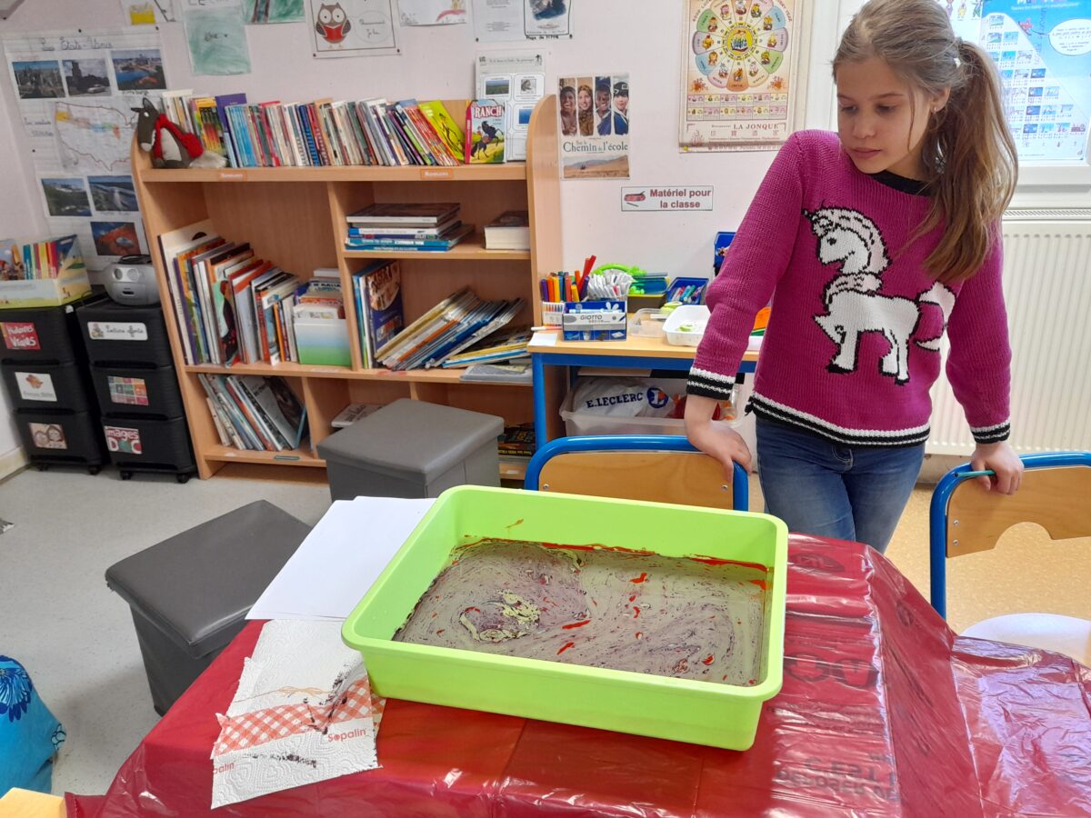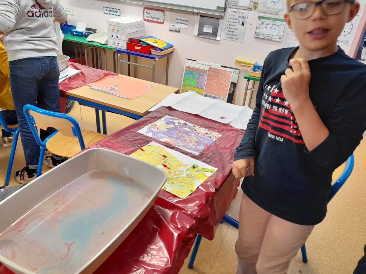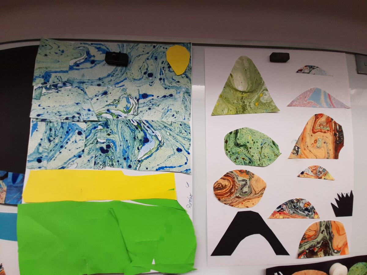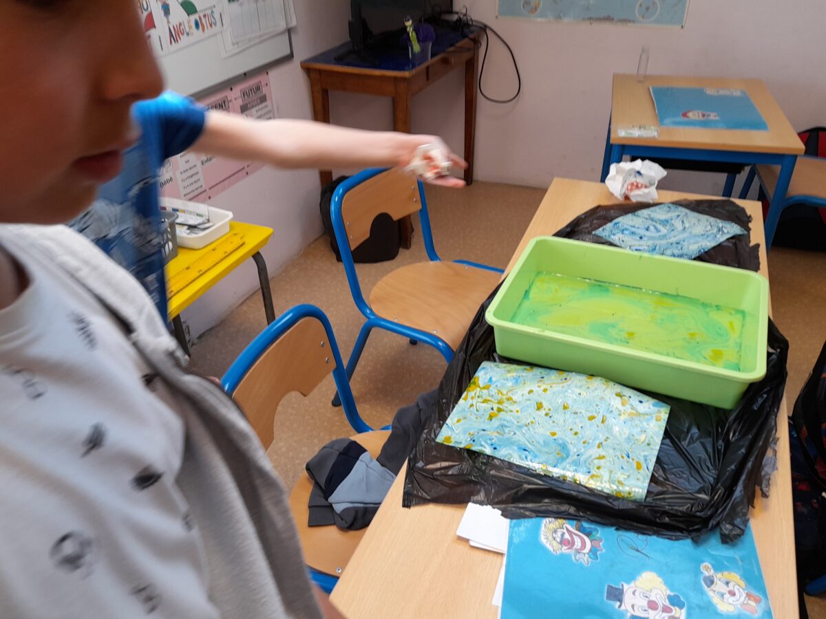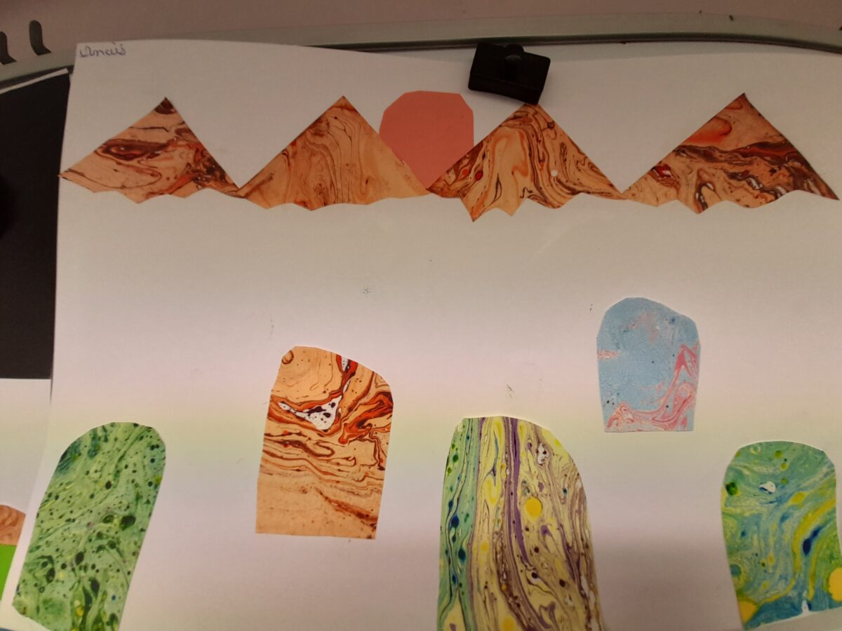 Jeudi 24 mars, Marta Orzel est venue dans notre classe. Elle s’est présentée, puis nous avons produit du papier marbré en utilisant la même technique qu’elle. Le lendemain, nous avons confectionné des paysages en utilisant ce papier marbré. C’était génial, on aurait dit de la magie. Voici une petite démonstration de Marta, puis un diaporama de nos productions et de cette belle rencontre.