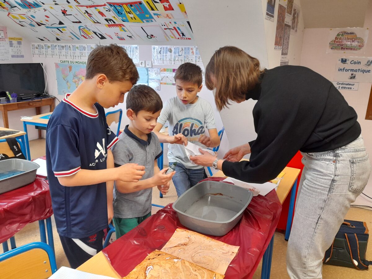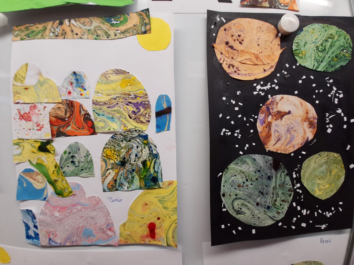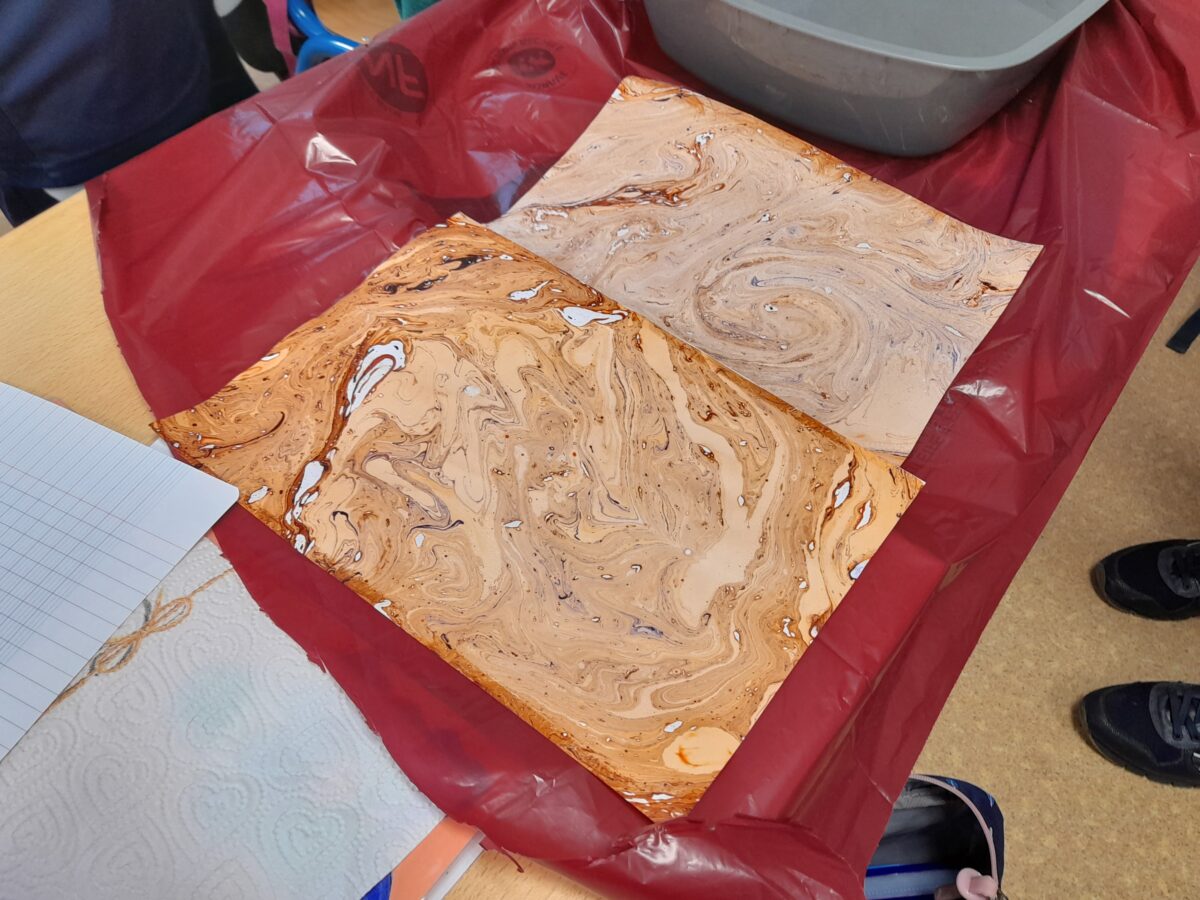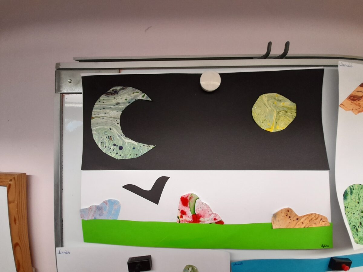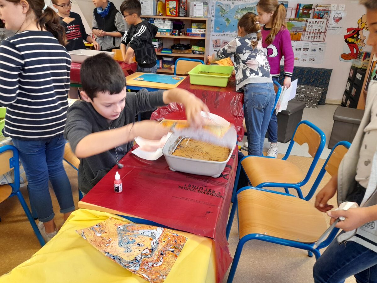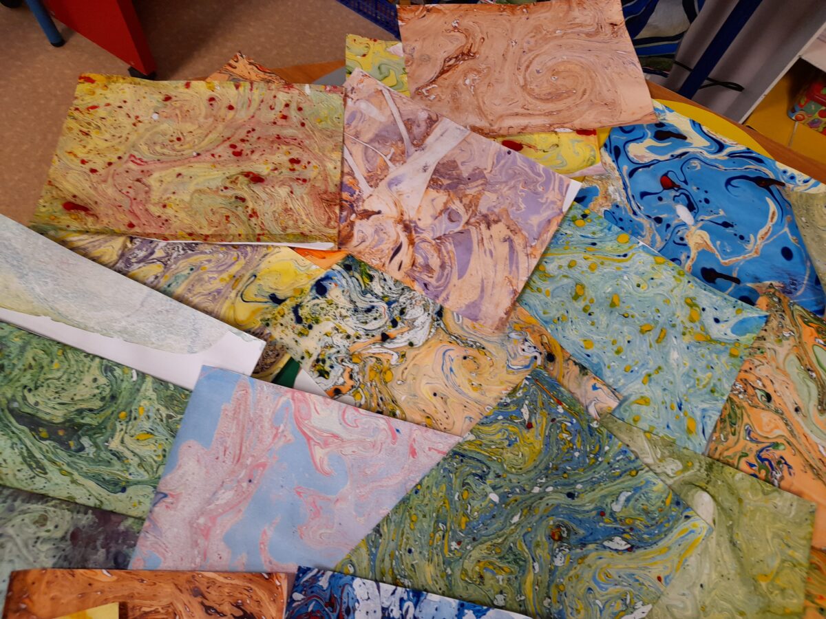 Jeudi 24 mars, Marta Orzel est venue dans notre classe. Elle s’est présentée, puis nous avons produit du papier marbré en utilisant la même technique qu’elle. Le lendemain, nous avons confectionné des paysages en utilisant ce papier marbré. C’était génial, on aurait dit de la magie. Voici une petite démonstration de Marta, puis un diaporama de nos productions et de cette belle rencontre.