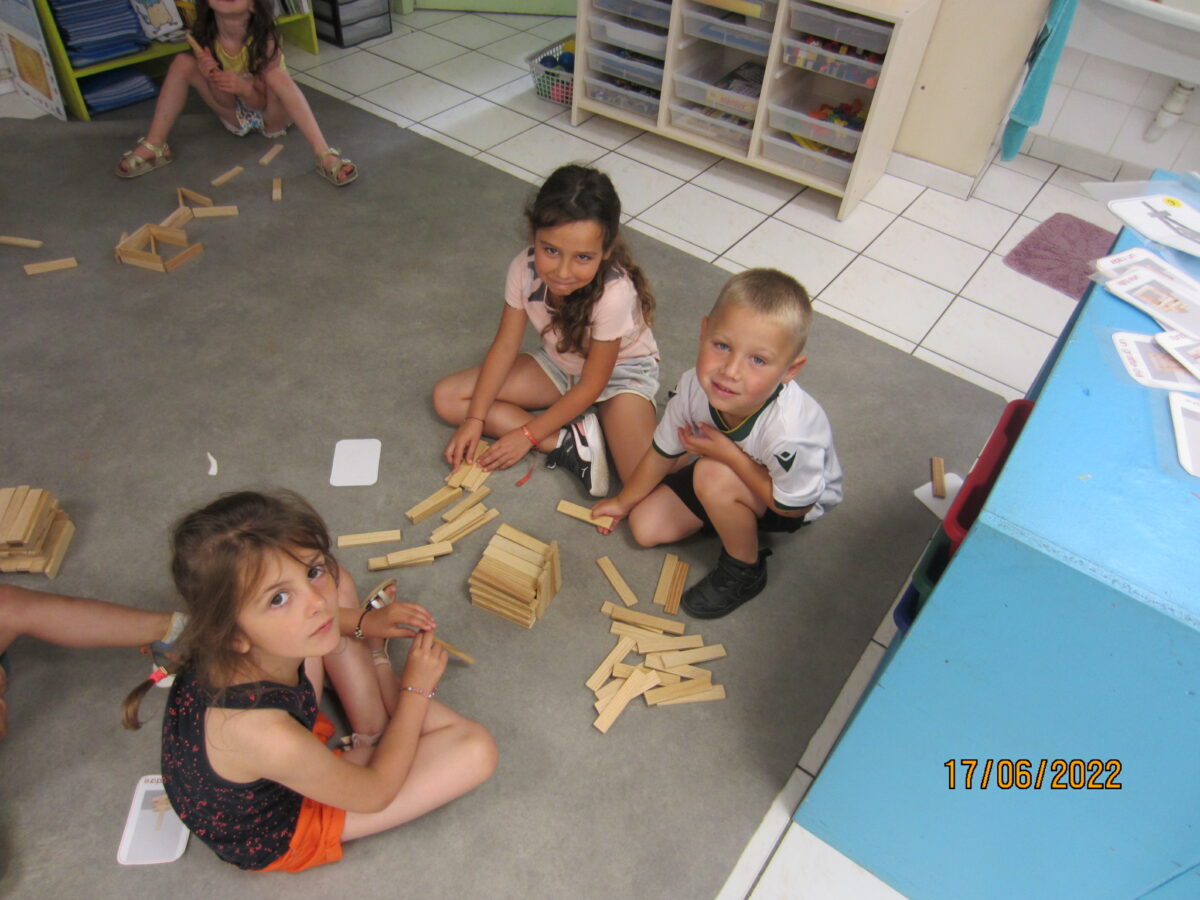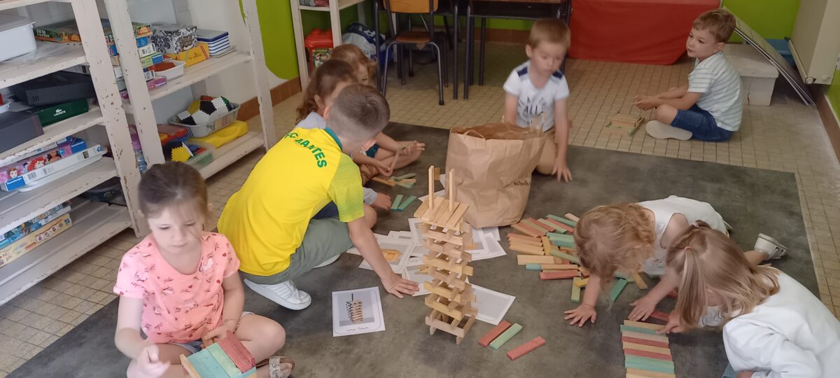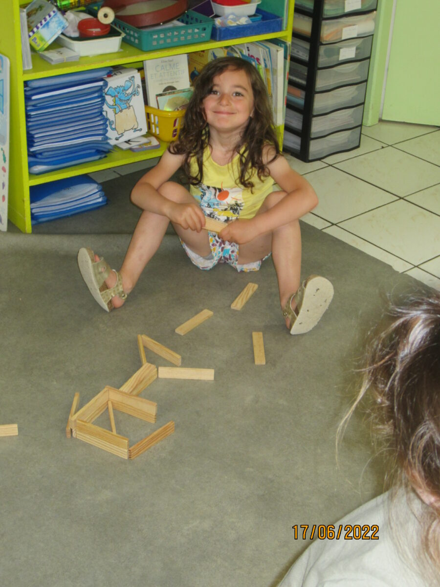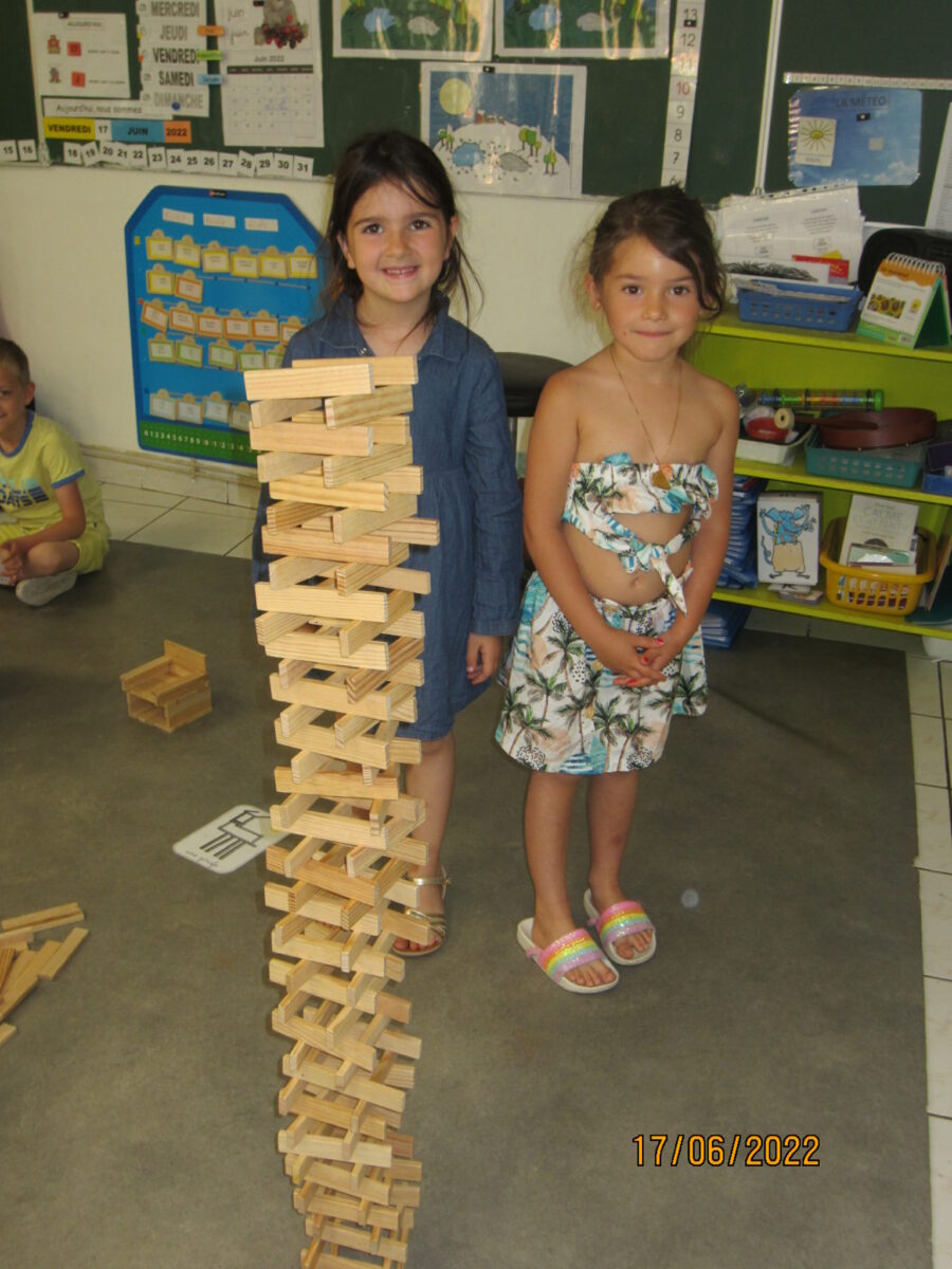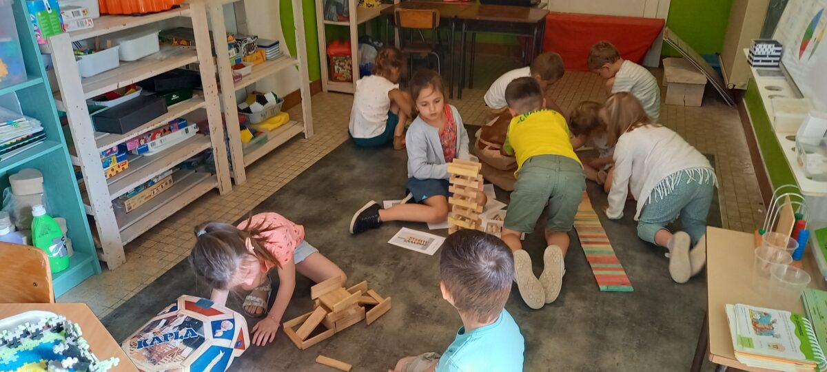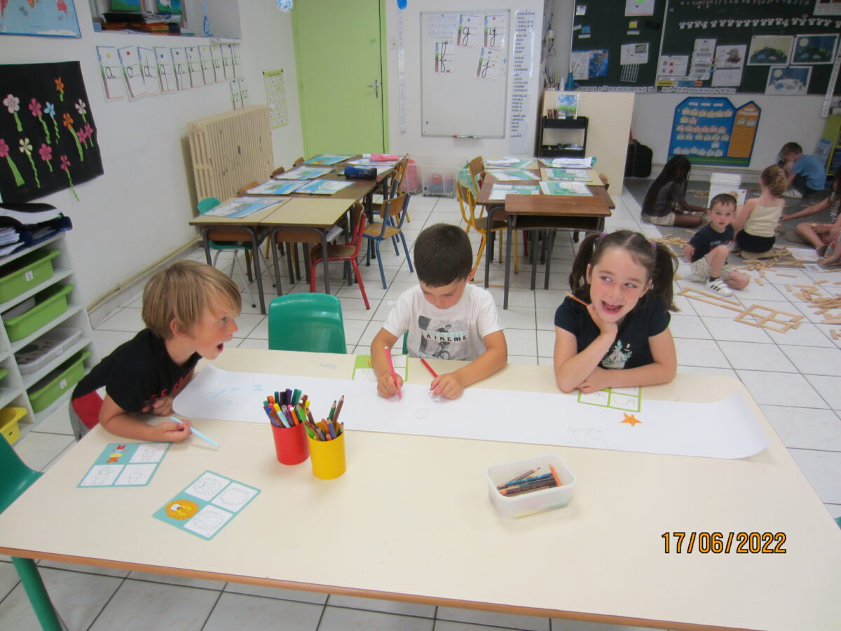« Les classes de PS, MS-GS et CP étaient mélangées. Nous avons fait plusieurs activités : des parcours d’échasses, des jeux avec de l’eau(transvasement), des dessins collectifs et des constructions avec des kaplas. Nous avons pique-niqué dans la cour et dans le coin calme. L’après-midi nous avons fait des jeux de société. »