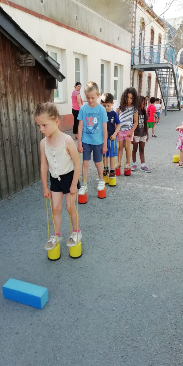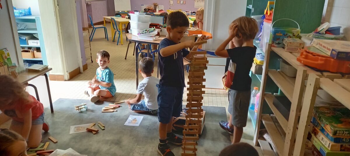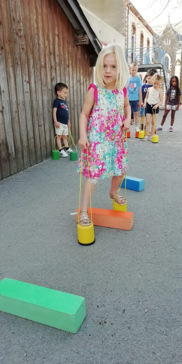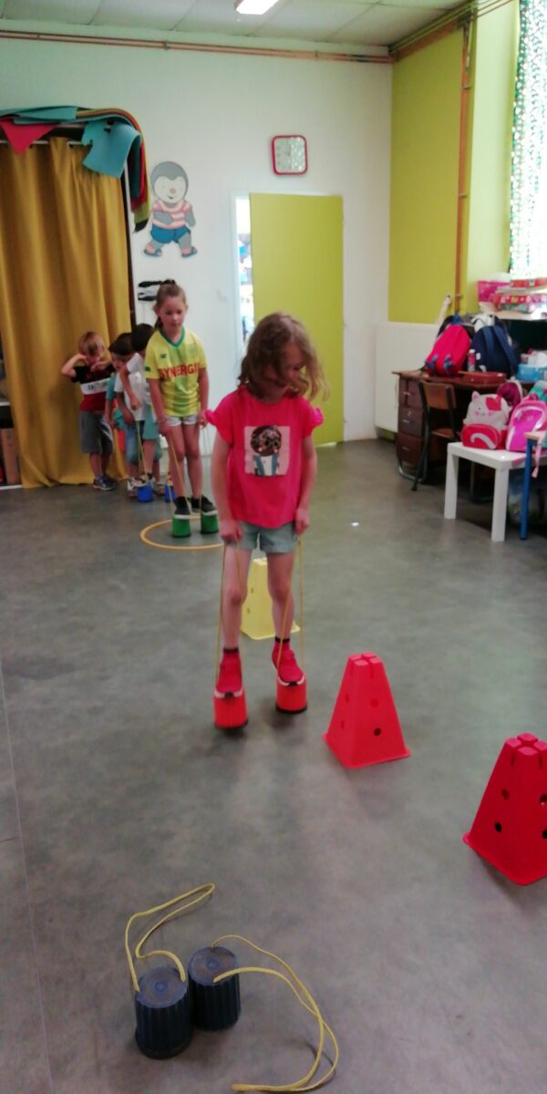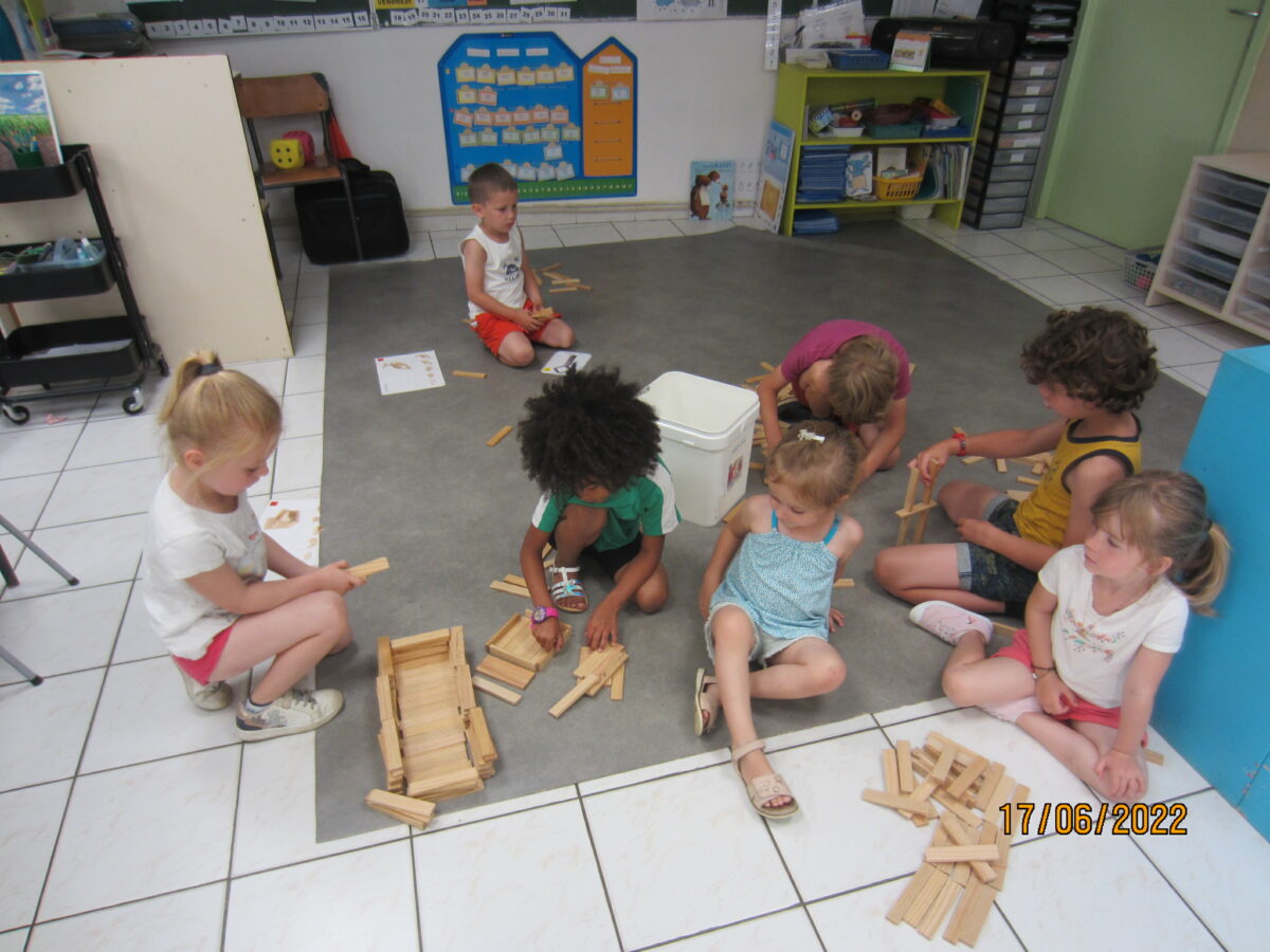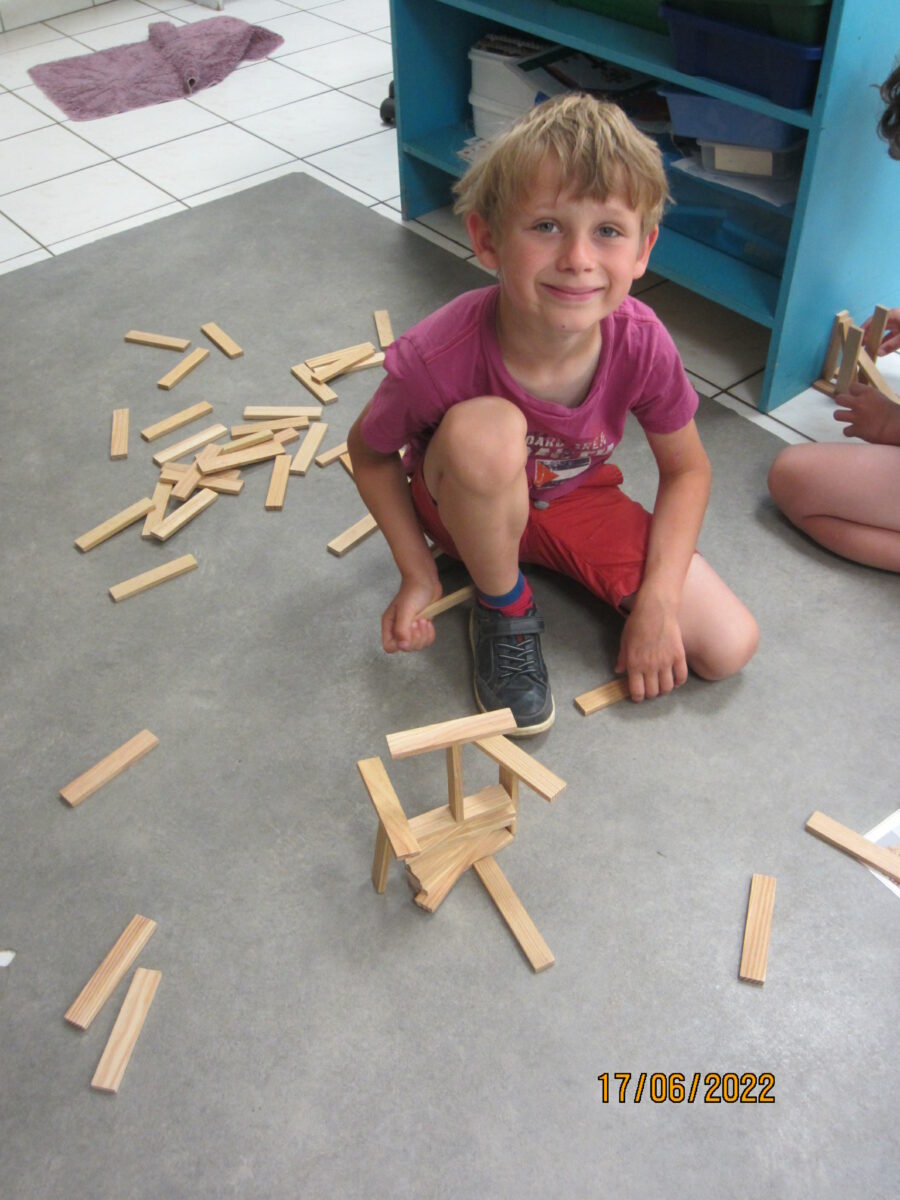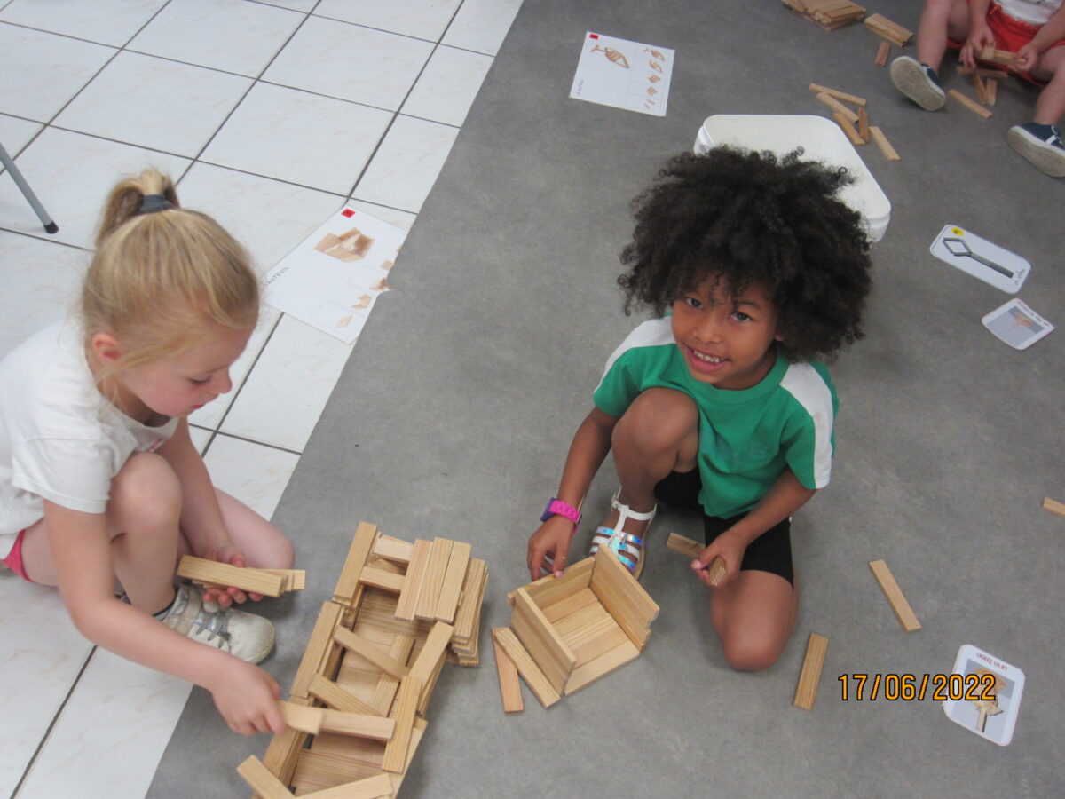 « Les classes de PS, MS-GS et CP étaient mélangées. Nous avons fait plusieurs activités : des parcours d’échasses, des jeux avec de l’eau(transvasement), des dessins collectifs et des constructions avec des kaplas. Nous avons pique-niqué dans la cour et dans le coin calme. L’après-midi nous avons fait des jeux de société. »