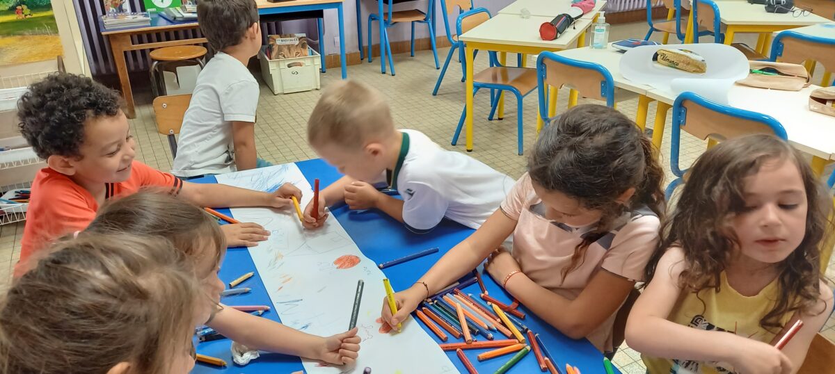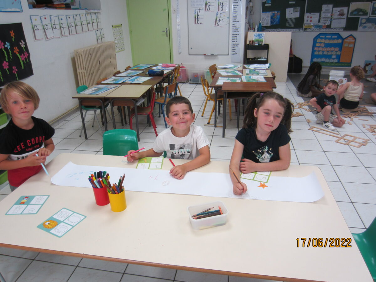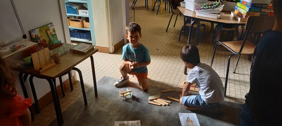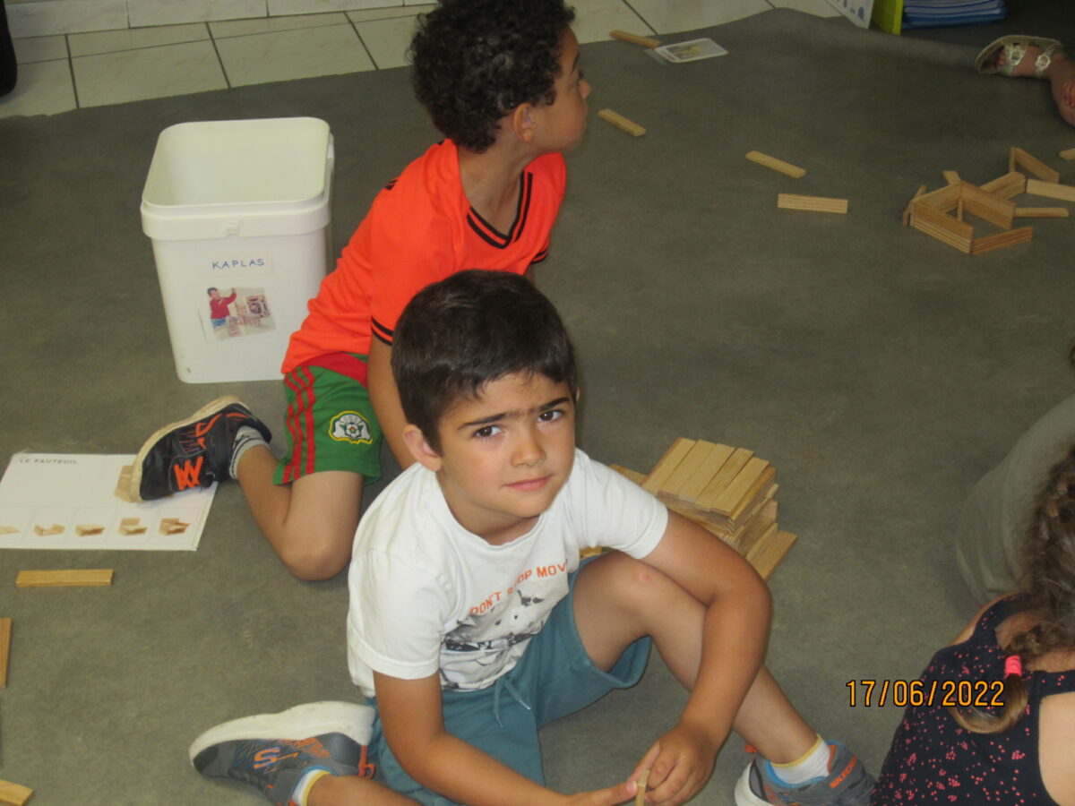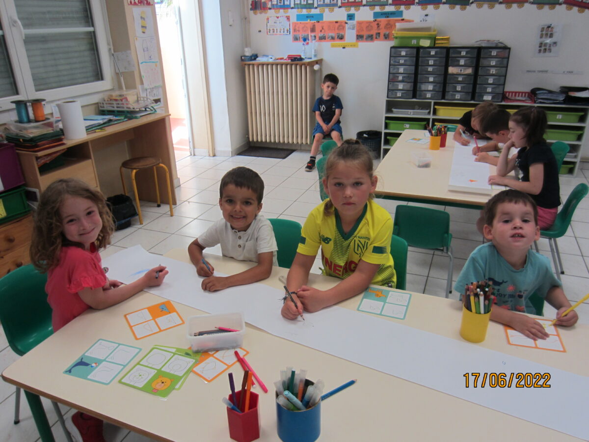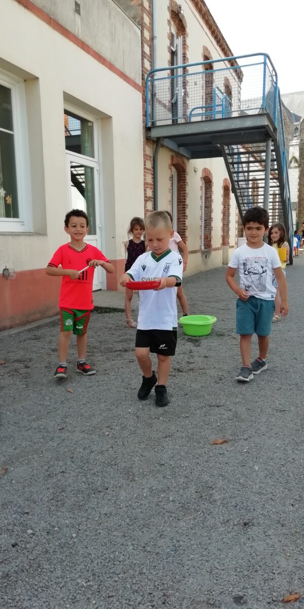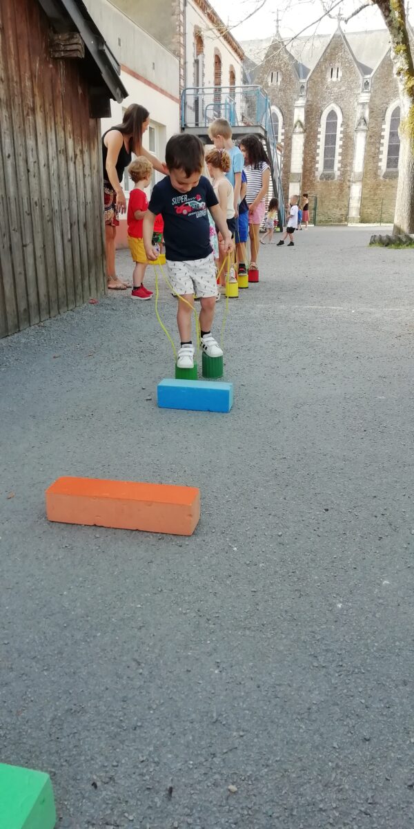 « Les classes de PS, MS-GS et CP étaient mélangées. Nous avons fait plusieurs activités : des parcours d’échasses, des jeux avec de l’eau(transvasement), des dessins collectifs et des constructions avec des kaplas. Nous avons pique-niqué dans la cour et dans le coin calme. L’après-midi nous avons fait des jeux de société. »