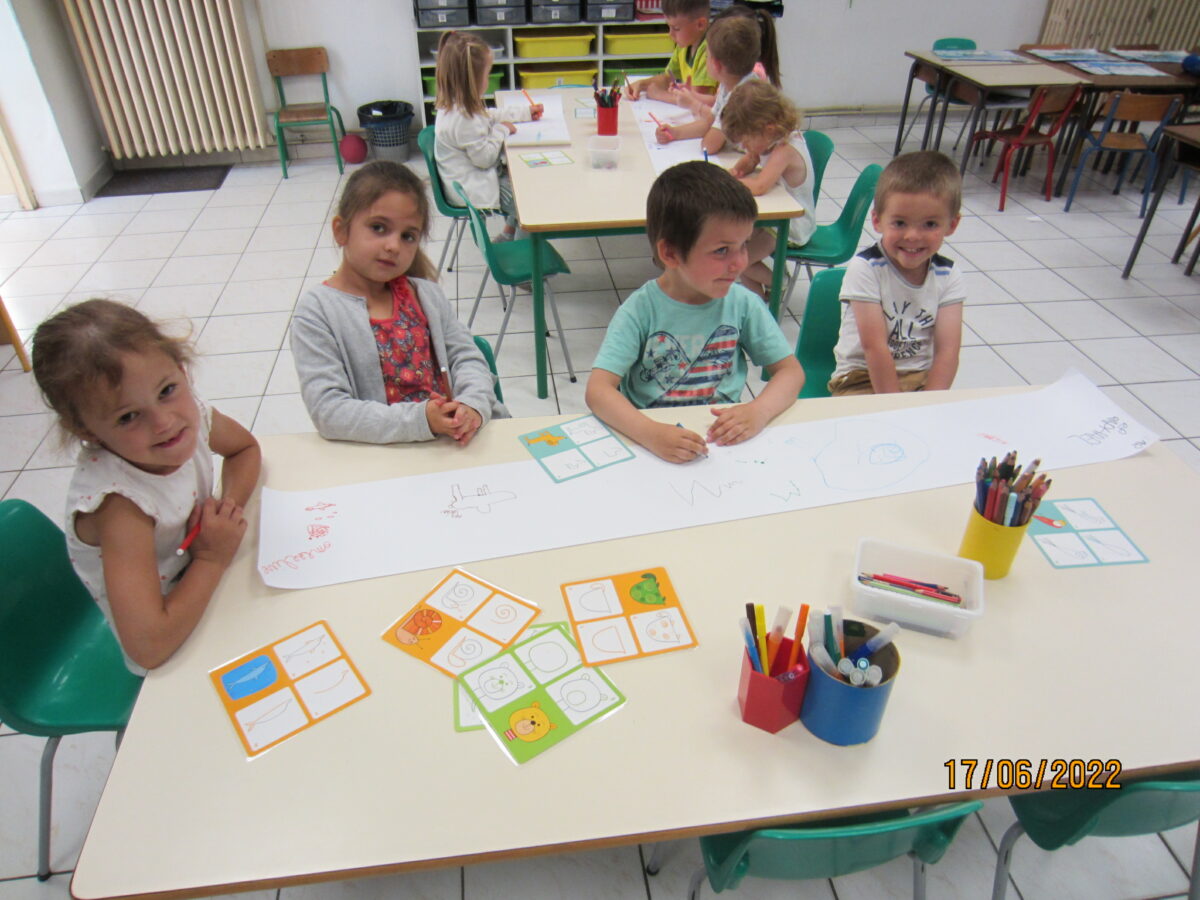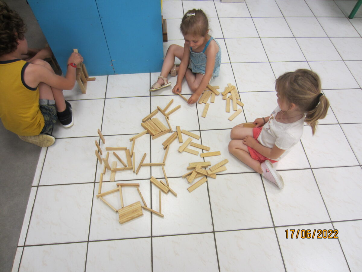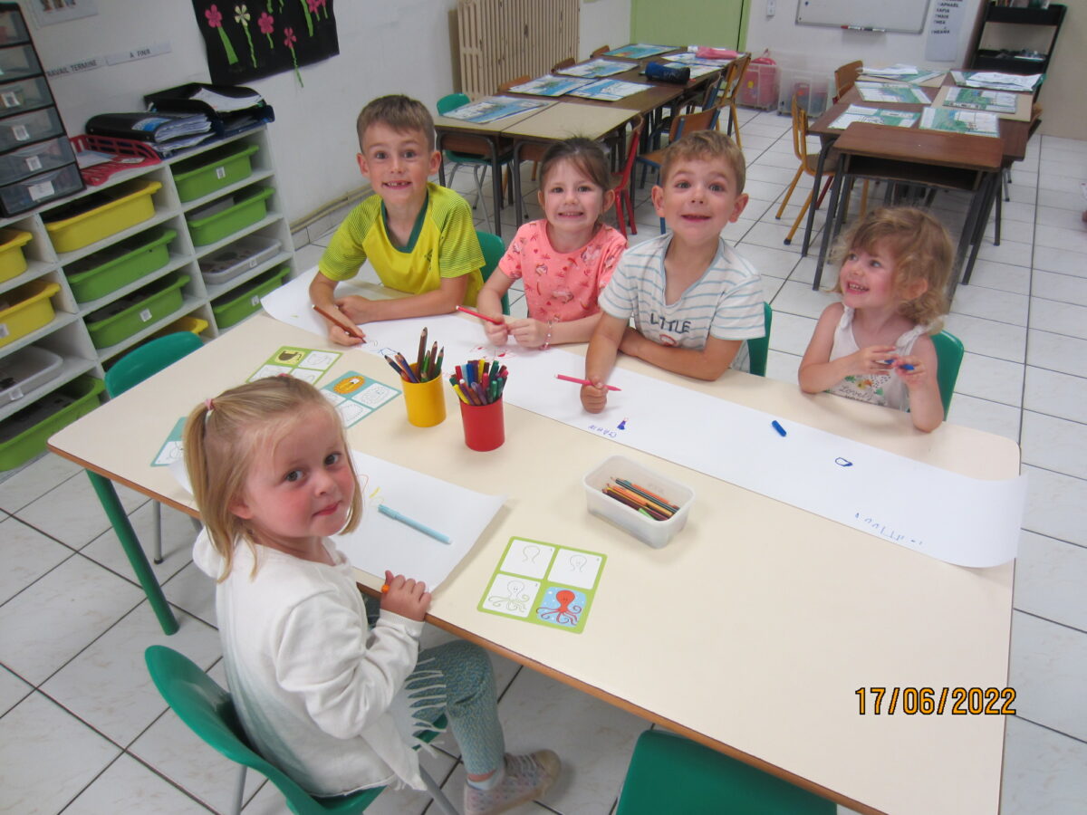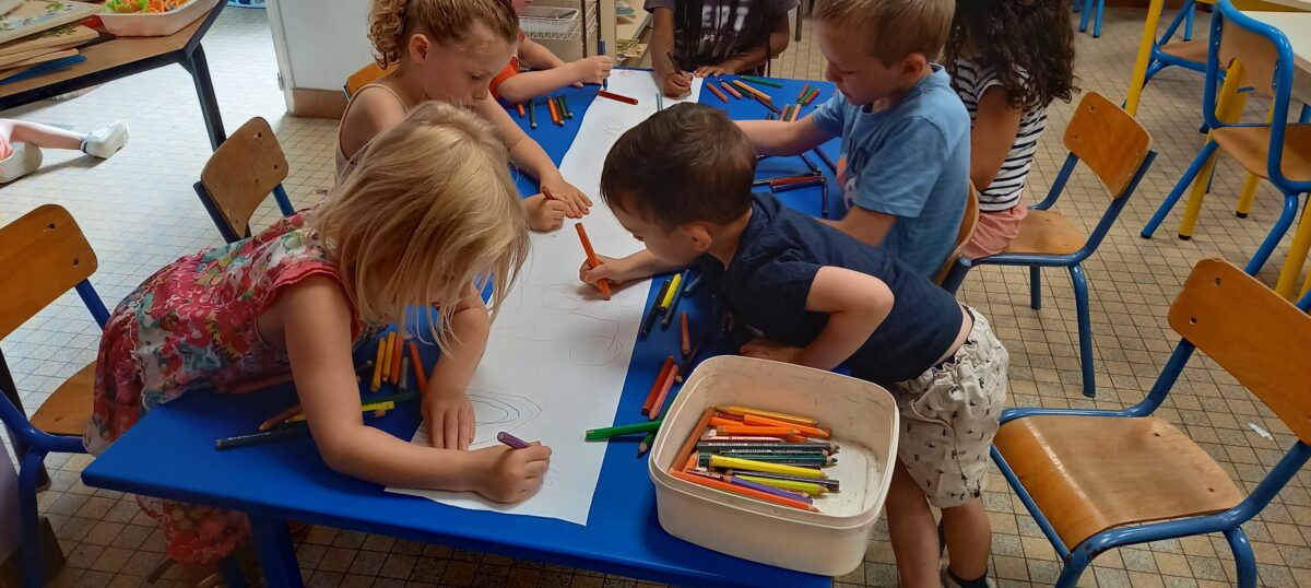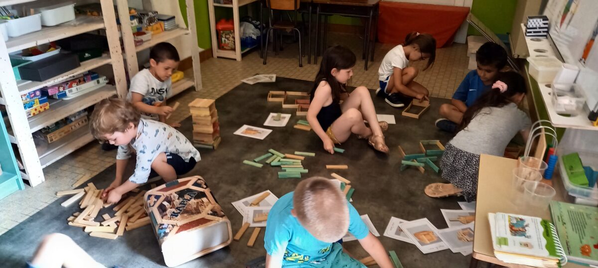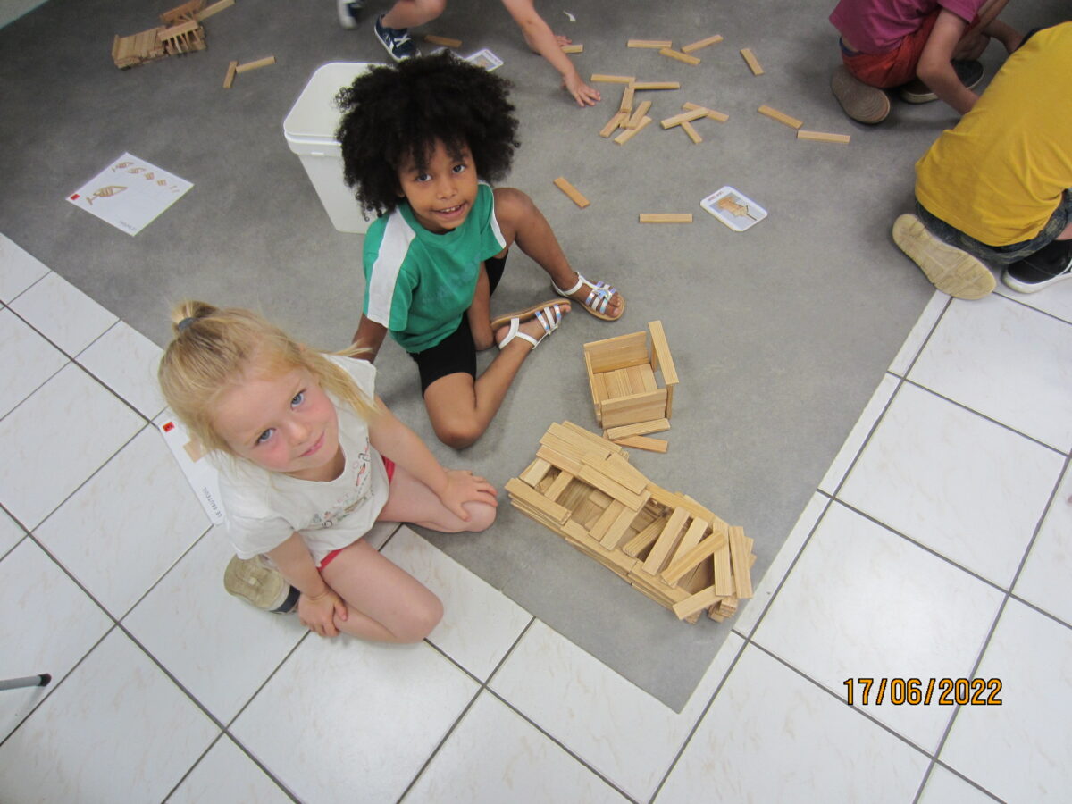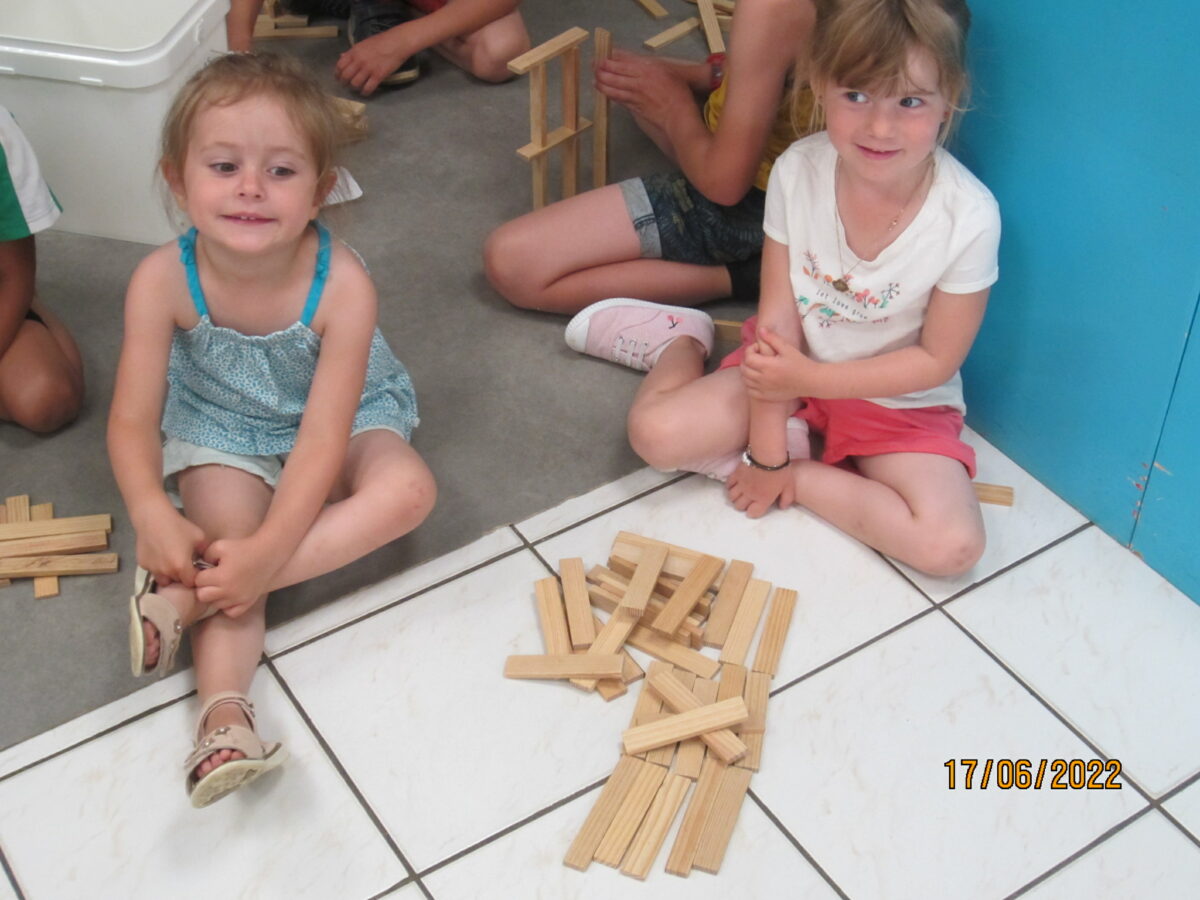 « Les classes de PS, MS-GS et CP étaient mélangées. Nous avons fait plusieurs activités : des parcours d’échasses, des jeux avec de l’eau(transvasement), des dessins collectifs et des constructions avec des kaplas. Nous avons pique-niqué dans la cour et dans le coin calme. L’après-midi nous avons fait des jeux de société. »