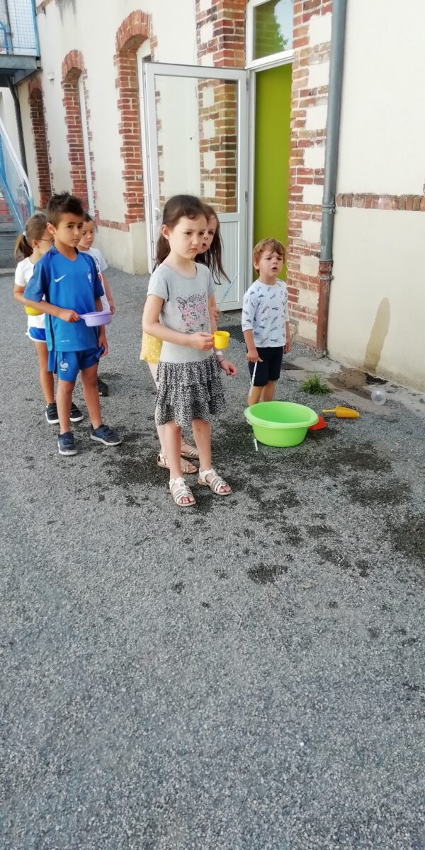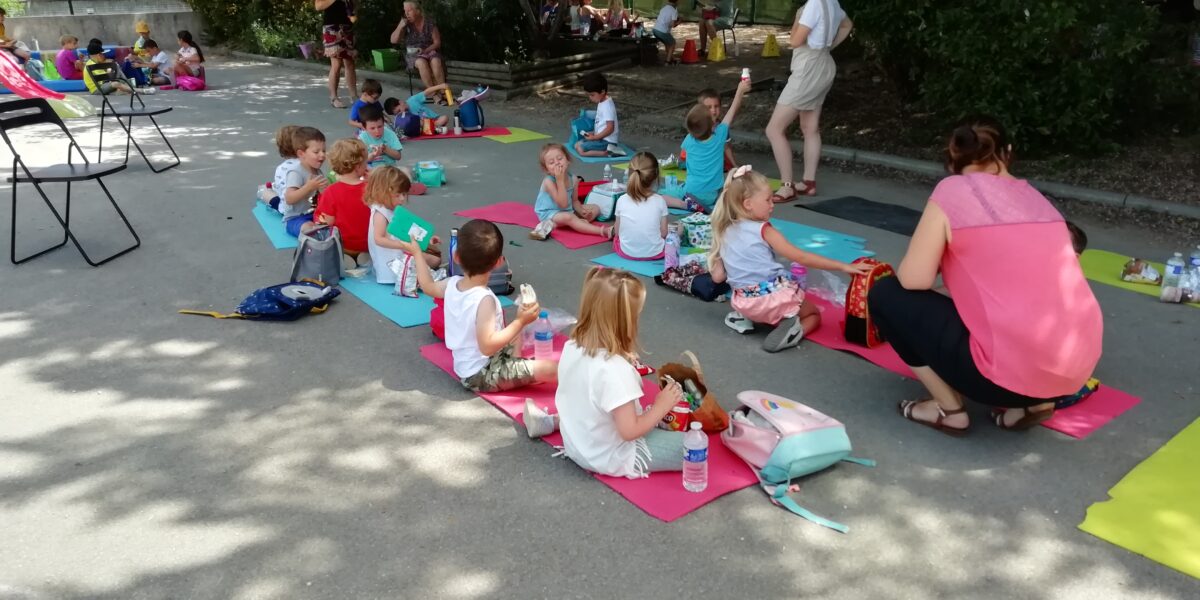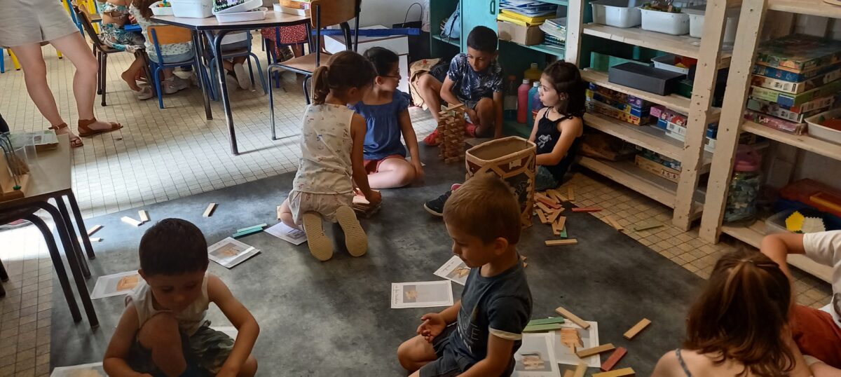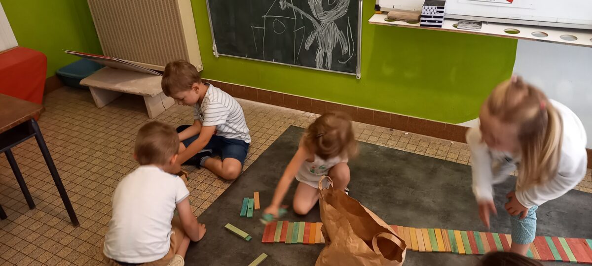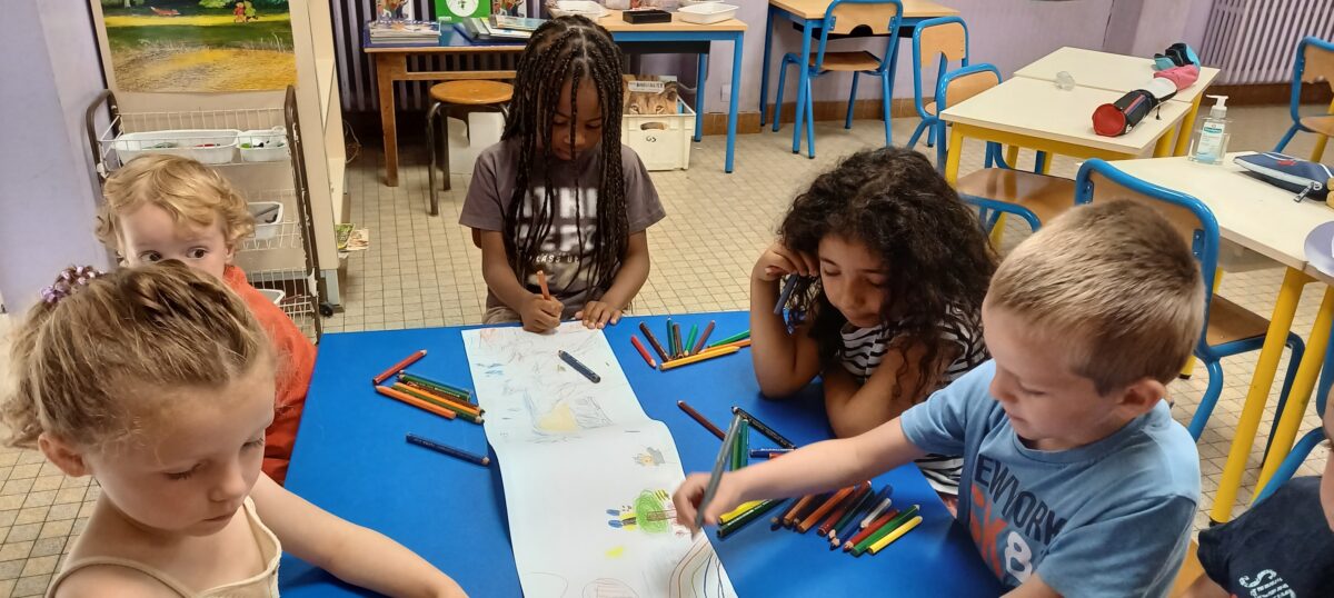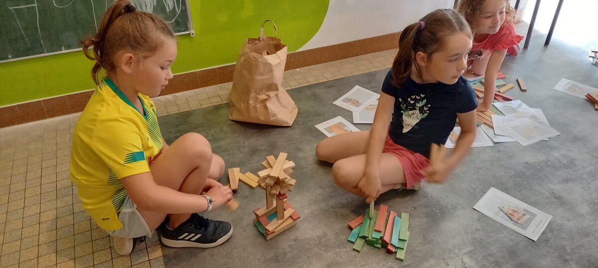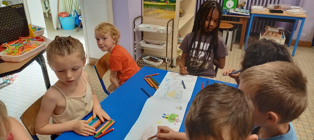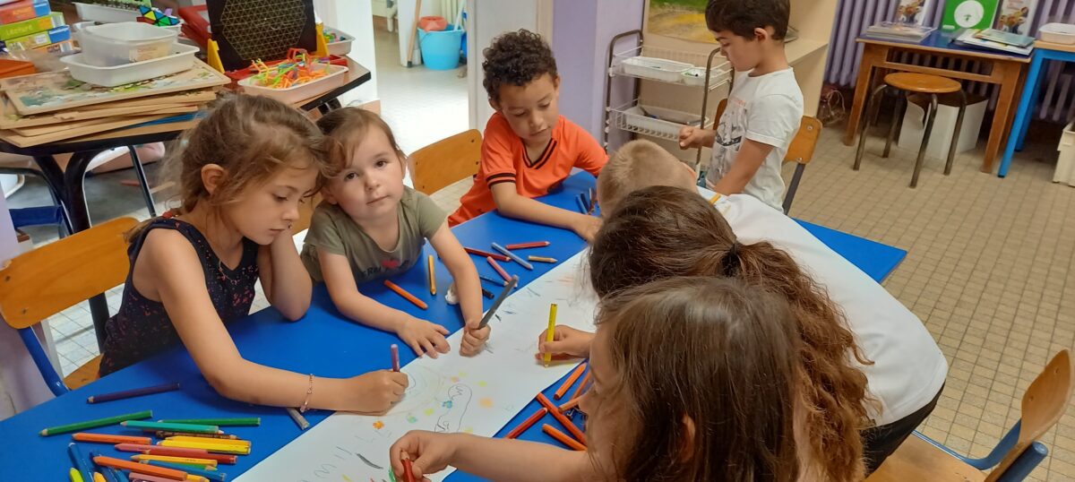 « Les classes de PS, MS-GS et CP étaient mélangées. Nous avons fait plusieurs activités : des parcours d’échasses, des jeux avec de l’eau(transvasement), des dessins collectifs et des constructions avec des kaplas. Nous avons pique-niqué dans la cour et dans le coin calme. L’après-midi nous avons fait des jeux de société. »