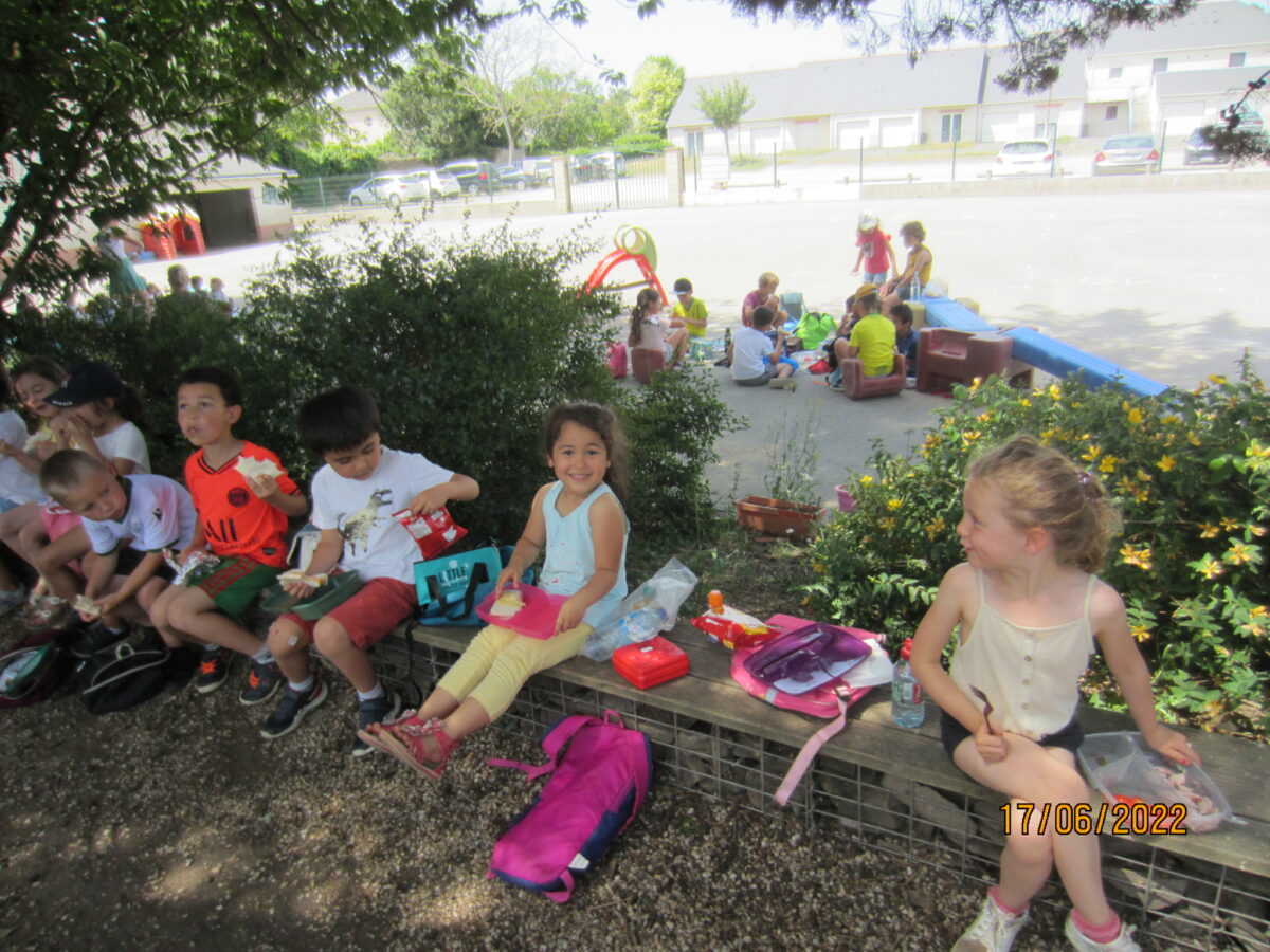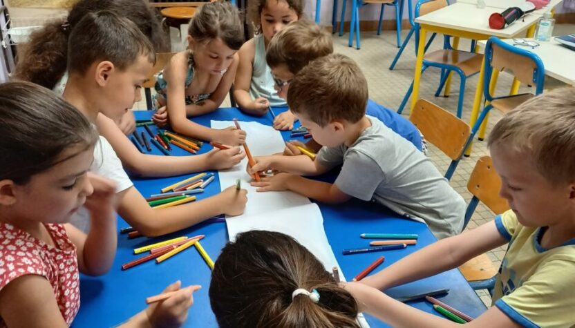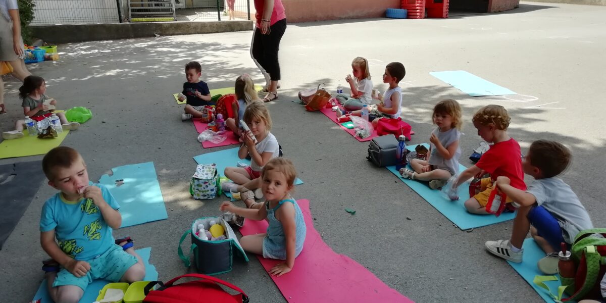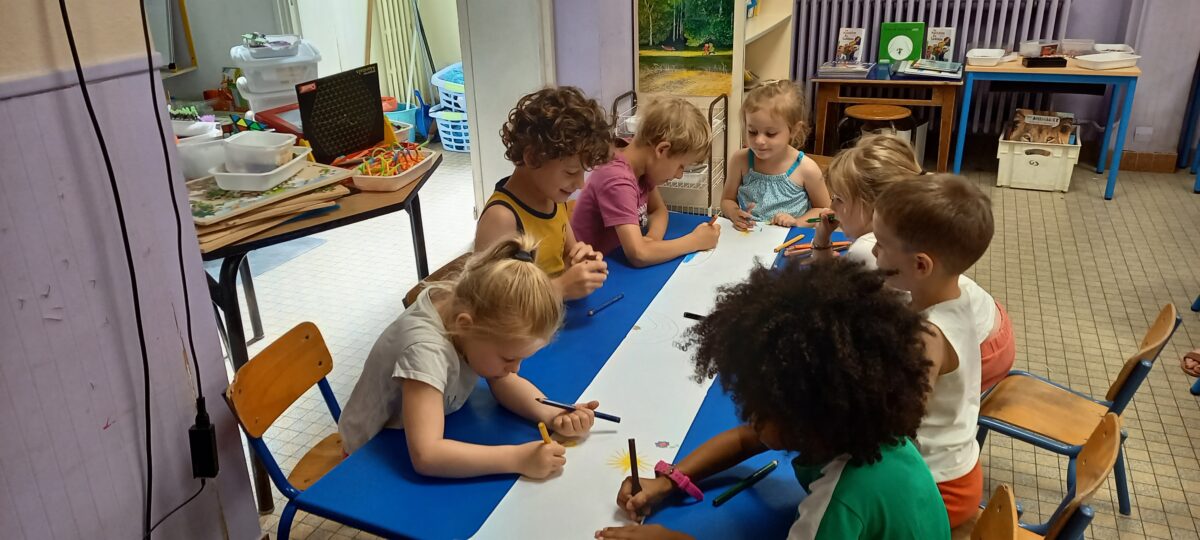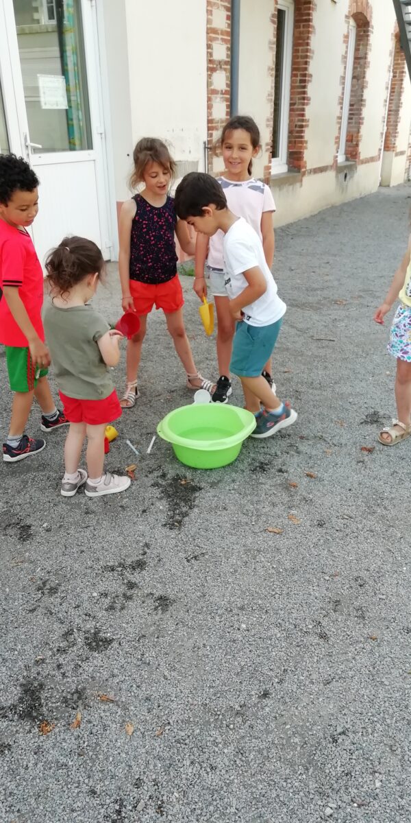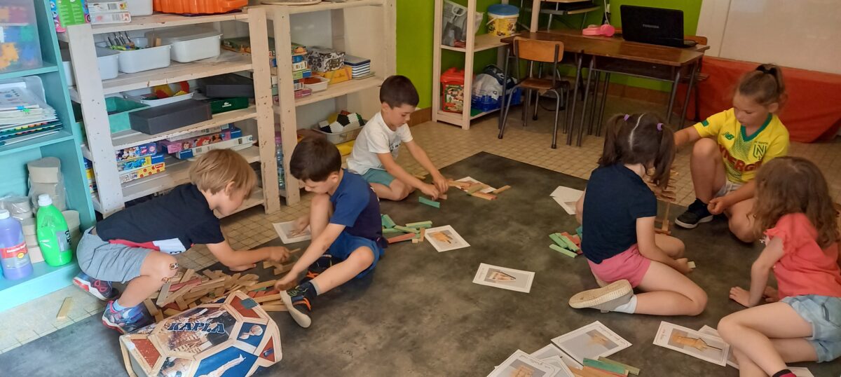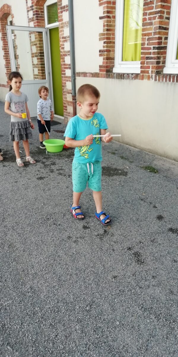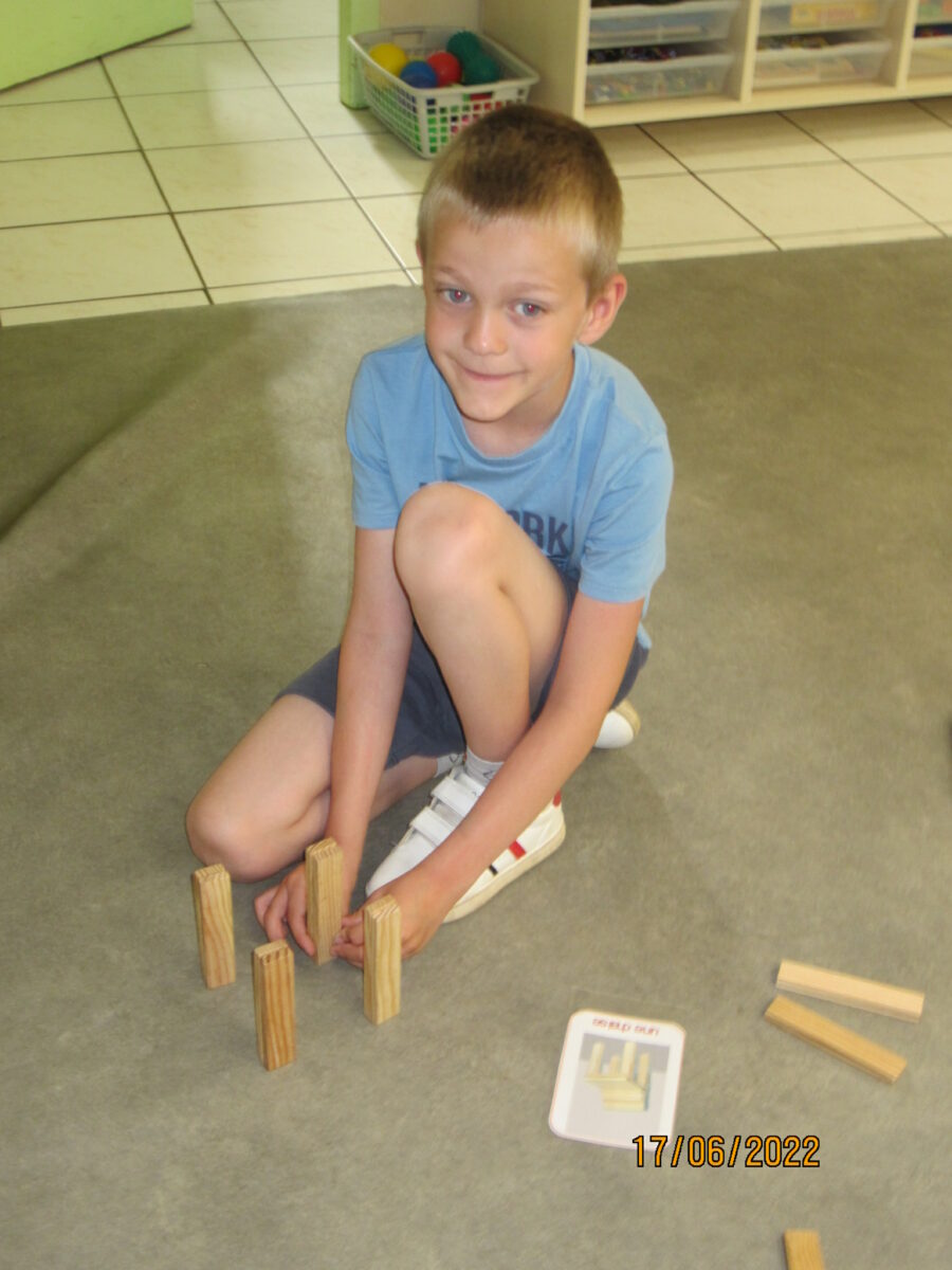 « Les classes de PS, MS-GS et CP étaient mélangées. Nous avons fait plusieurs activités : des parcours d’échasses, des jeux avec de l’eau(transvasement), des dessins collectifs et des constructions avec des kaplas. Nous avons pique-niqué dans la cour et dans le coin calme. L’après-midi nous avons fait des jeux de société. »
