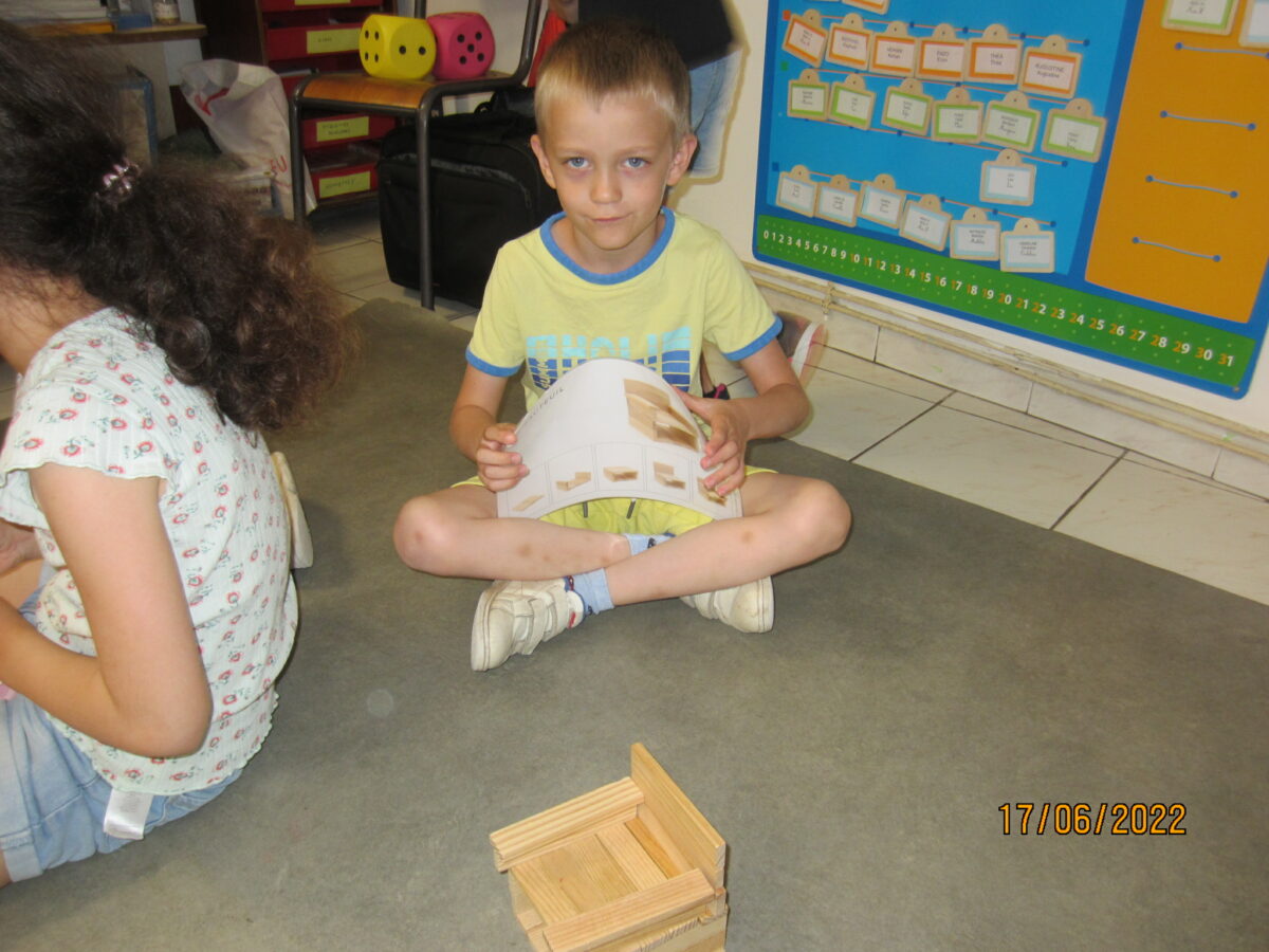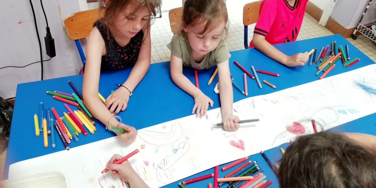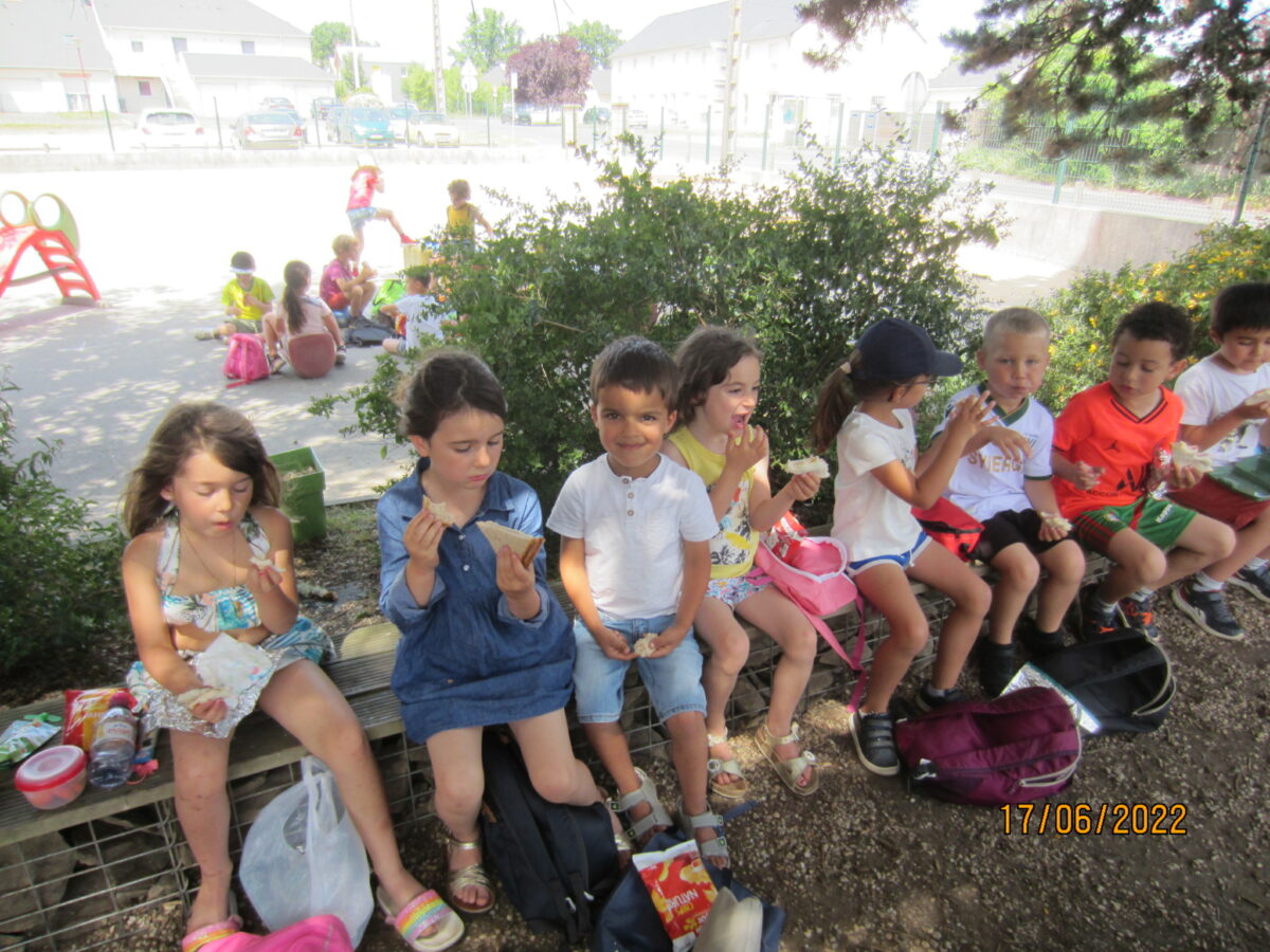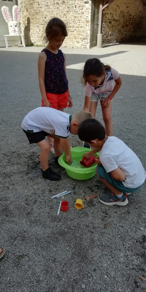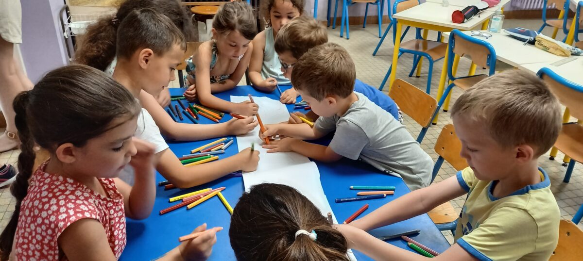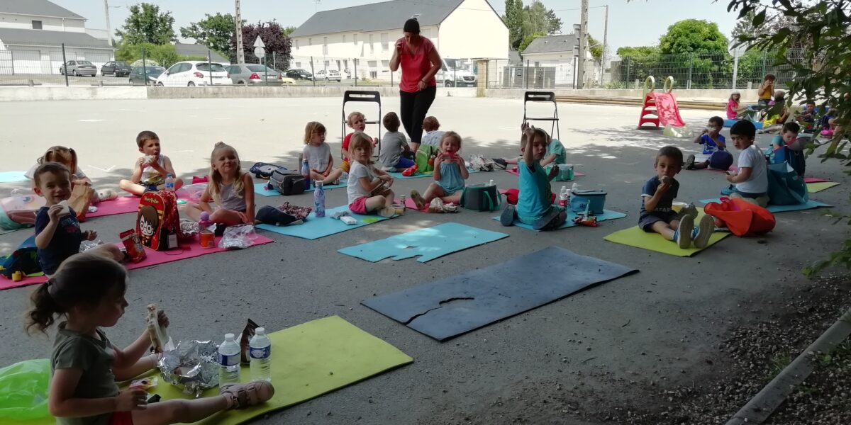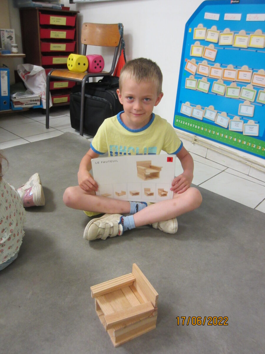 « Les classes de PS, MS-GS et CP étaient mélangées. Nous avons fait plusieurs activités : des parcours d’échasses, des jeux avec de l’eau(transvasement), des dessins collectifs et des constructions avec des kaplas. Nous avons pique-niqué dans la cour et dans le coin calme. L’après-midi nous avons fait des jeux de société. »