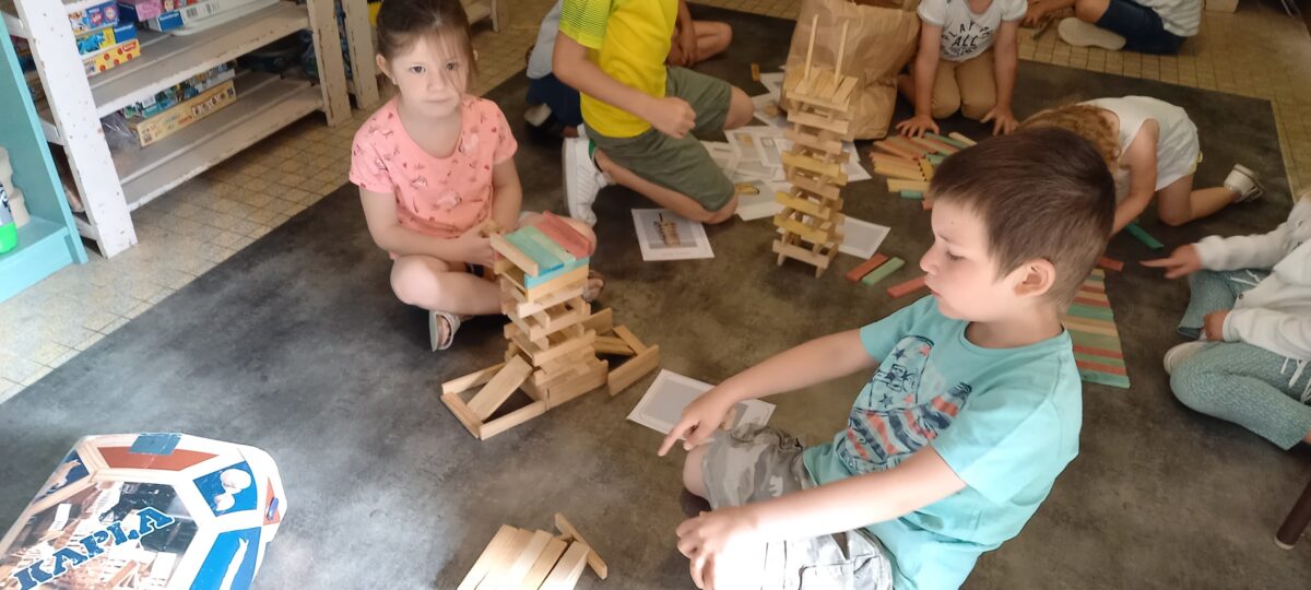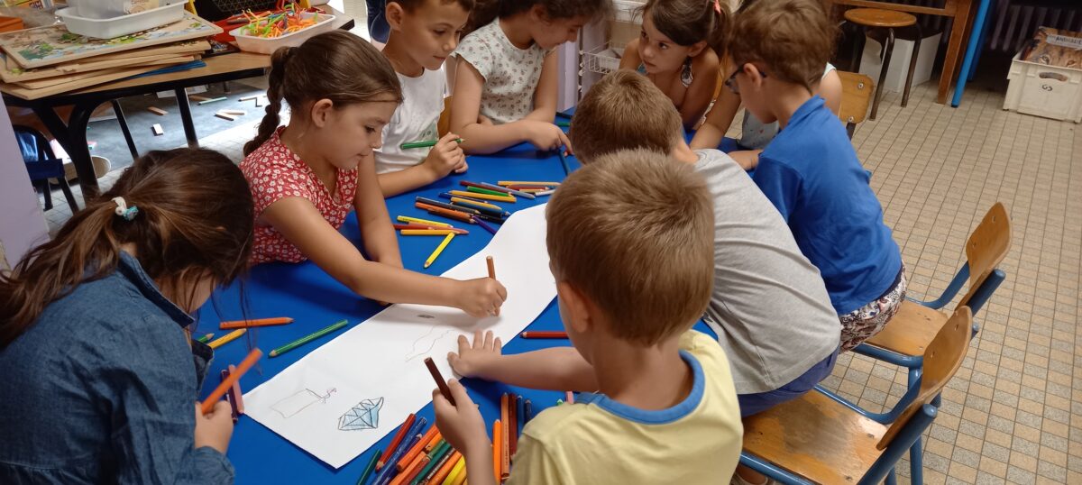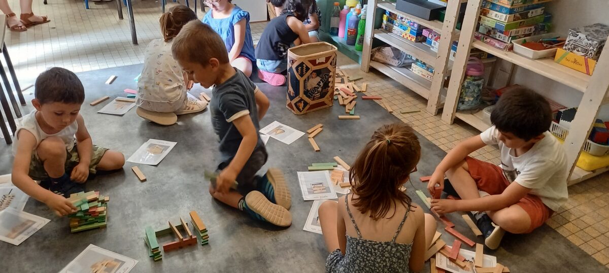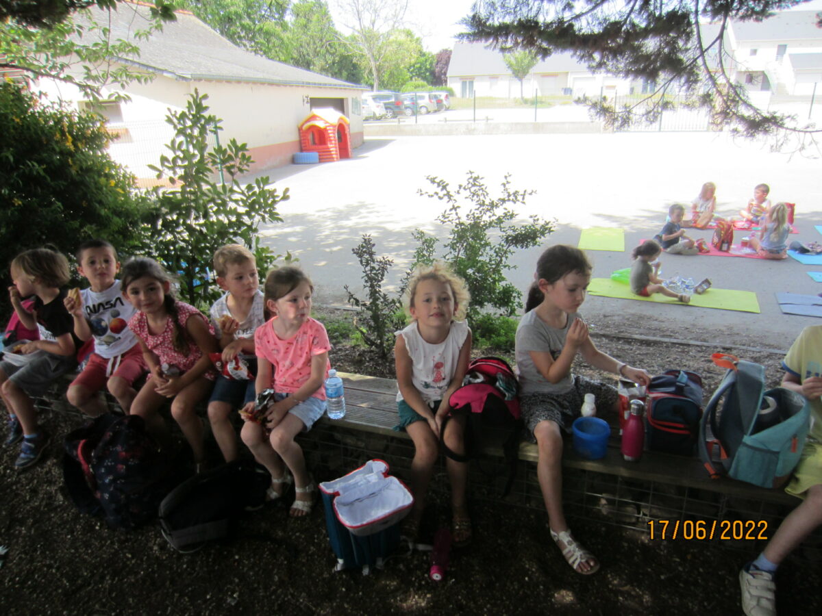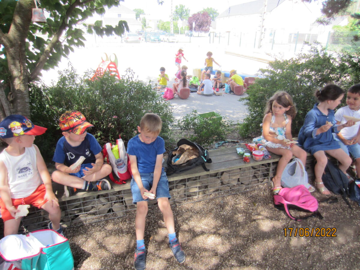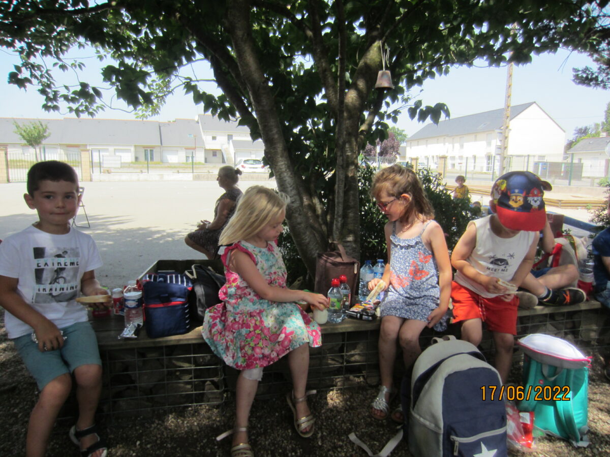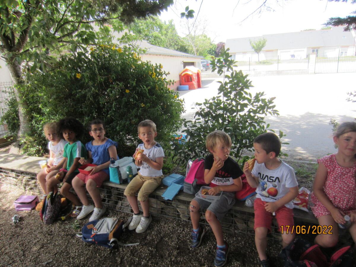 « Les classes de PS, MS-GS et CP étaient mélangées. Nous avons fait plusieurs activités : des parcours d’échasses, des jeux avec de l’eau(transvasement), des dessins collectifs et des constructions avec des kaplas. Nous avons pique-niqué dans la cour et dans le coin calme. L’après-midi nous avons fait des jeux de société. »