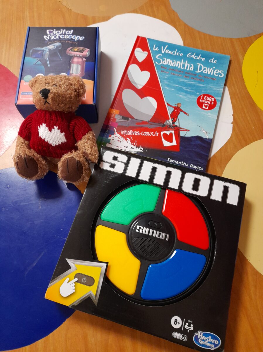 Lors de l’arbre de Noël, la classe a reçu des cadeaux du Père-Noël lui-même : un simon (jeu de mémorisation), la bande dessinée de Sam Davies, le petit ourson d’Initiatives Coeur (souvenir de la course du rhum), un microscope numérique.