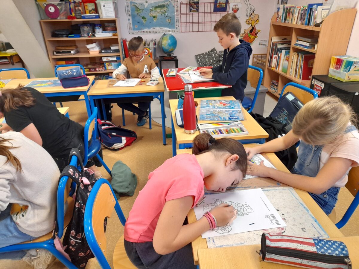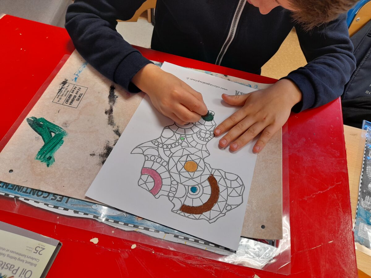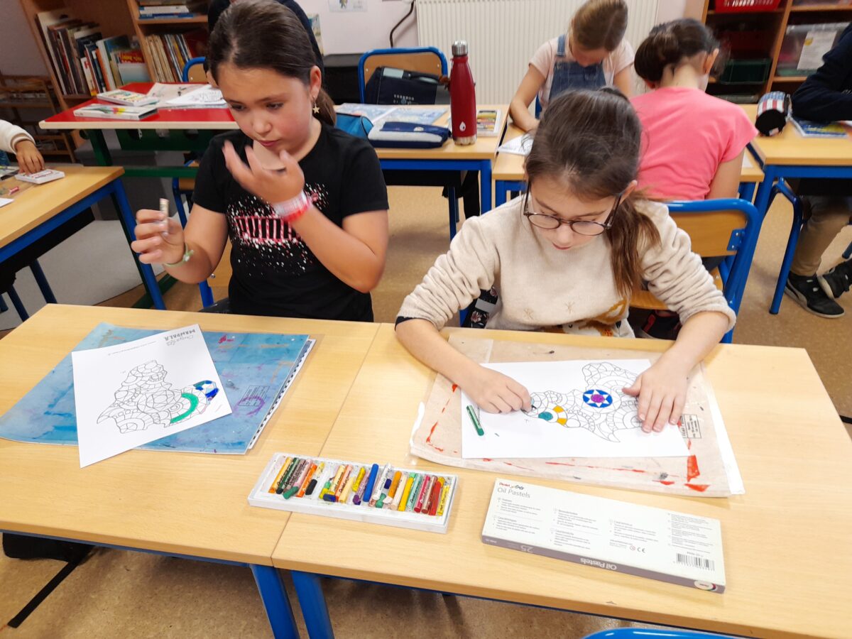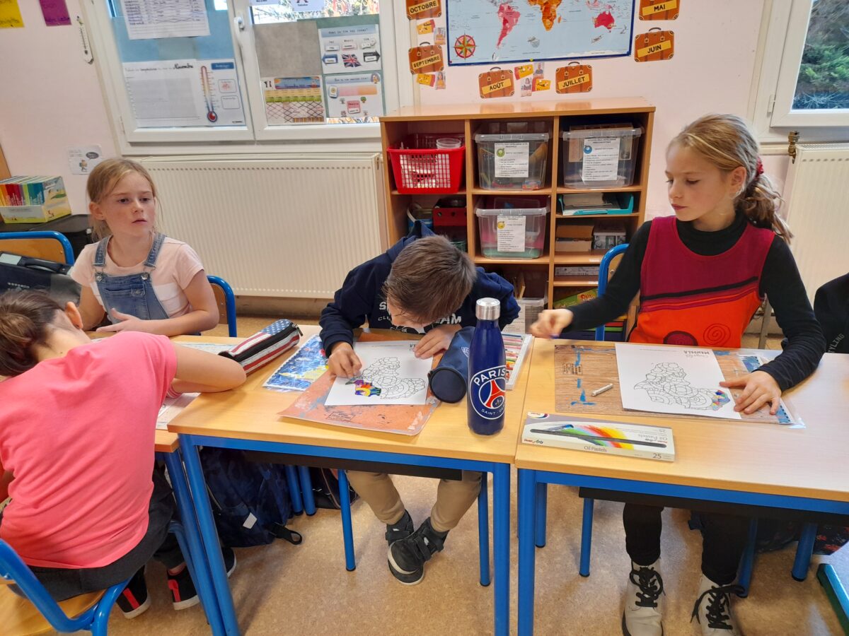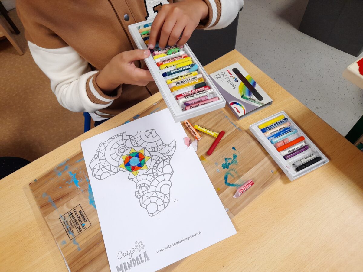 En arts visuels, les CM1 ont travaillé avec deux sortes d’outils, pour mettre de la couleur à l’Afrique : l’encre et les pastels à la cire.
