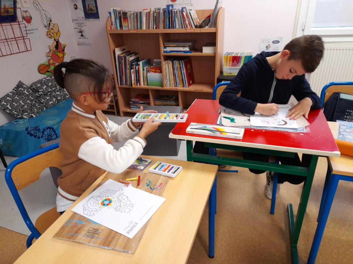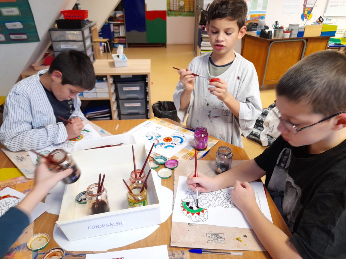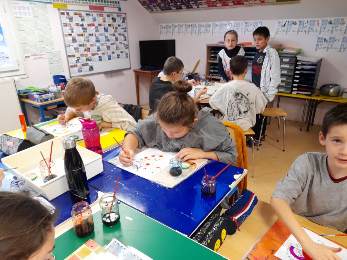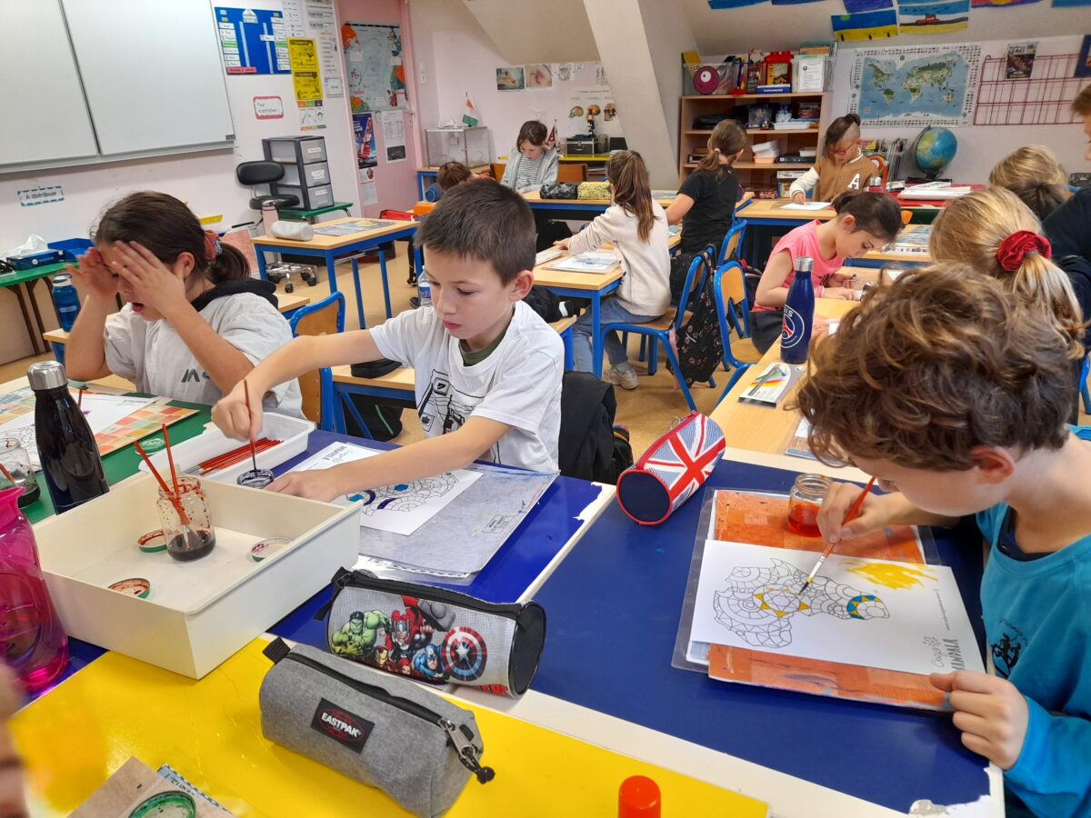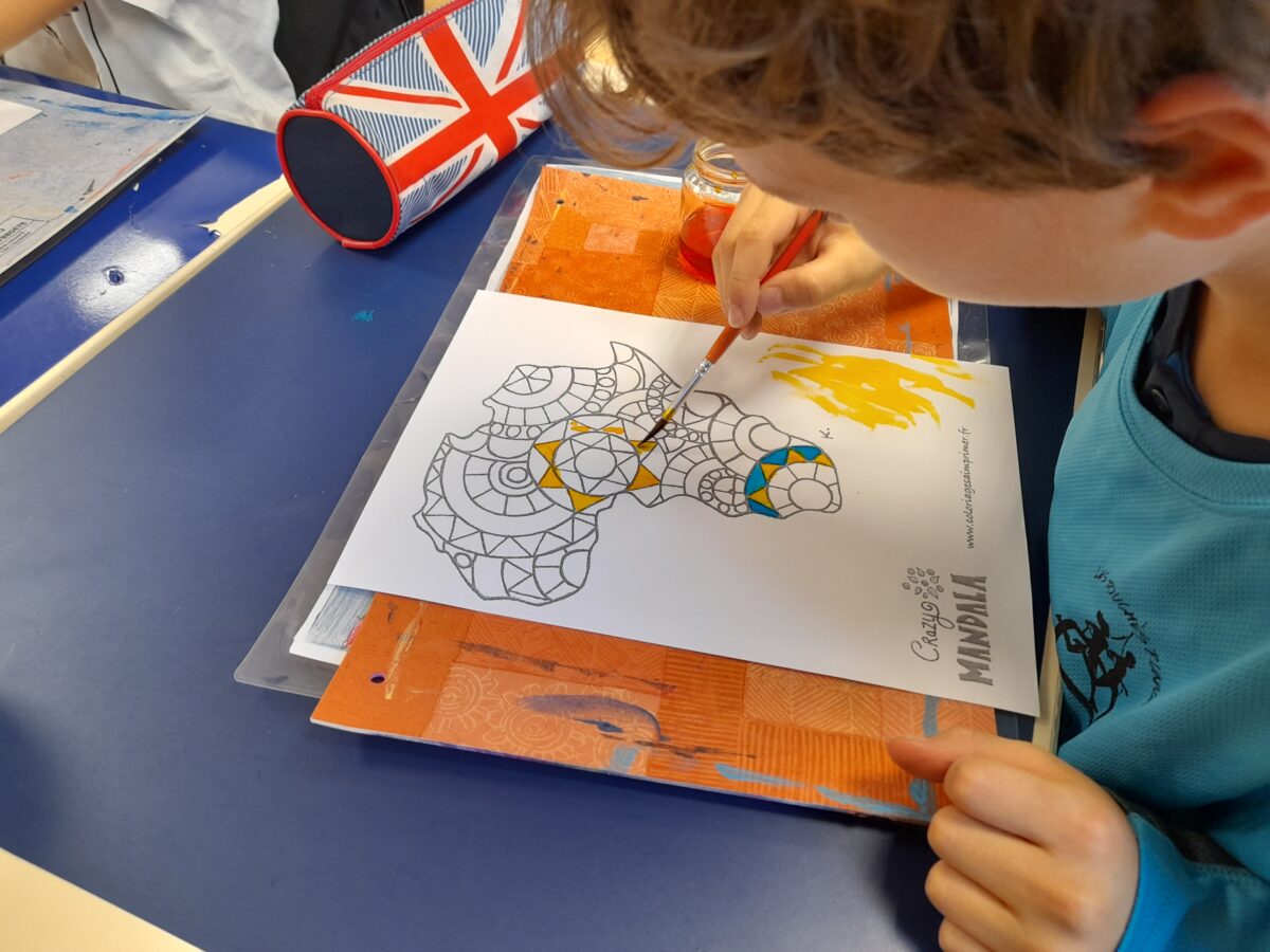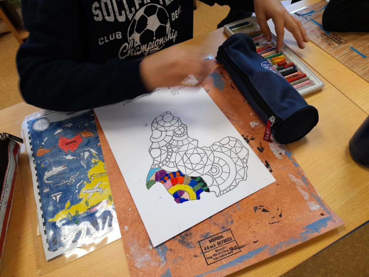 En arts visuels, les CM1 ont travaillé avec deux sortes d’outils, pour mettre de la couleur à l’Afrique : l’encre et les pastels à la cire.