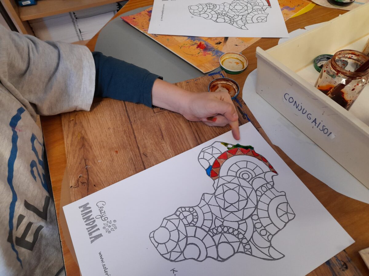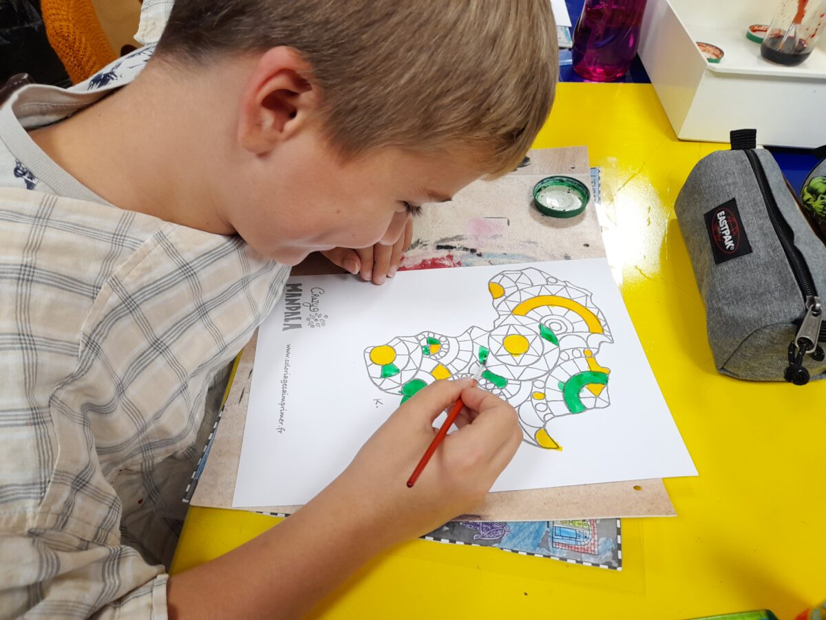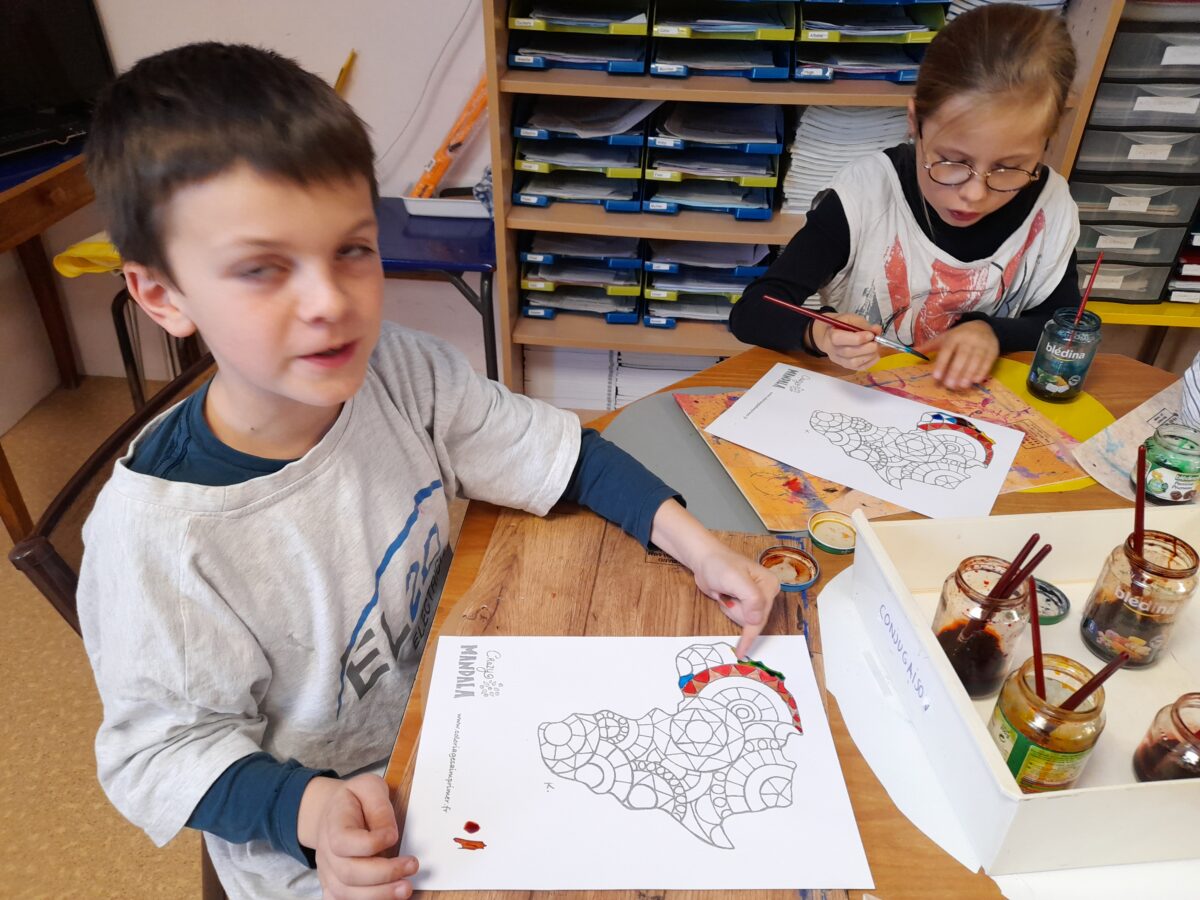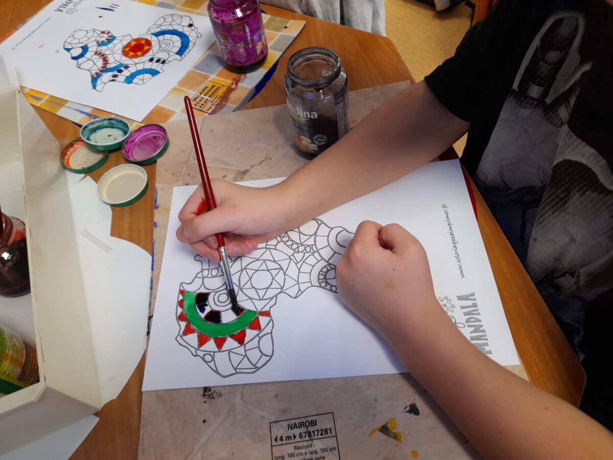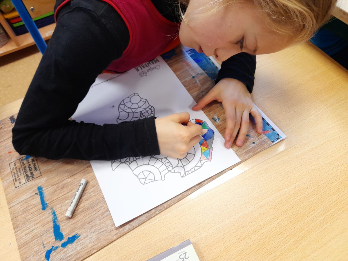 En arts visuels, les CM1 ont travaillé avec deux sortes d’outils, pour mettre de la couleur à l’Afrique : l’encre et les pastels à la cire.
