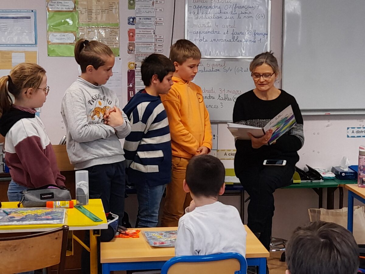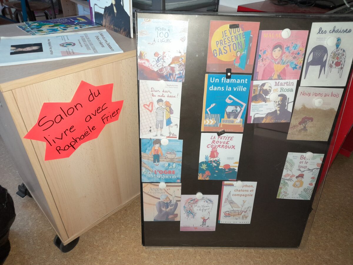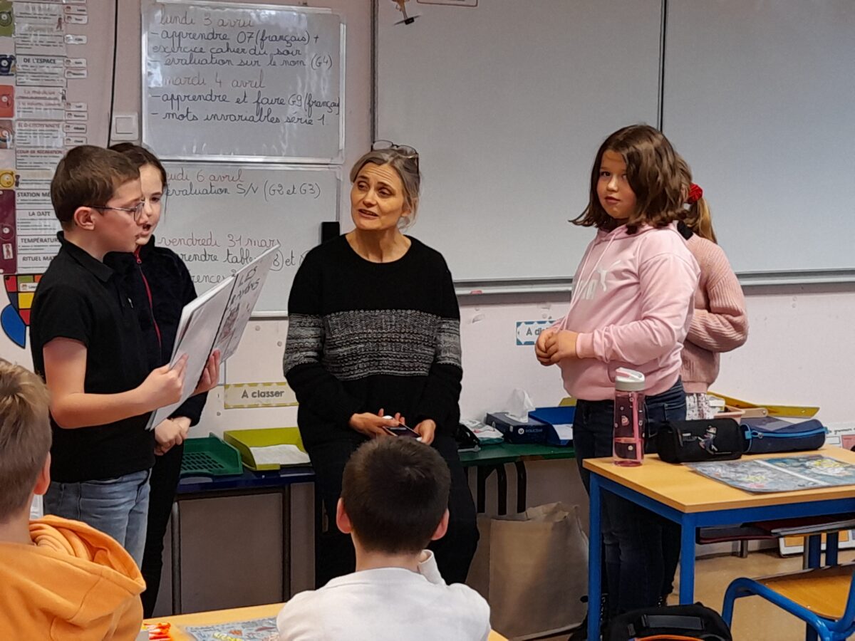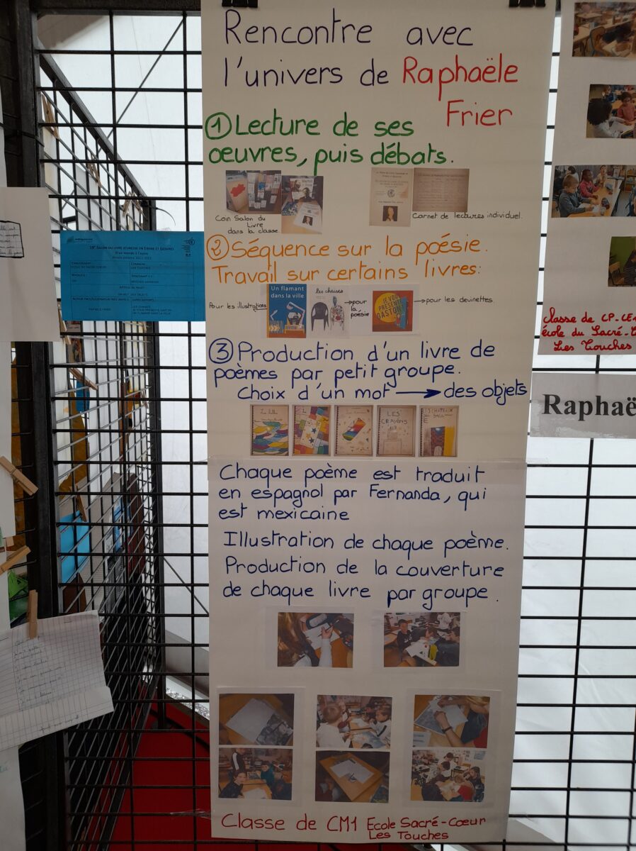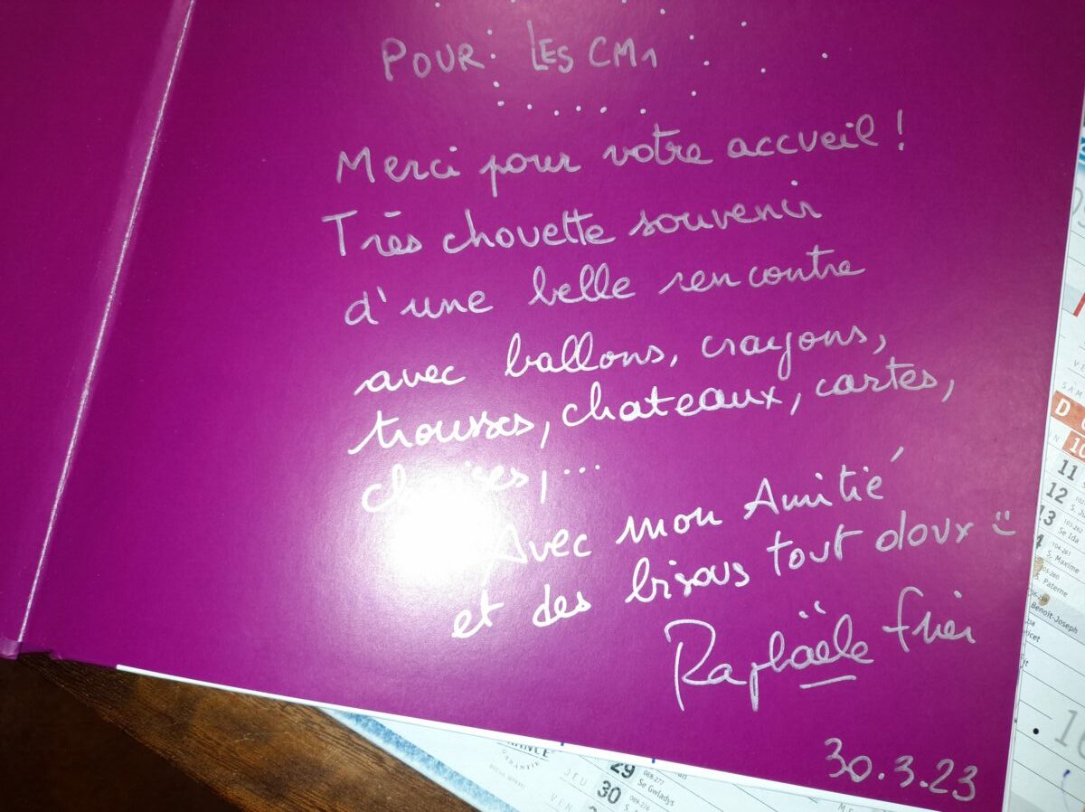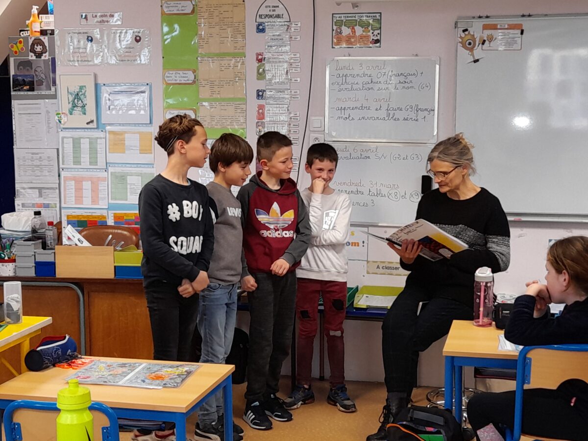 Jeudi 30 mars, Raphaël Frier a passé l’après-midi dans la classe des CM1. Après s’être présentée, elle a porté beaucoup d’intérêt aux productions réalisées par les enfants. Ces derniers lui ont expliqué le travail que nous avions fait en classe depuis décembre : lecture de ses albums avec recherche du genre littéraire, débat sur chaque thème abordé dans les histoires, notre coup de coeur sur l’album « Les chaises » (ce livre présente des poèmes sur les différentes chaises qui existent et sont traduits en arabe). Les enfants ont donc choisi un mot, puis ont écrit un poème-devinette sur un objet précis. C’est ainsi que les enfants ont confectionné 5 livres, chacun portant sur un mot. Tout ce travail a été exposé lors du week-end du salon du livre.