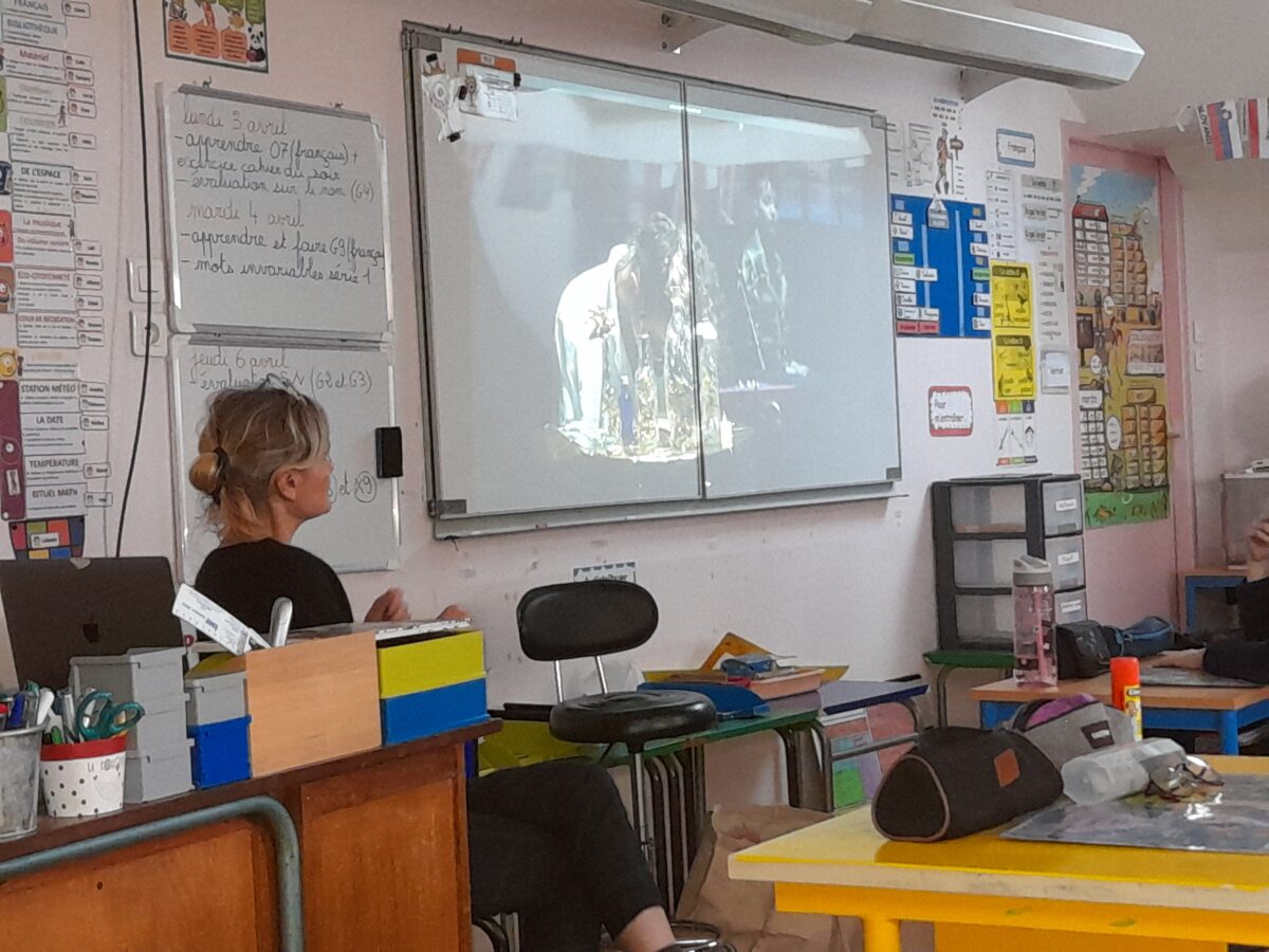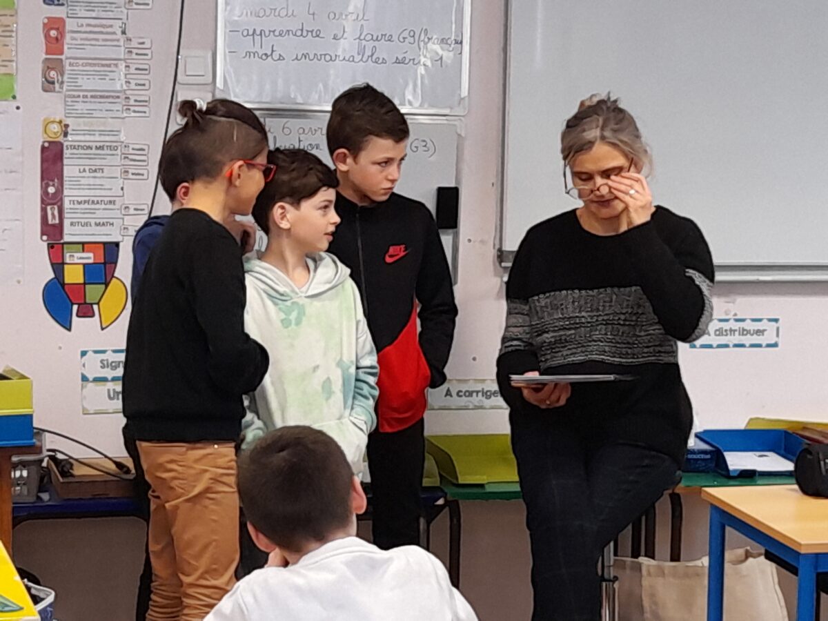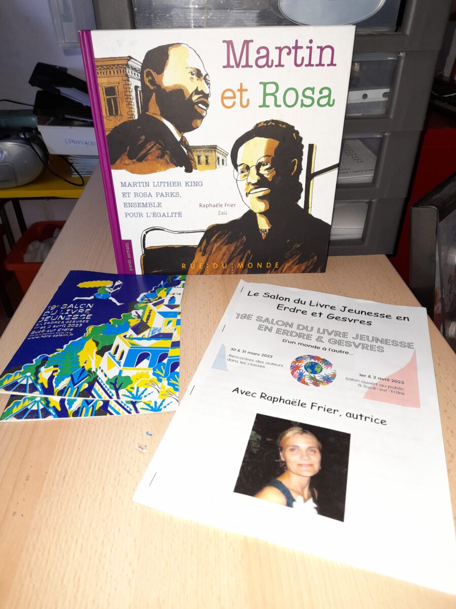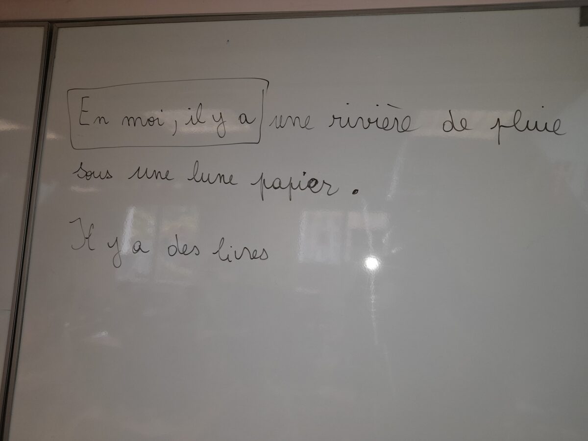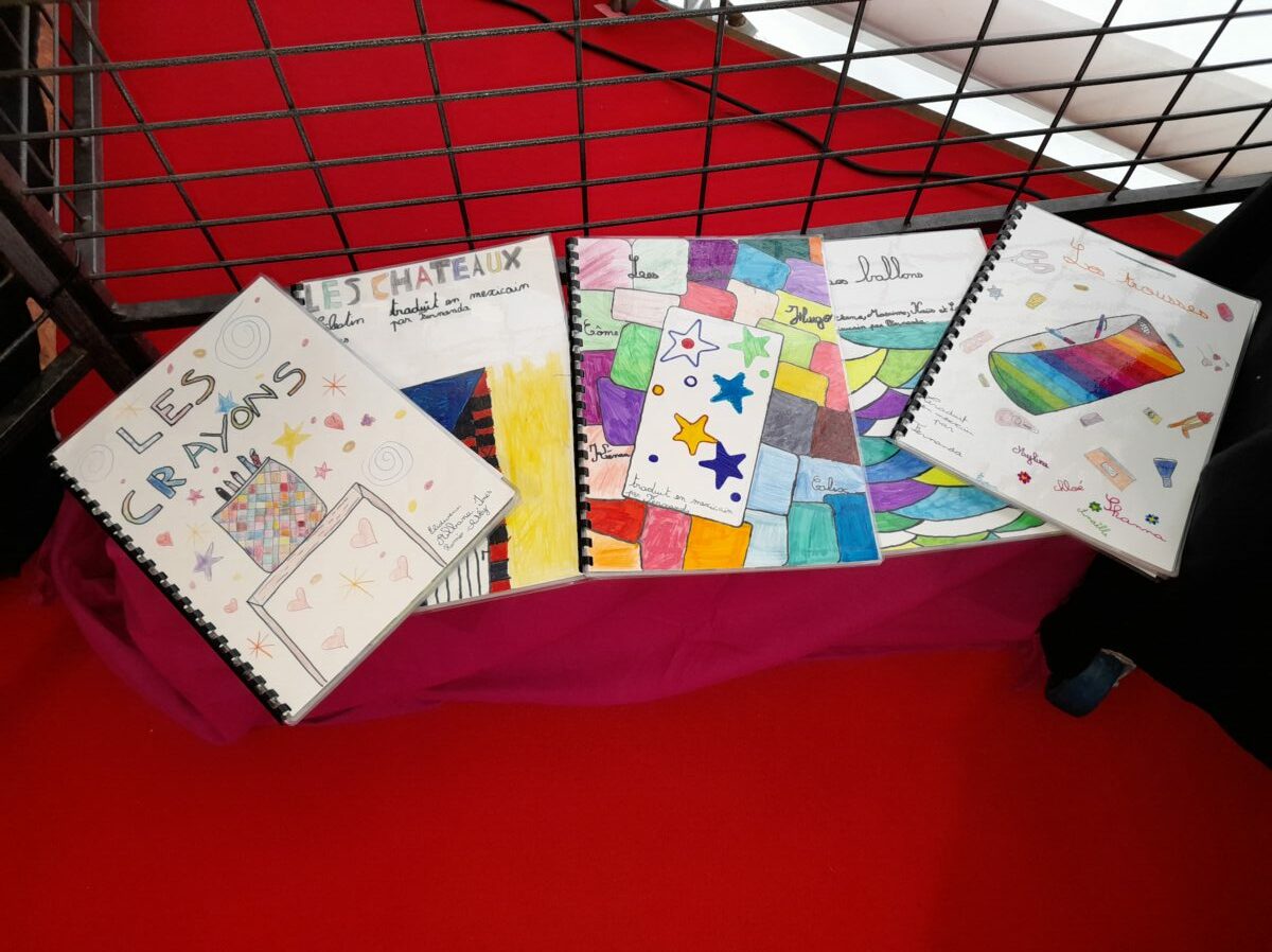 Jeudi 30 mars, Raphaël Frier a passé l’après-midi dans la classe des CM1. Après s’être présentée, elle a porté beaucoup d’intérêt aux productions réalisées par les enfants. Ces derniers lui ont expliqué le travail que nous avions fait en classe depuis décembre : lecture de ses albums avec recherche du genre littéraire, débat sur chaque thème abordé dans les histoires, notre coup de coeur sur l’album « Les chaises » (ce livre présente des poèmes sur les différentes chaises qui existent et sont traduits en arabe). Les enfants ont donc choisi un mot, puis ont écrit un poème-devinette sur un objet précis. C’est ainsi que les enfants ont confectionné 5 livres, chacun portant sur un mot. Tout ce travail a été exposé lors du week-end du salon du livre.