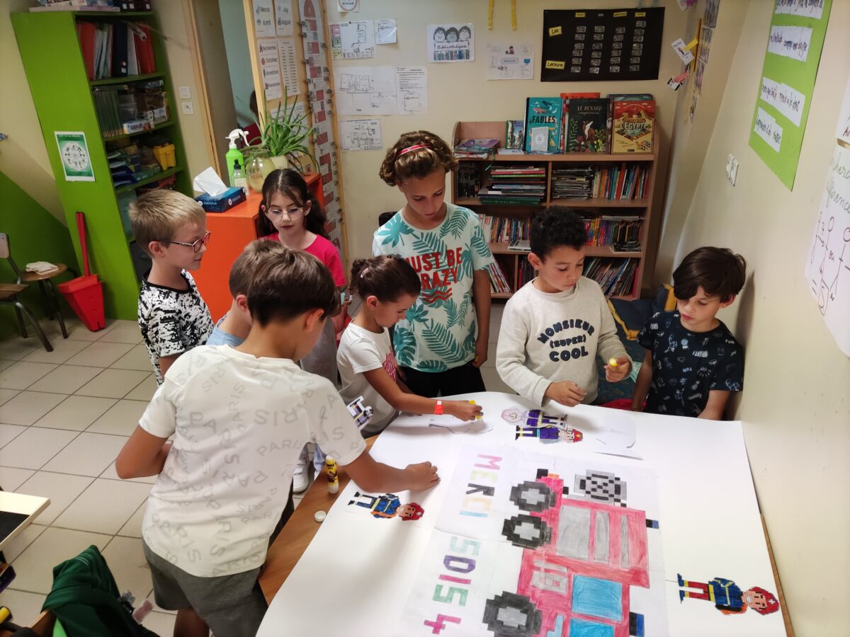 - Les élèves des classes de CE1-2 et CM1-2 ont participé à leur manière au centenaire des pompiers des Touches. Ils ont dessiné, colorié un camion de pompiers ainsi que des minis pompiers en pixel. Ils se sont retrouvés pour assembler le tout et enfin par petits groupes ils leur ont écrit des petites attentions.