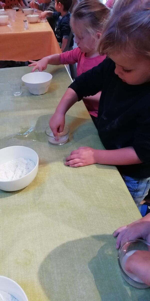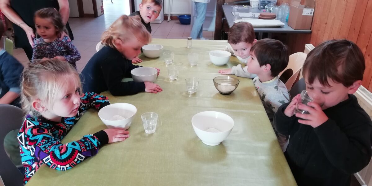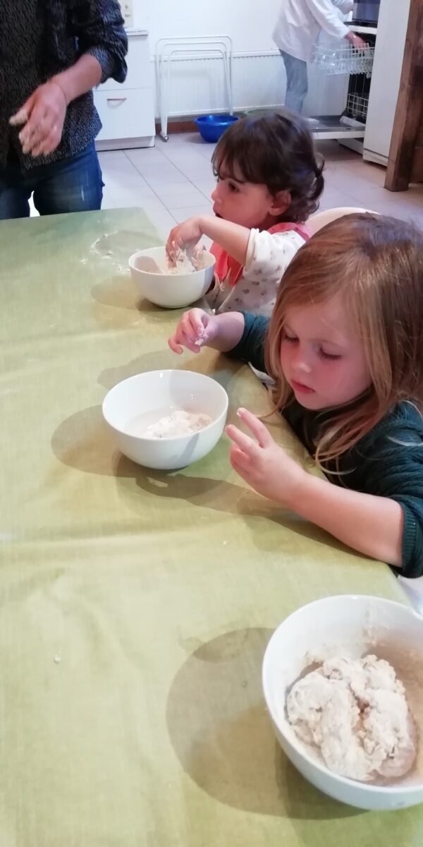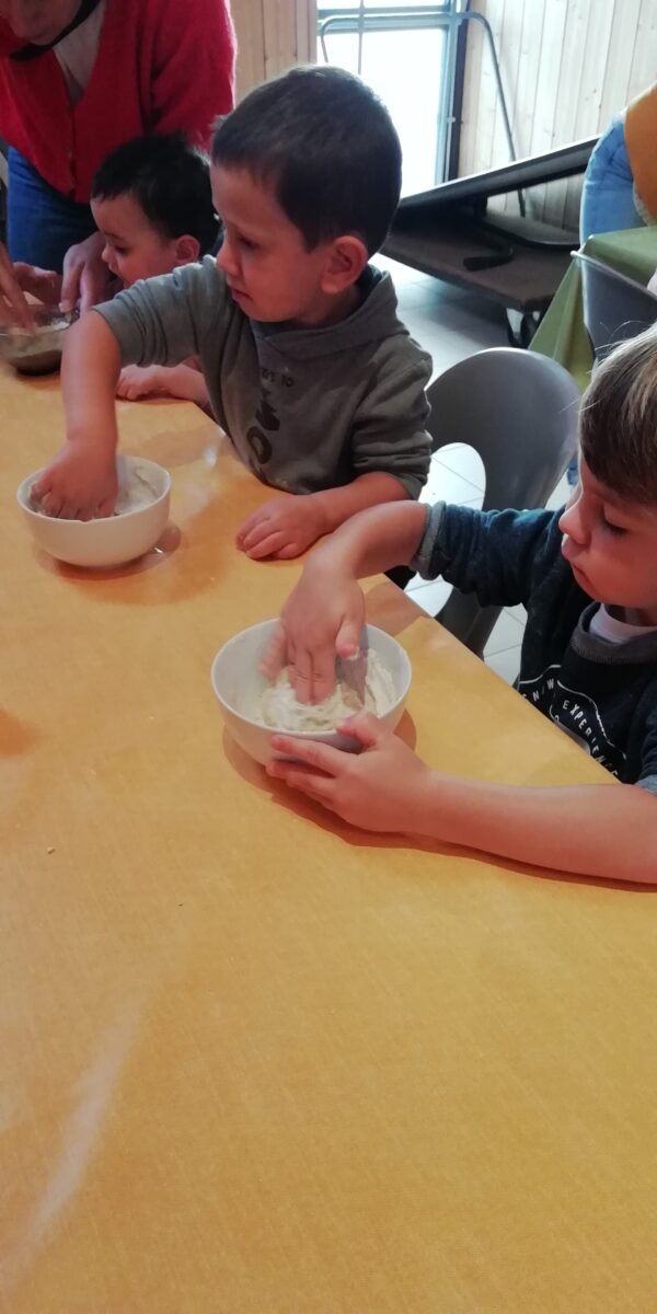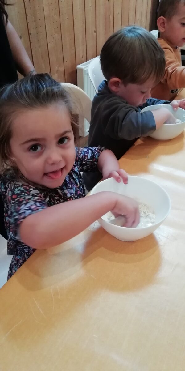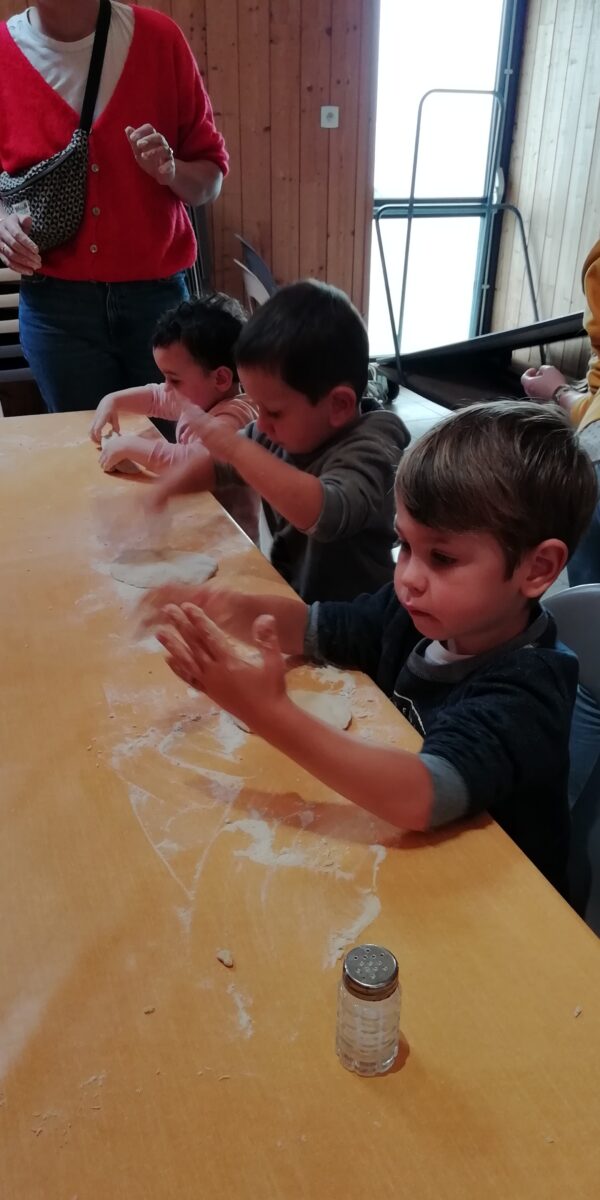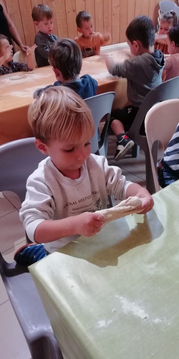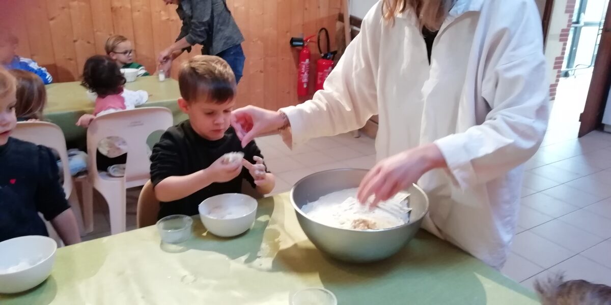 Le matin, après un lavage des mains minutieux, chaque enfant a pu mélanger farine, eau, sel et levure afin de confectionner son propre petit pain. Après cuisson, ce petit pain a été remis à chacun et rapporté à la maison.
