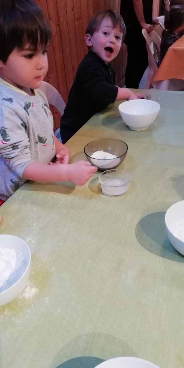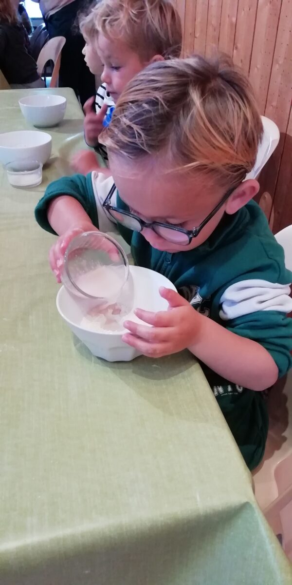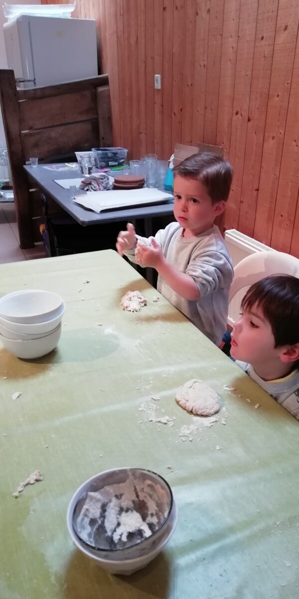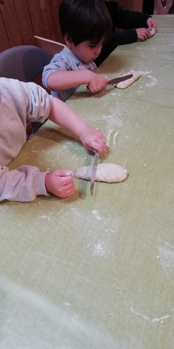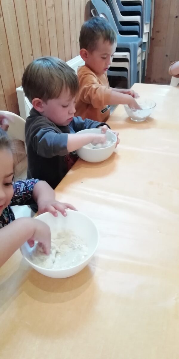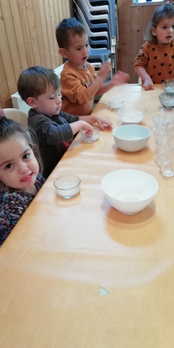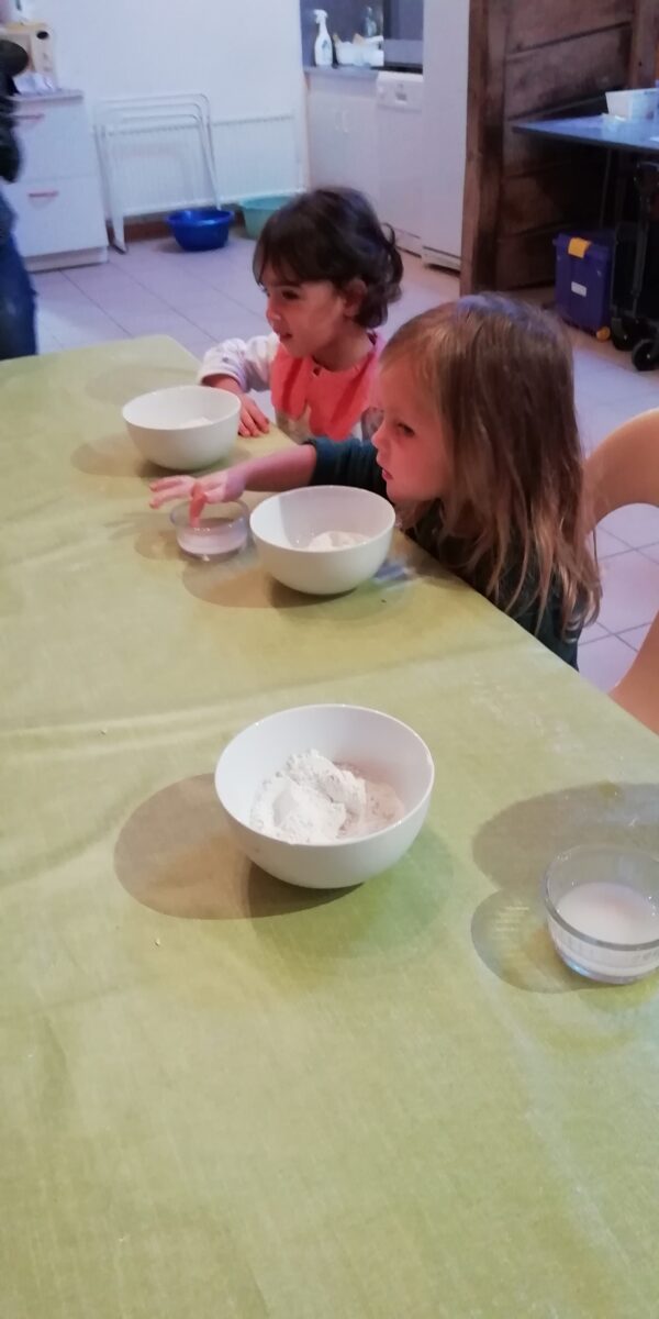 Le matin, après un lavage des mains minutieux, chaque enfant a pu mélanger farine, eau, sel et levure afin de confectionner son propre petit pain. Après cuisson, ce petit pain a été remis à chacun et rapporté à la maison.