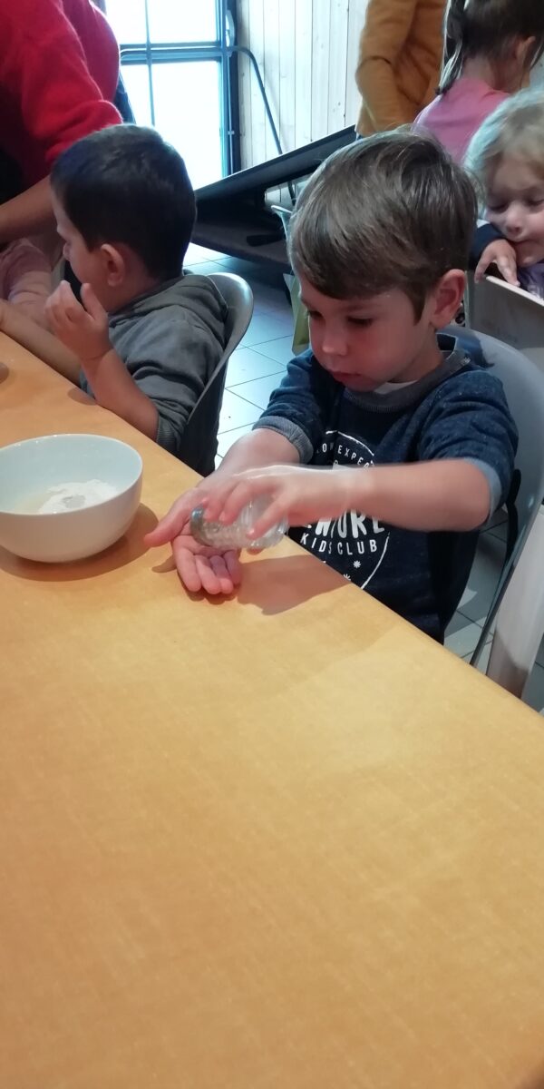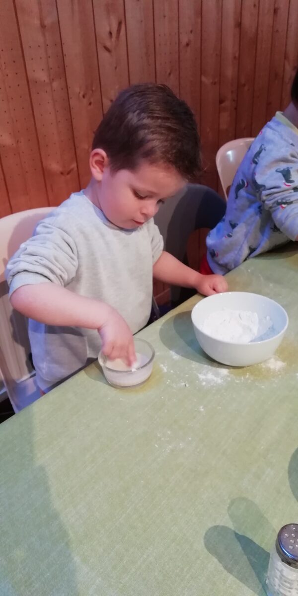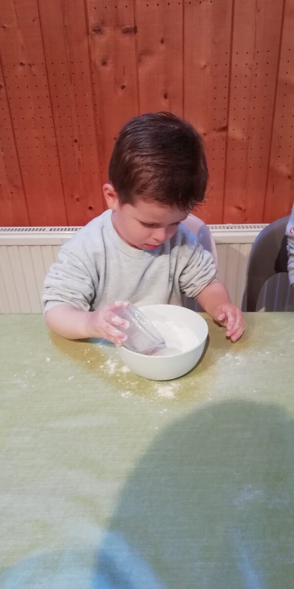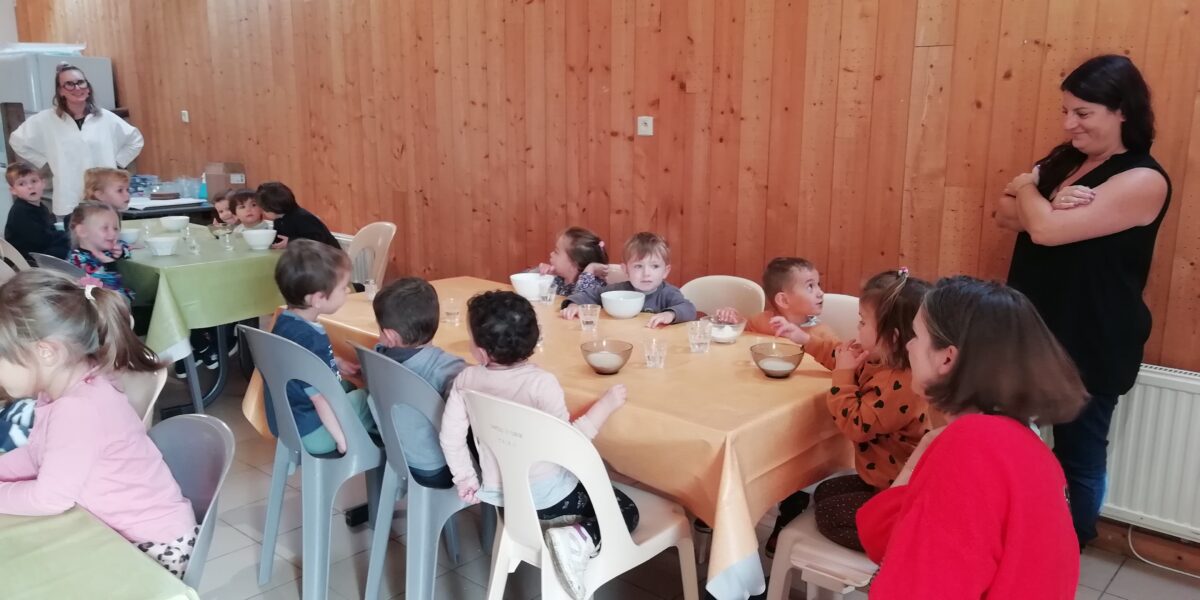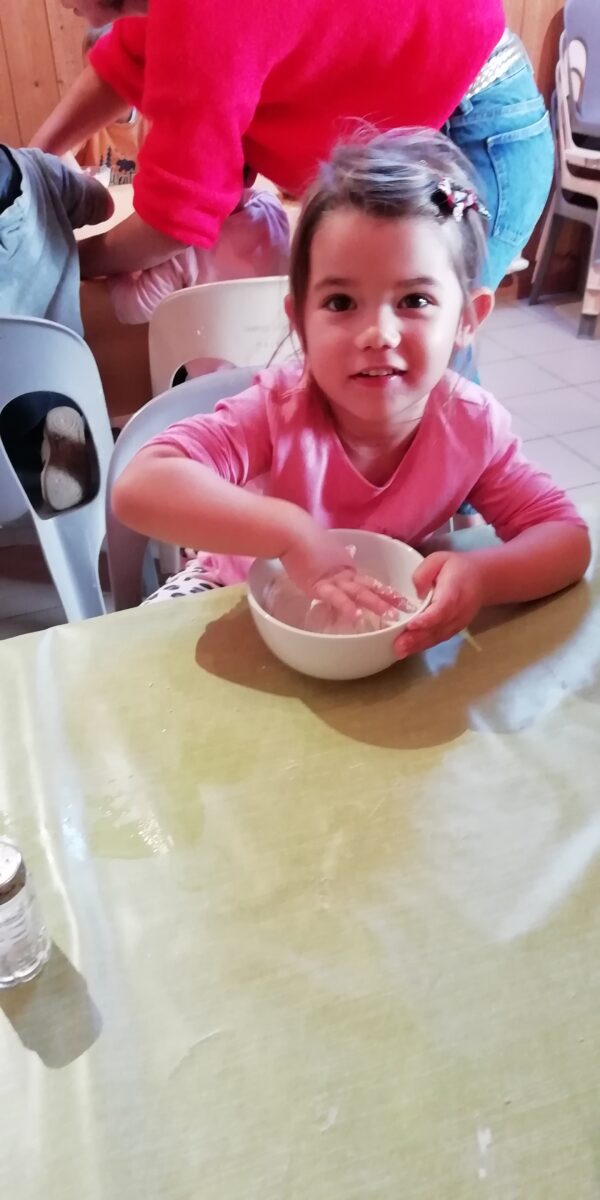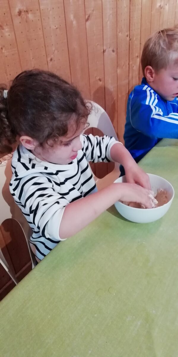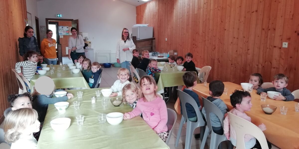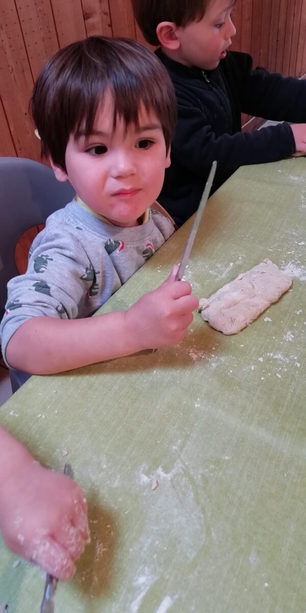 Le matin, après un lavage des mains minutieux, chaque enfant a pu mélanger farine, eau, sel et levure afin de confectionner son propre petit pain. Après cuisson, ce petit pain a été remis à chacun et rapporté à la maison.