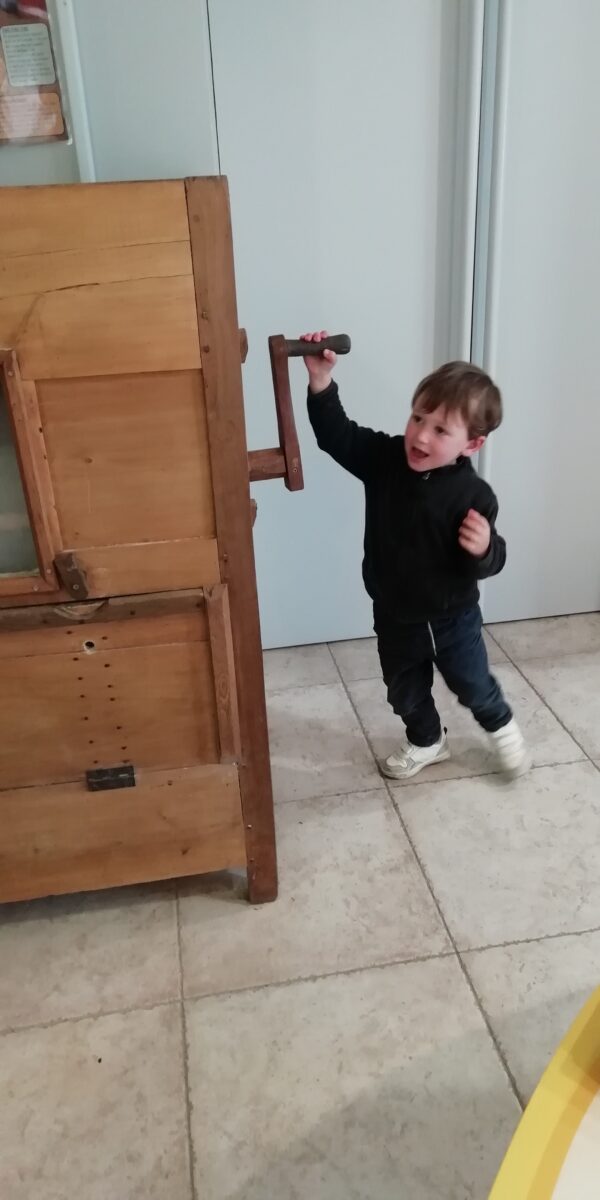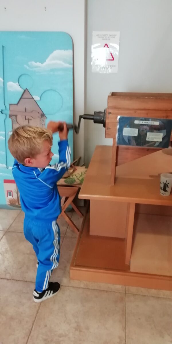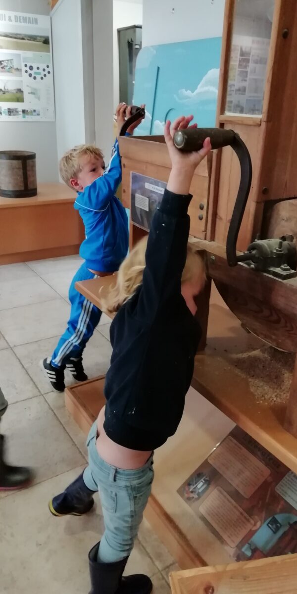 L’après-midi, nous avons formé deux groupes, la visite du moulin par les escaliers raides et étroits nécessitant une étroite surveillance. Pendant ce temps, l’autre demi groupe a pu visionner un court film et expérimenter certains outils.