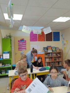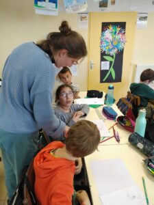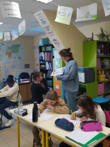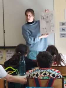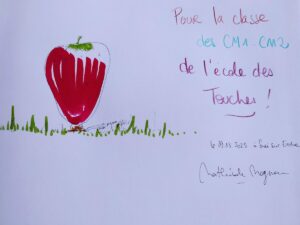 Jeudi, Mathilde Magnan est venue nous parler de son travail, elle a répondu à toutes nos questions. Nous avons aussi réalisé avec son aide l’illustration d’une expression française comme dans son livre « Ramène pas ta fraise », ouvrage qu’elle a eu la gentillesse de dédicacer.