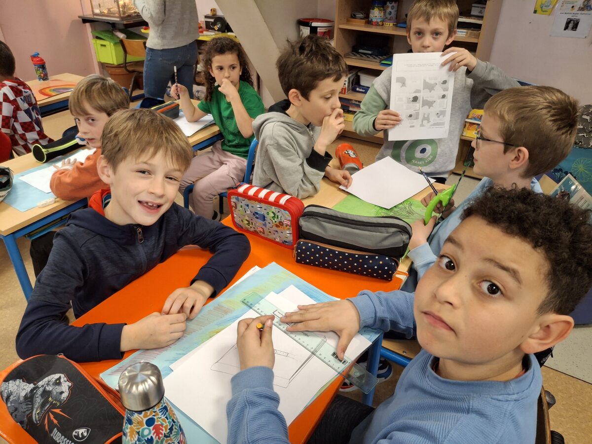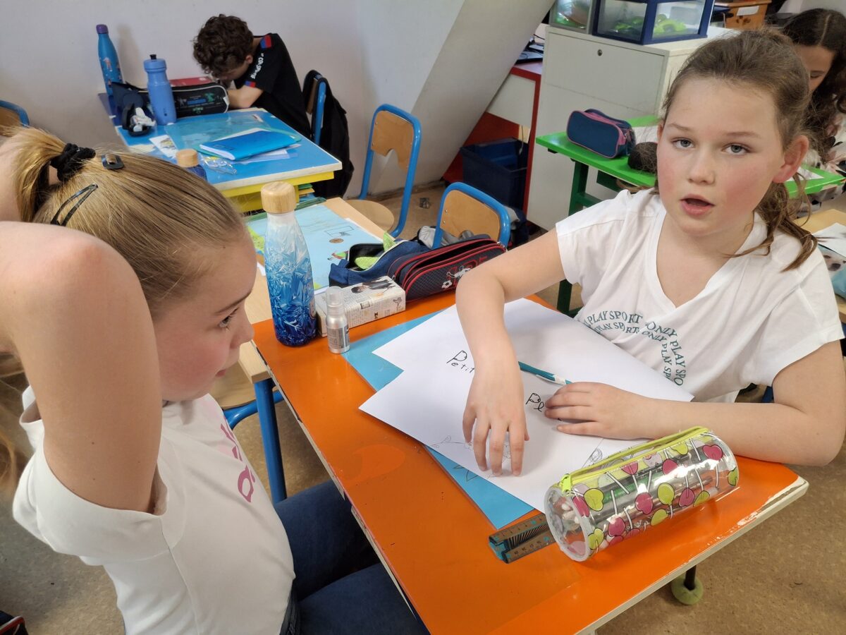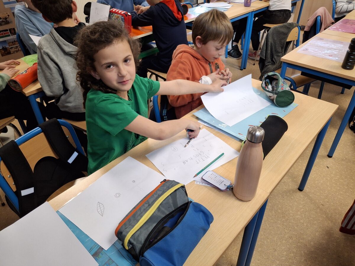 C’est ainsi que les CE2-CM1, seul ou en groupe, ont représenté sur une première feuille un détail, puis sur une deuxième ce détail avec d’autres choses environnantes et enfin sur une troisième le détail dans un paysage ou une chose de la nature. Le but du jeu est de deviner la dernière feuille. Les techniques utilisées par les enfants étaient le dessin ou la photo. La classe a ensuite regroupé toutes ces productions pour en faire un livre, intitulé : « Qui suis-je ? ». Le titre et la couverture ont été choisis par vote au sein de la classe.