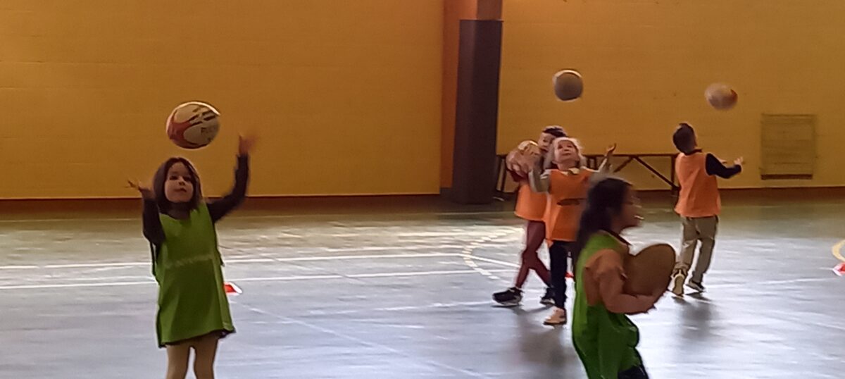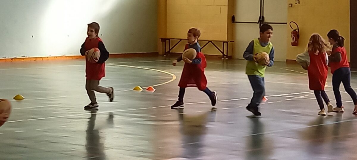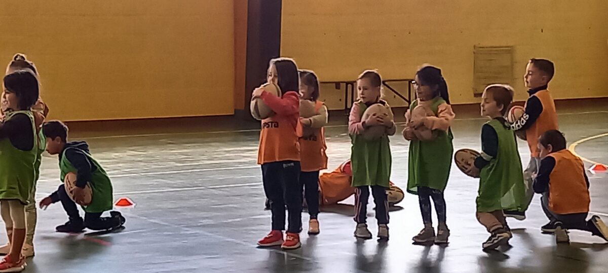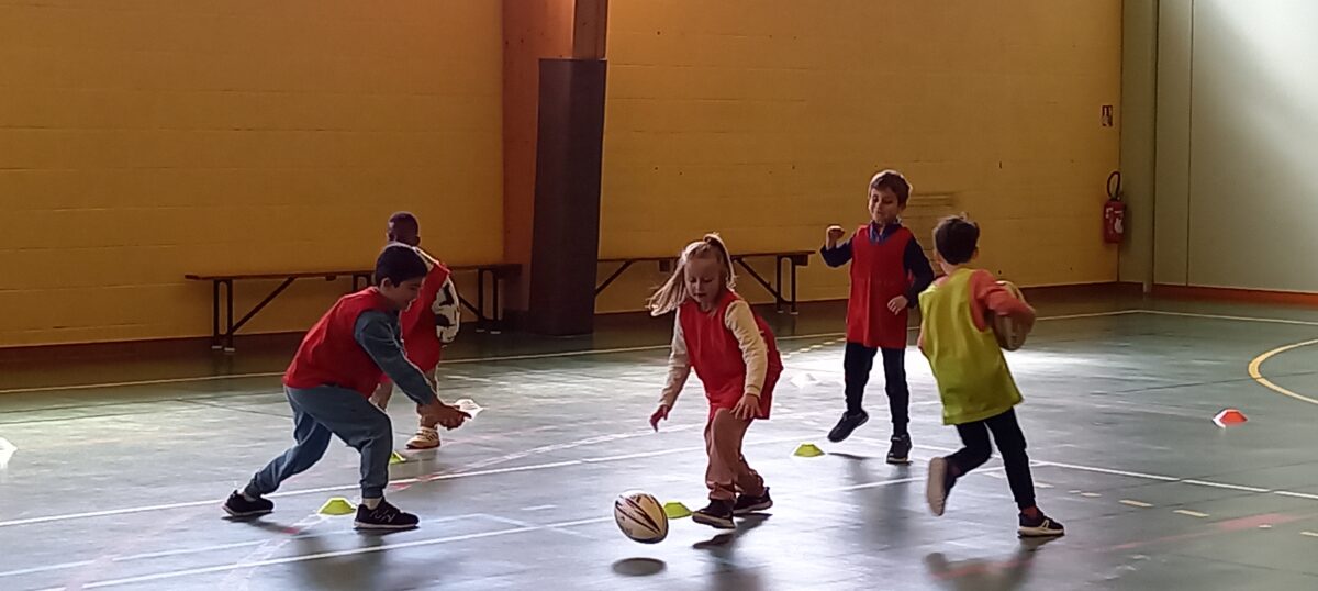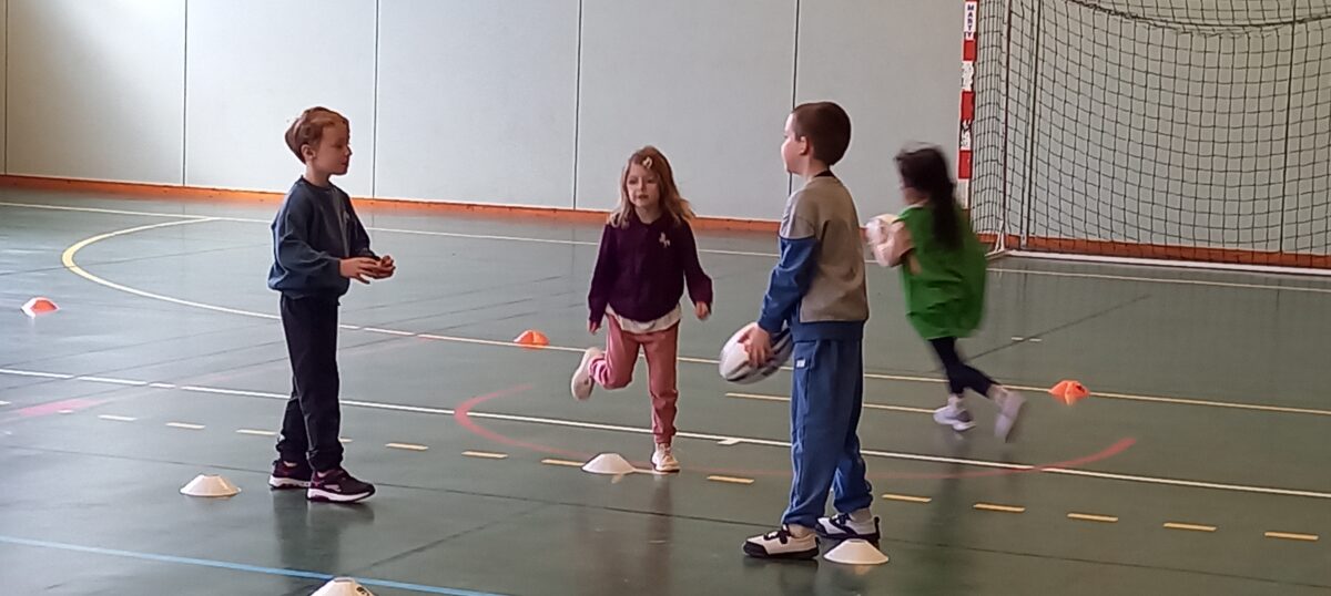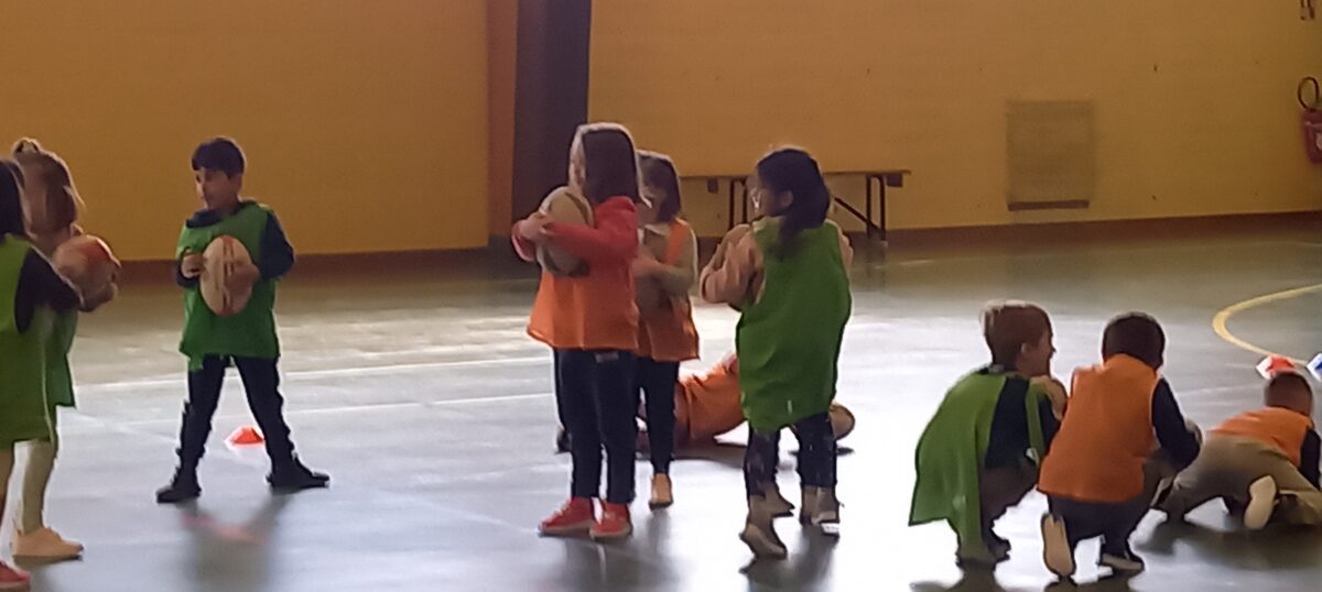Depuis le 6 mars, tous les jeudis, nous allons faire du rugby. C’est Alexis qui nous apprend toutes les règles de ce sport. Mardi dernier, nous nous sommes réunis avec les 3 autres classes de primaires pour des ateliers et des matchs. Nous avons beaucoup aimé marquer des essais.