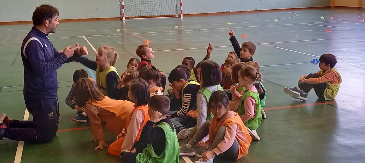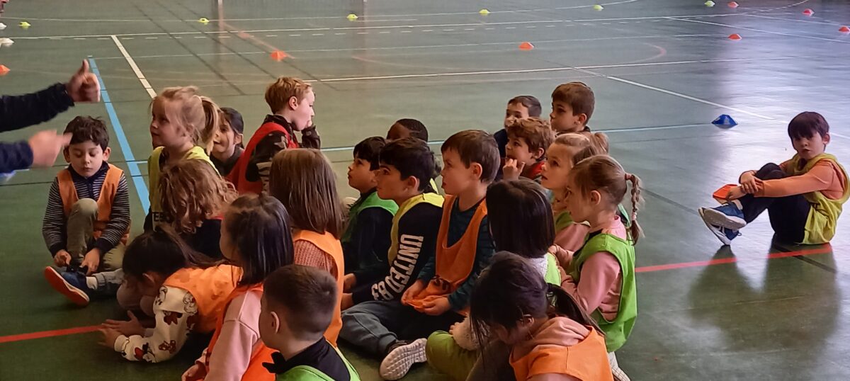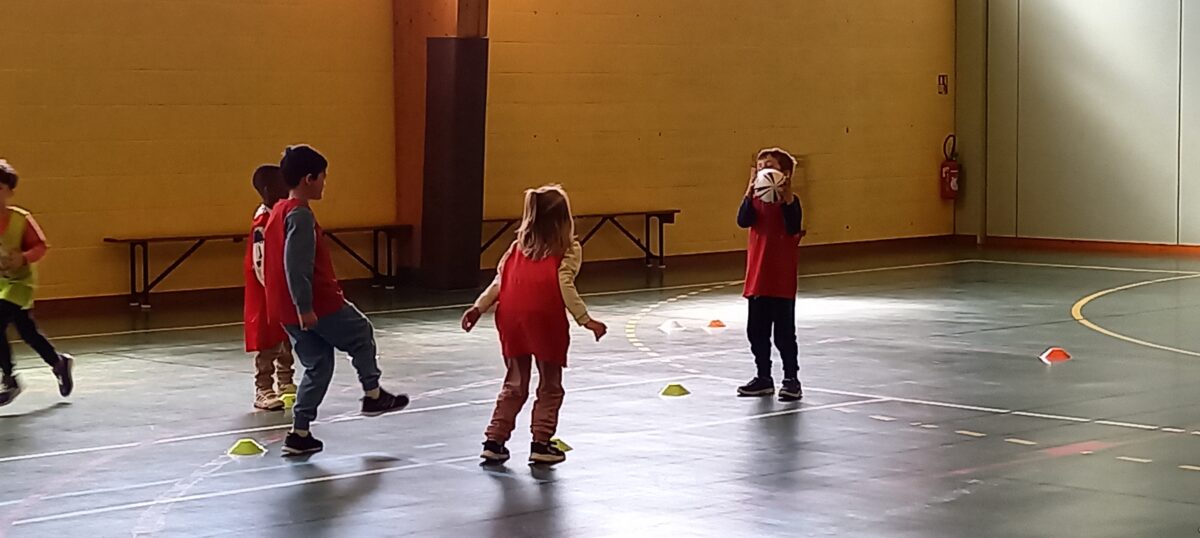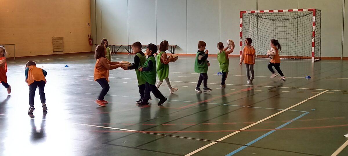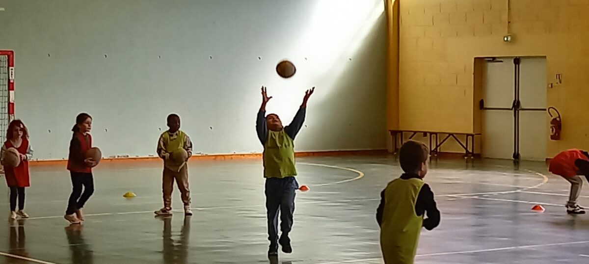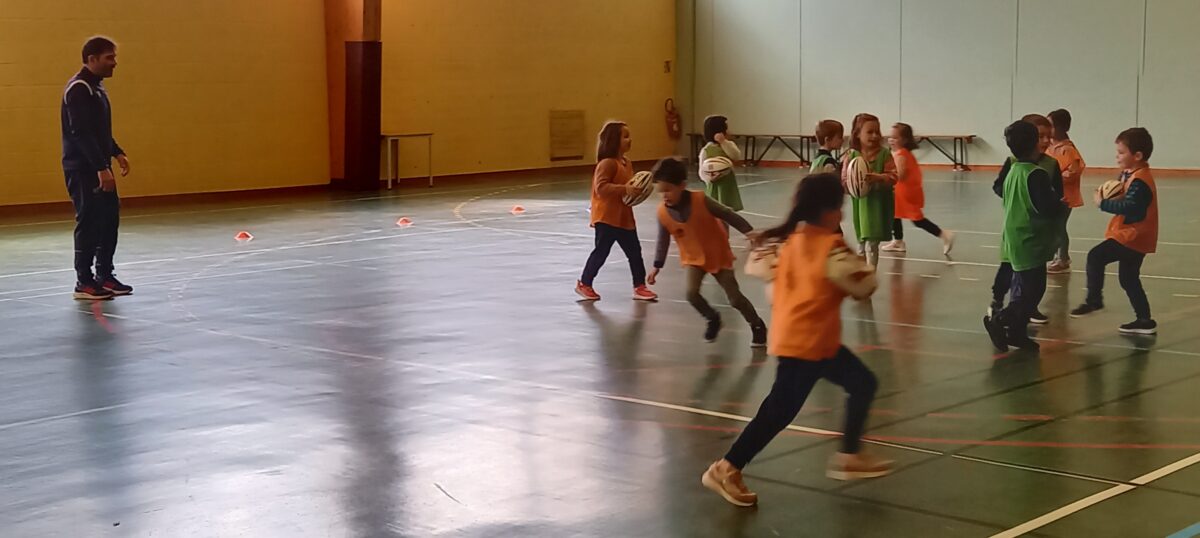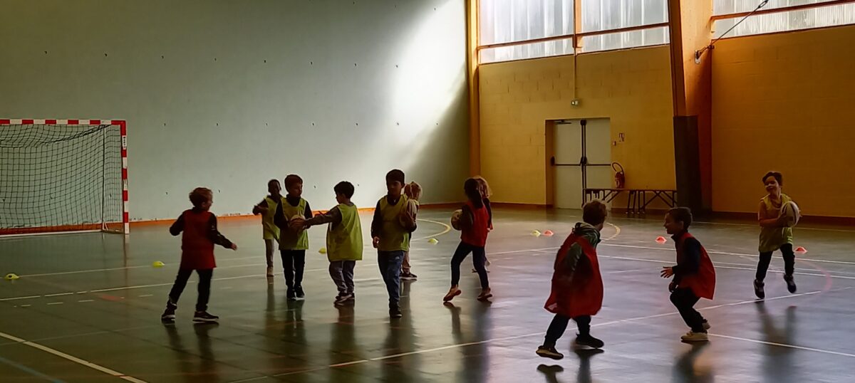 Depuis le 6 mars, tous les jeudis, nous allons faire du rugby. C’est Alexis qui nous apprend toutes les règles de ce sport. Mardi dernier, nous nous sommes réunis avec les 3 autres classes de primaires pour des ateliers et des matchs. Nous avons beaucoup aimé marquer des essais.