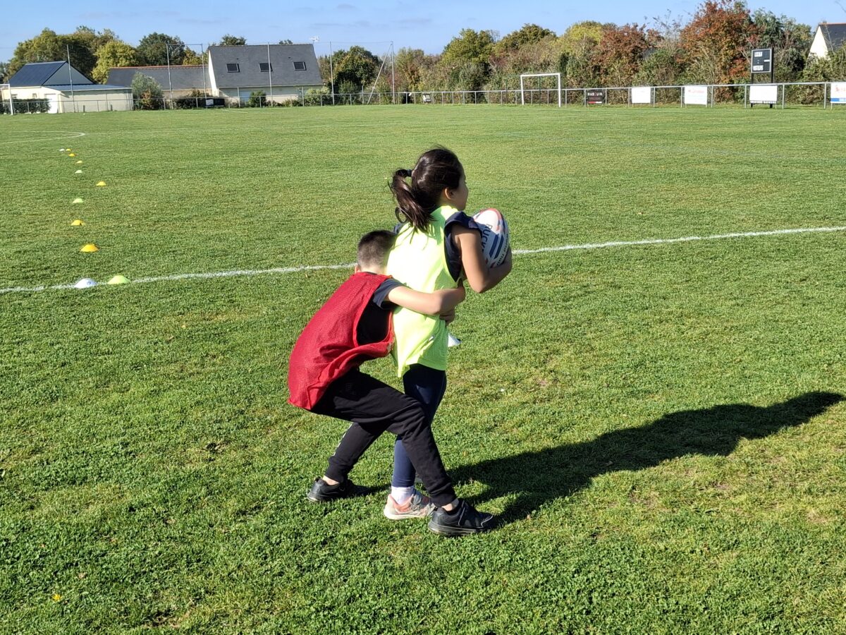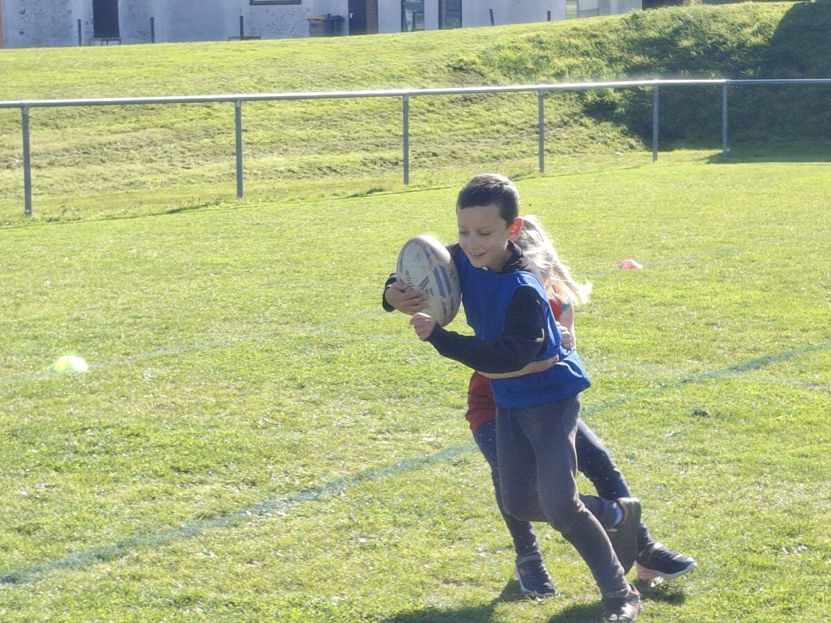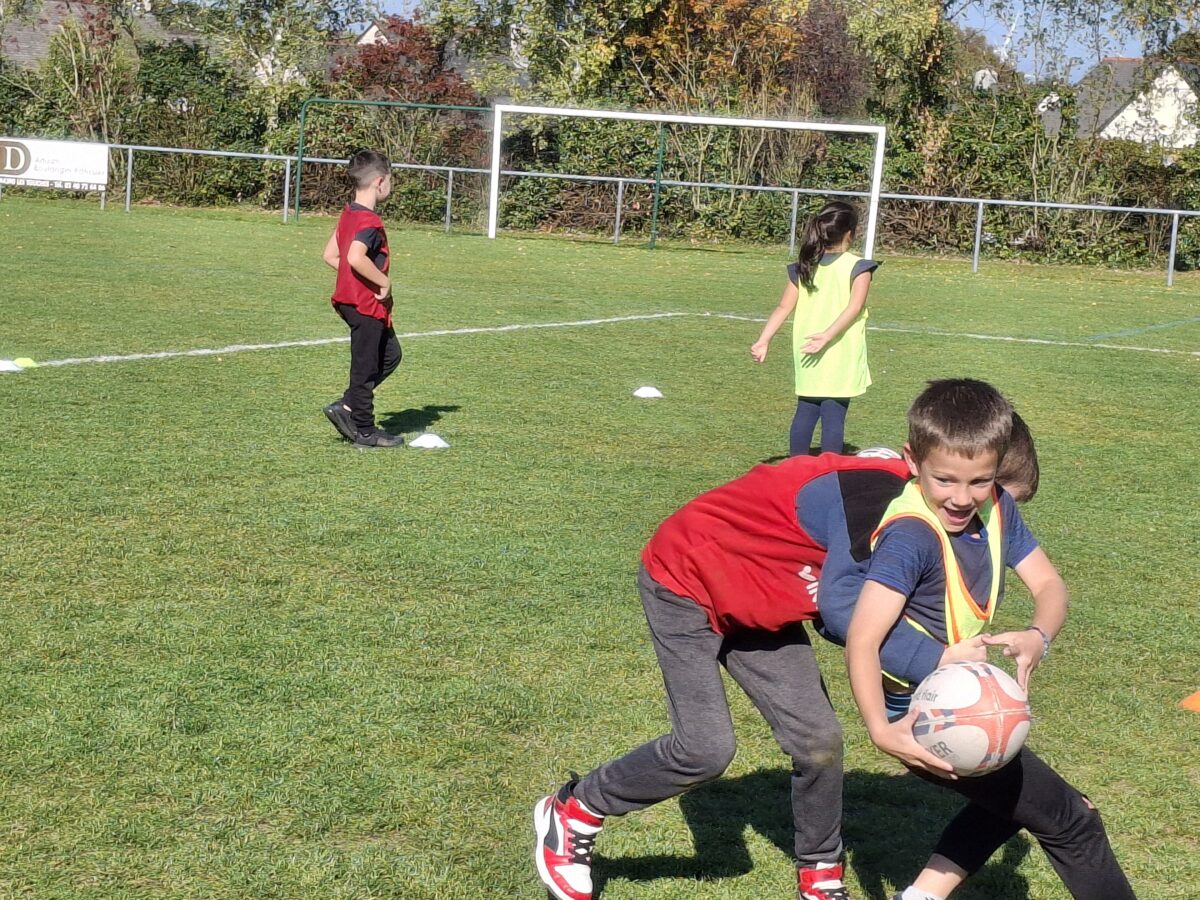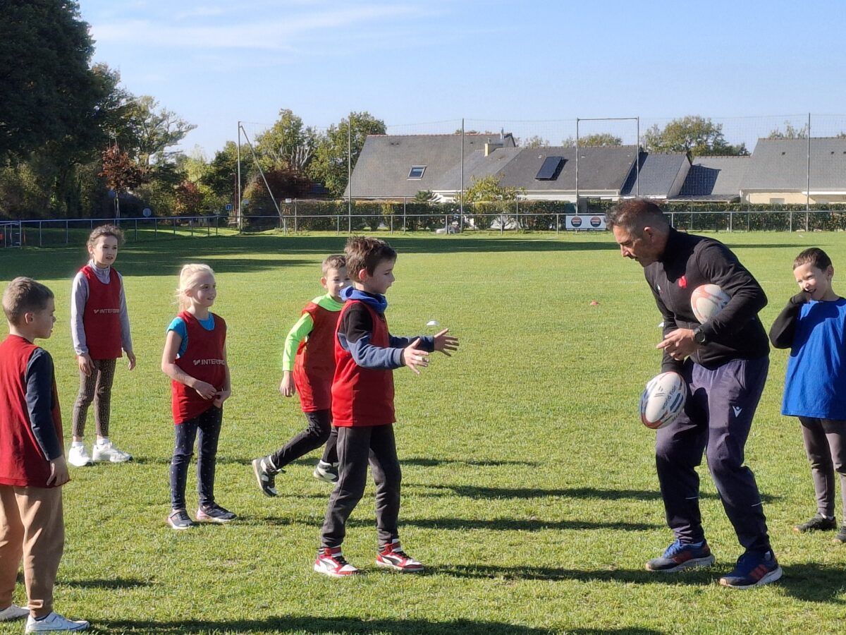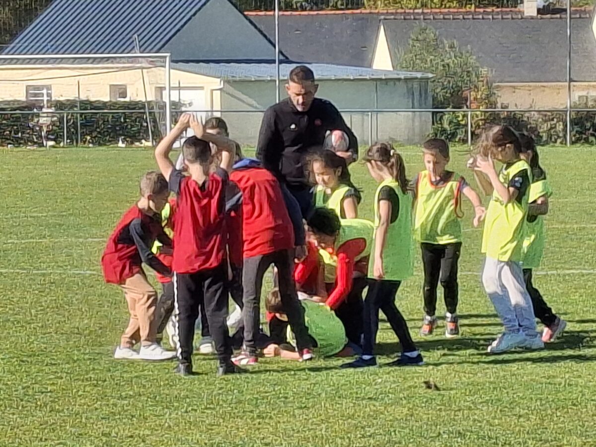 Les CE2-CM1 retrouvent cette année Alexis Vivies, éducateur sportif au Rugby Club du Pays d’Ancenis, pour six séances de rugby. Mais cette fois-ci à l’extérieur, sur le terrain en herbe. Une façon pour les enfants de découvrir le rugby « à plaquer » et de vivre pleinement ce sport. Tous les enfants se surpassent et progressent d’année en année… La sixième séance aura  lieu au retour des vacances de la Toussaint. Merci beaucoup à Alexis pour son professionnalisme auprès des enfants.