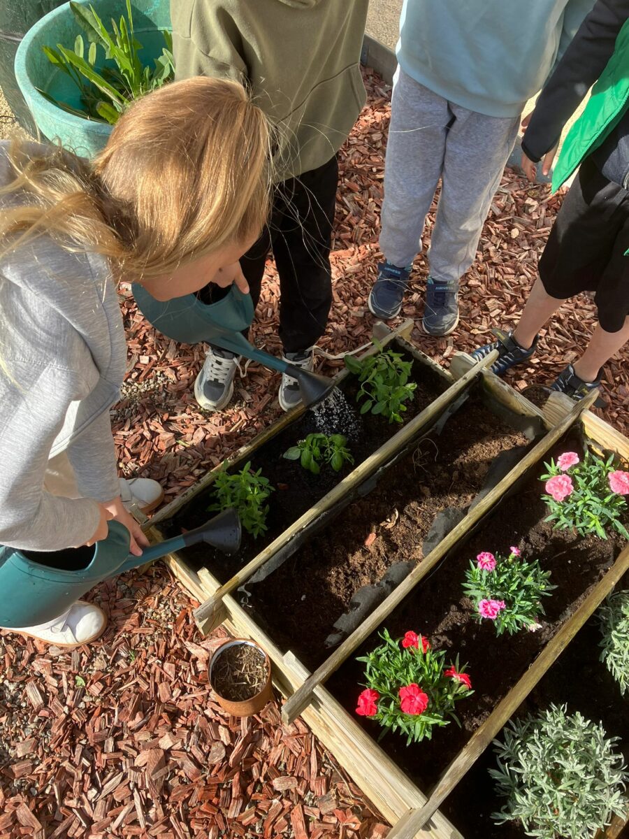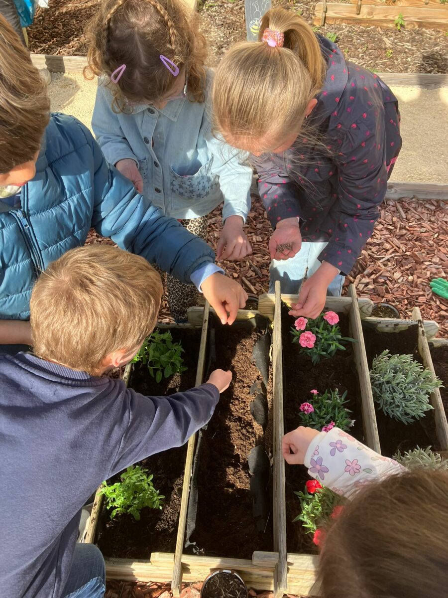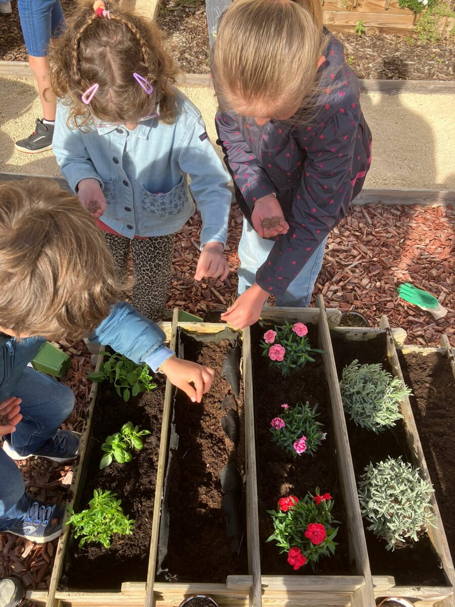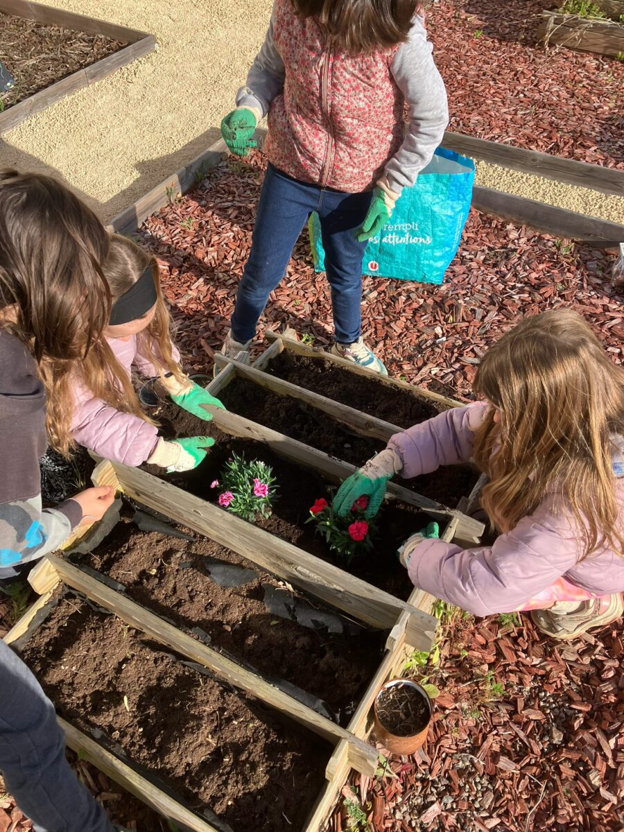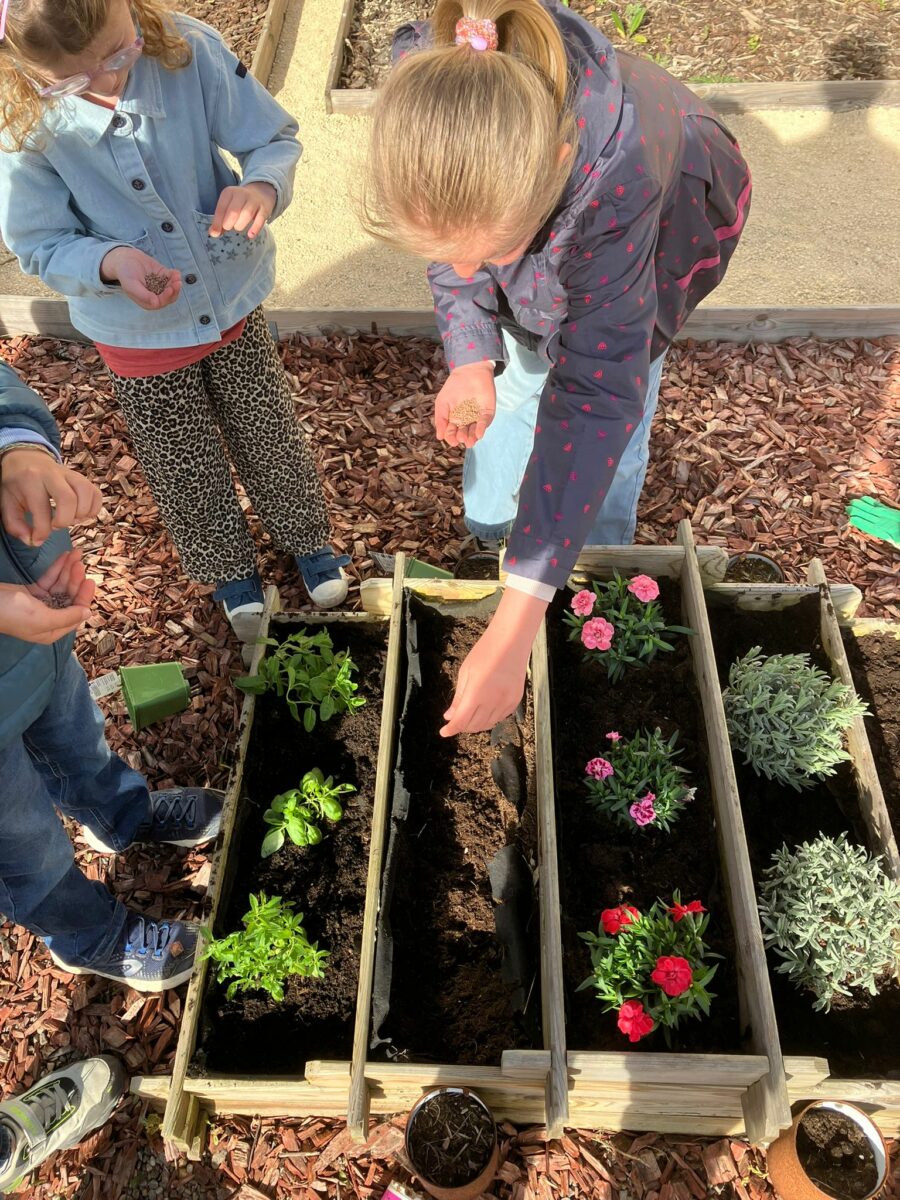 Dans le cadre de notre semaine sans cartable les CE1 se sont occupés de notre jardinière. Il a fallu désherber, préparer la terre pour accueillir nos nouvelles plantations ! Vous pourrez donc maintenant admirer la beauté de nos œillets, sentir le doux parfum de la lavande , de la menthe et même d’ici quelques semaines gouter de délicieux radis. Mais attention à bien en laisser pour les élèves !