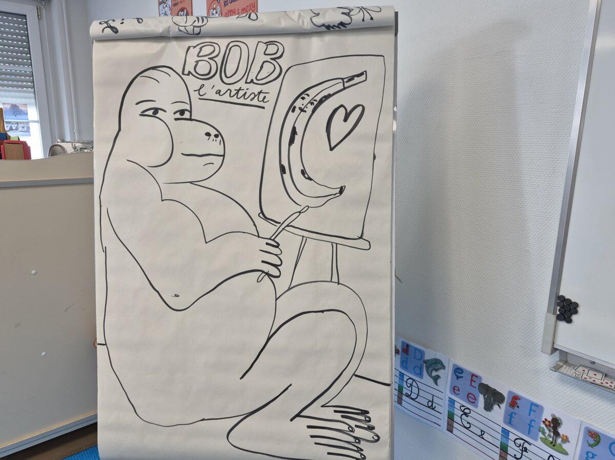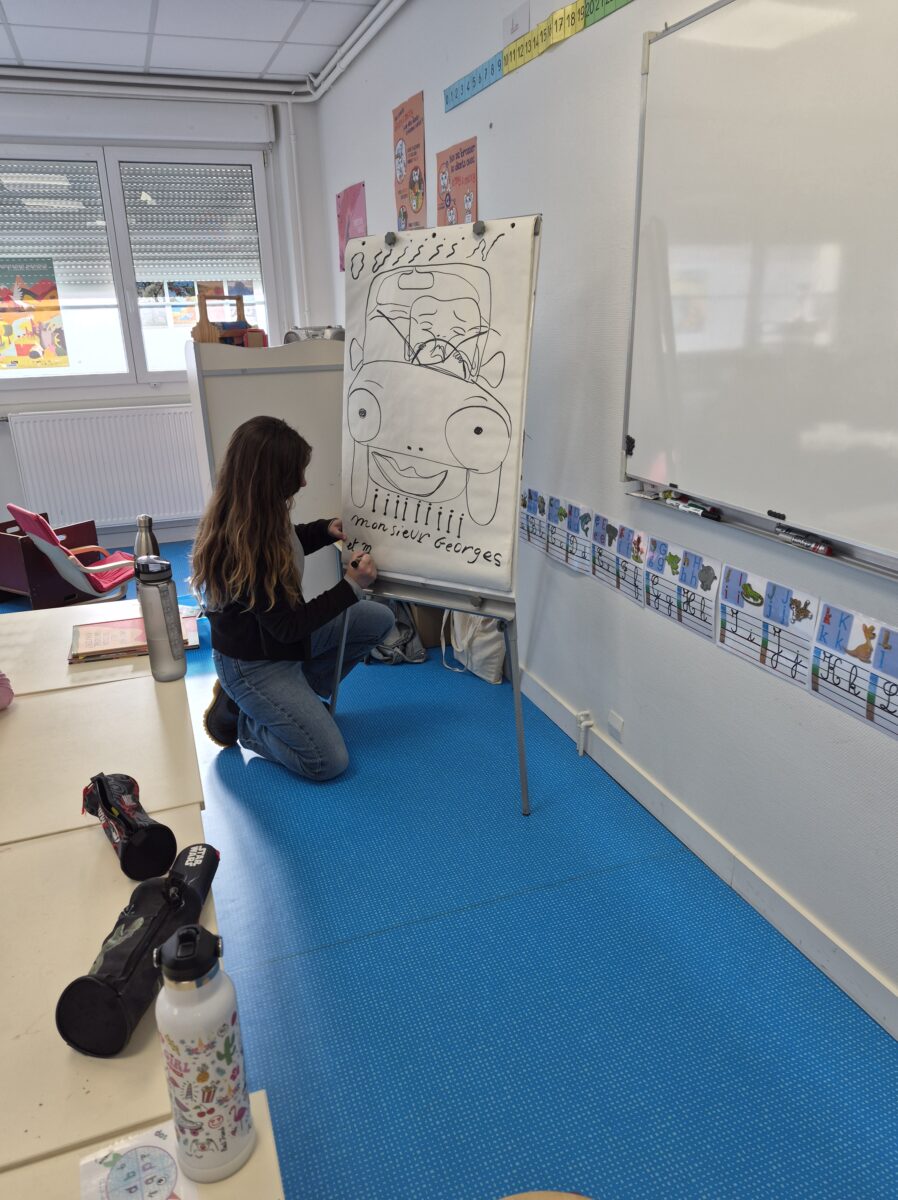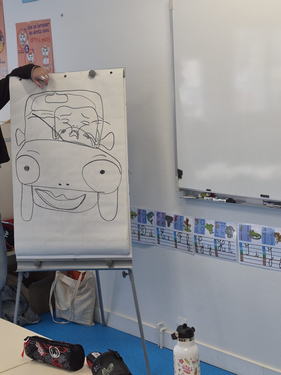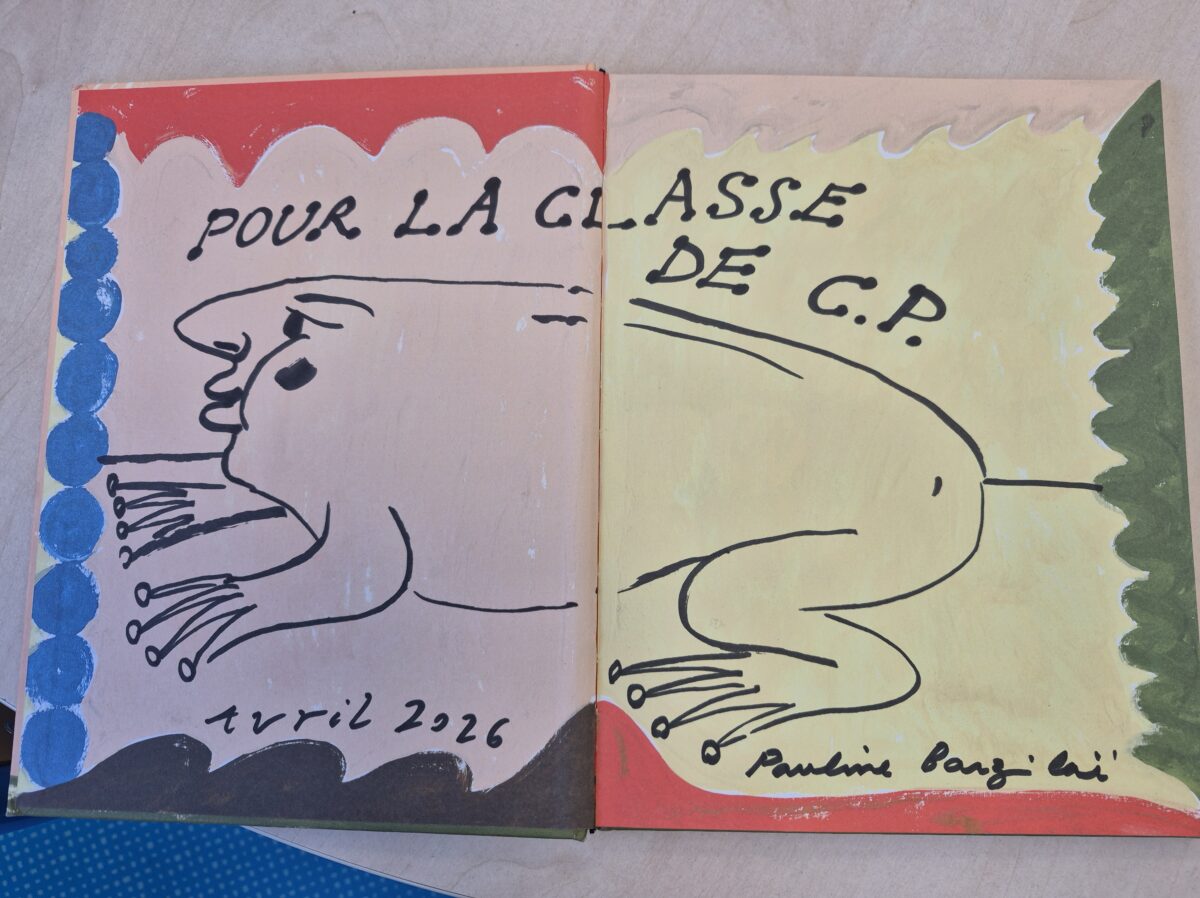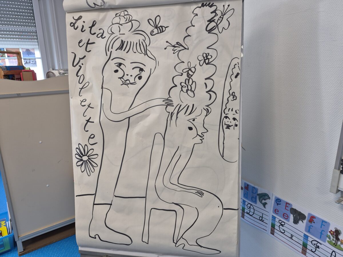 Vendredi, nous avons encore vécu une journée très dense. Le matin, l’autrice Pauline Barzilaï est venue nous rencontrer dans le cadre du salon du livre de Sucé sur Erdre. Elle a découvert ce que nous avions fabriqué pour l’exposition, puis elle a dessiné de nouveaux personnages avec les indications des enfants. Nous gardons ces dessins précieusement !