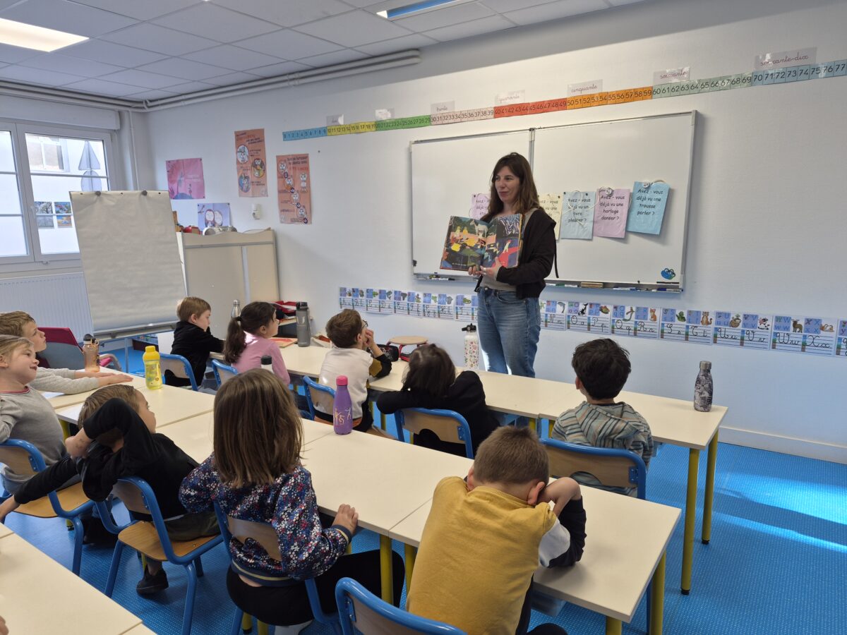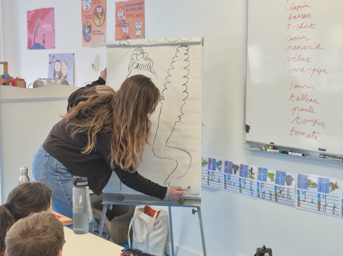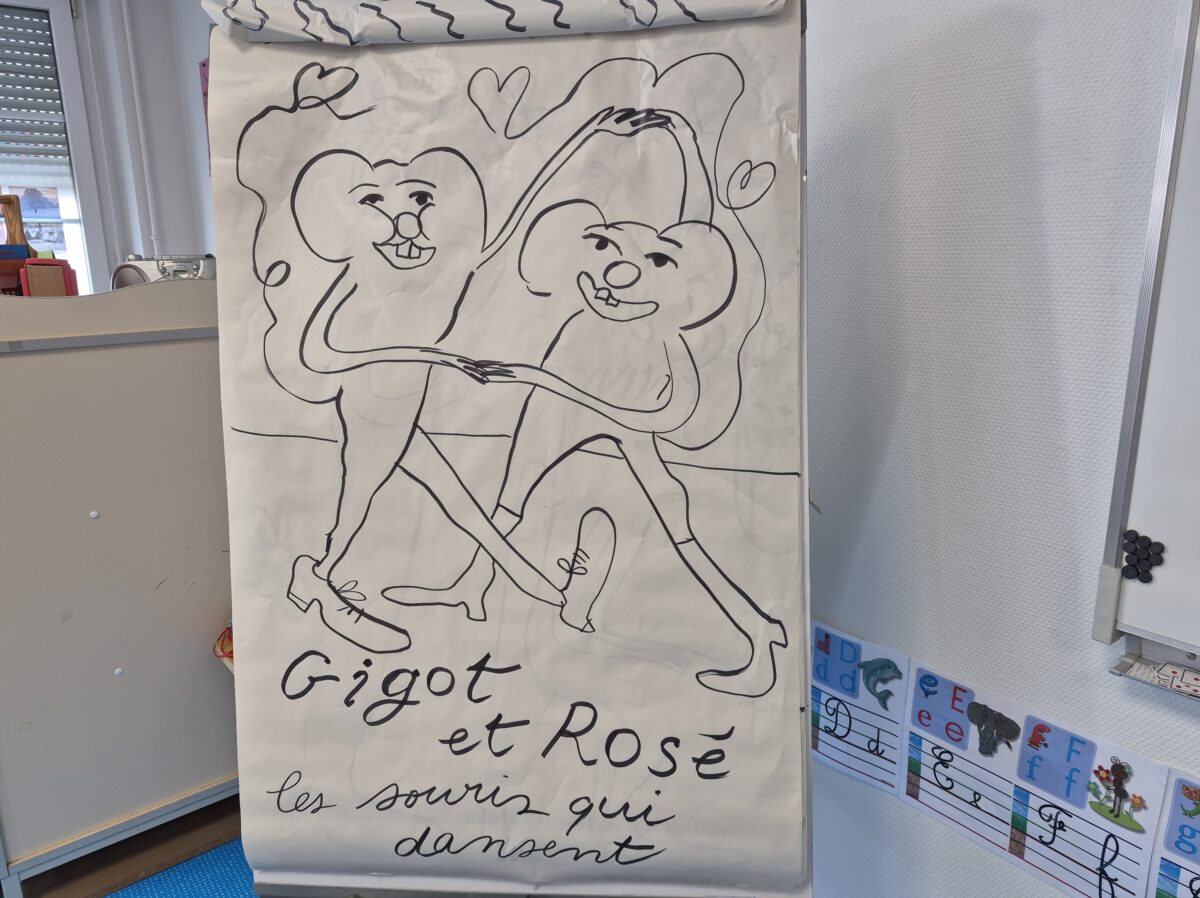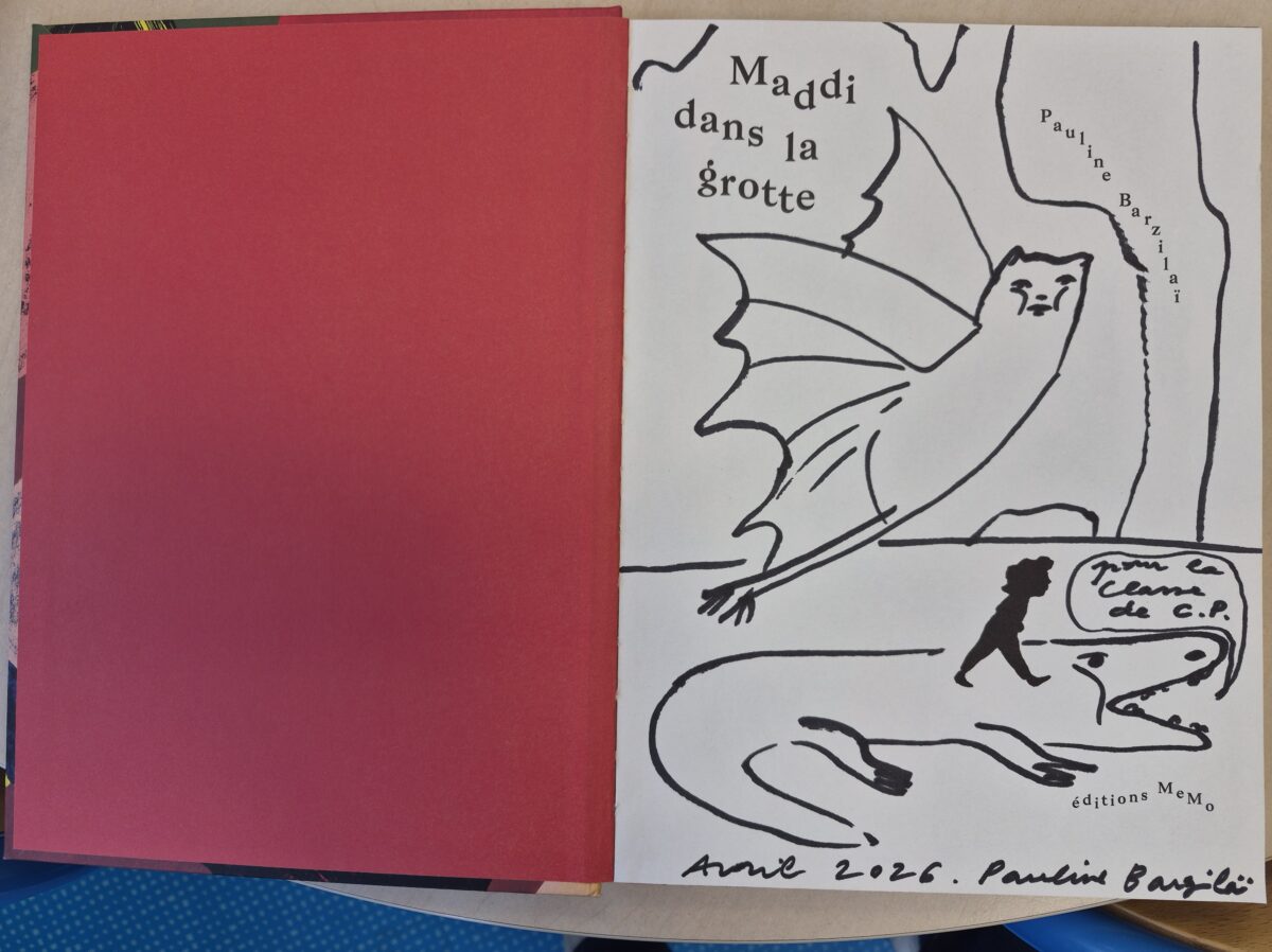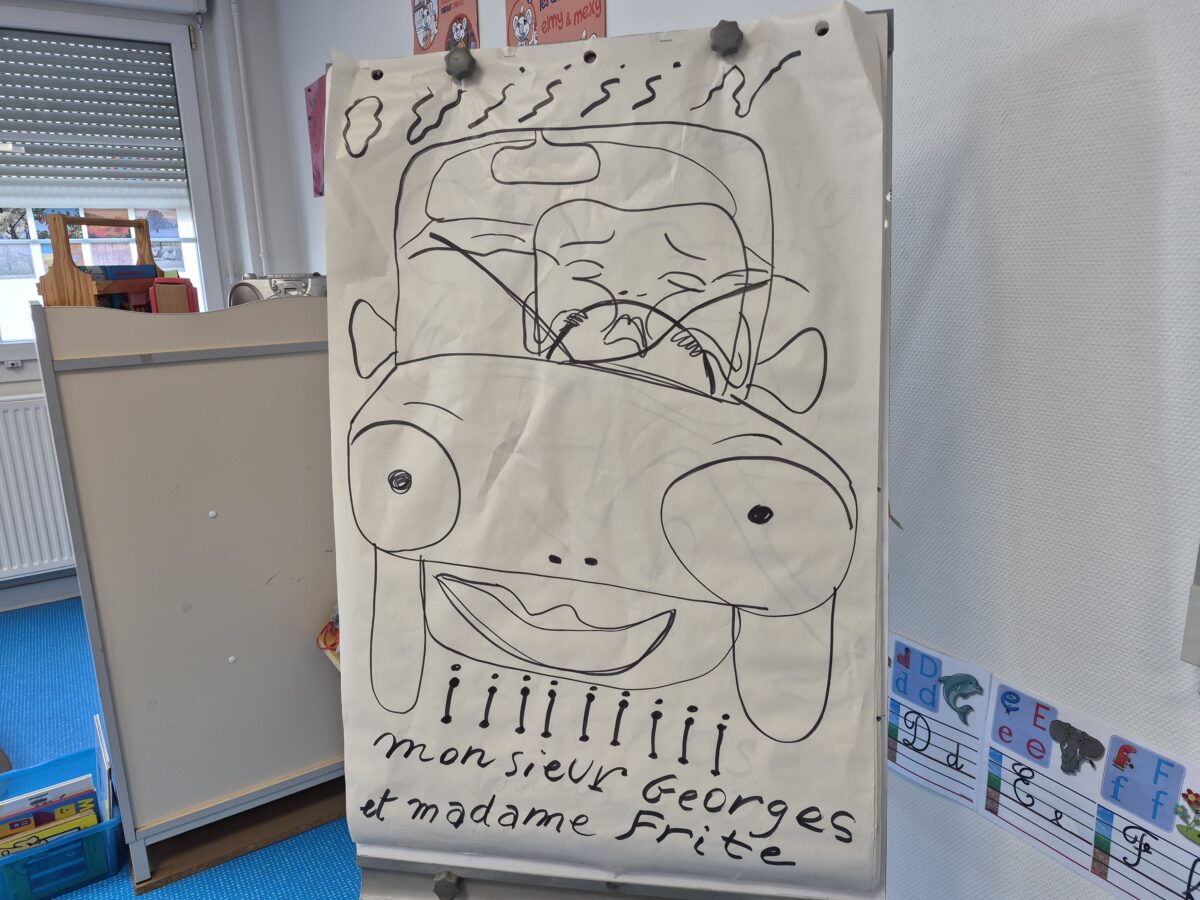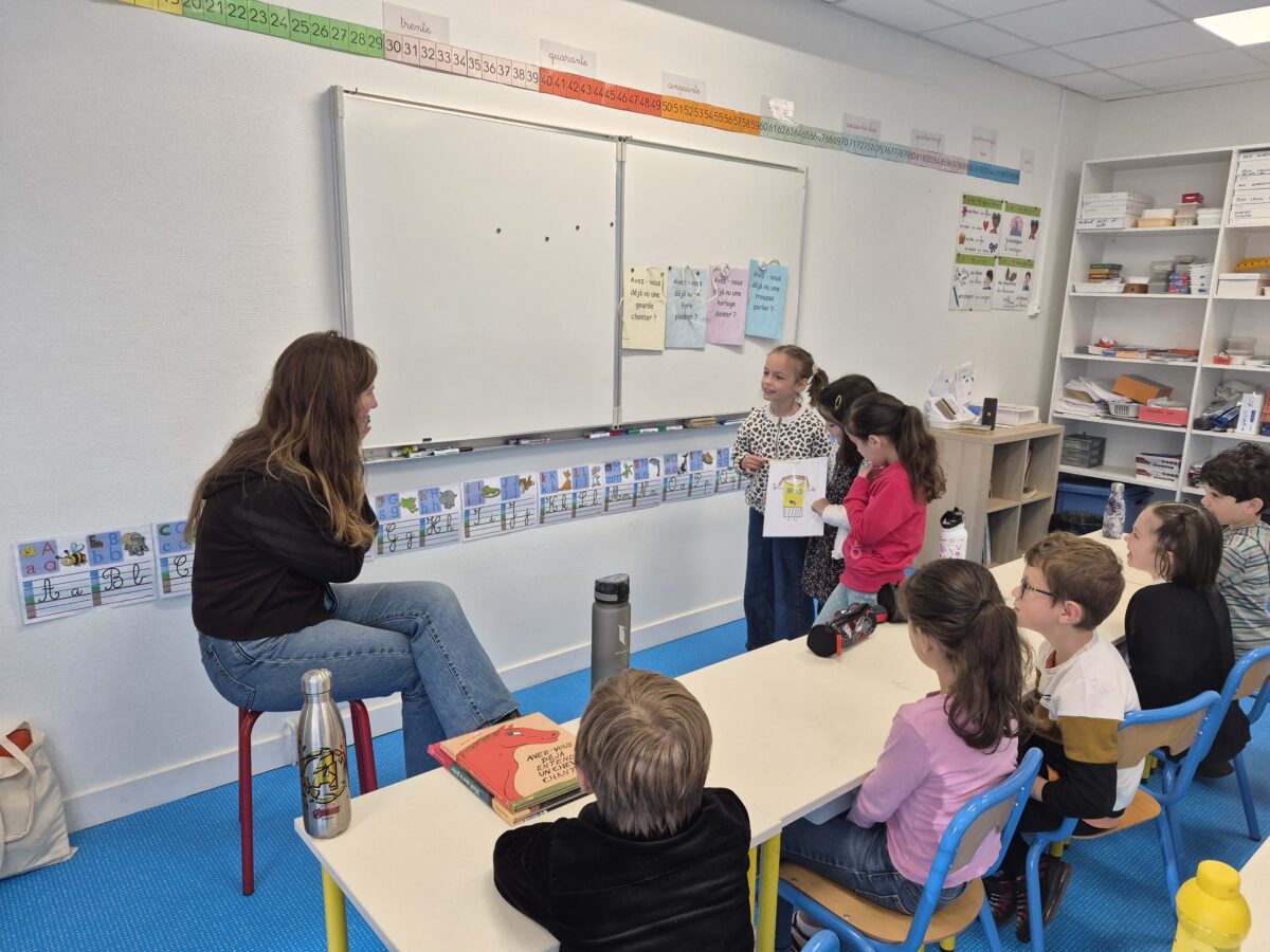 Vendredi, nous avons encore vécu une journée très dense. Le matin, l’autrice Pauline Barzilaï est venue nous rencontrer dans le cadre du salon du livre de Sucé sur Erdre. Elle a découvert ce que nous avions fabriqué pour l’exposition, puis elle a dessiné de nouveaux personnages avec les indications des enfants. Nous gardons ces dessins précieusement !